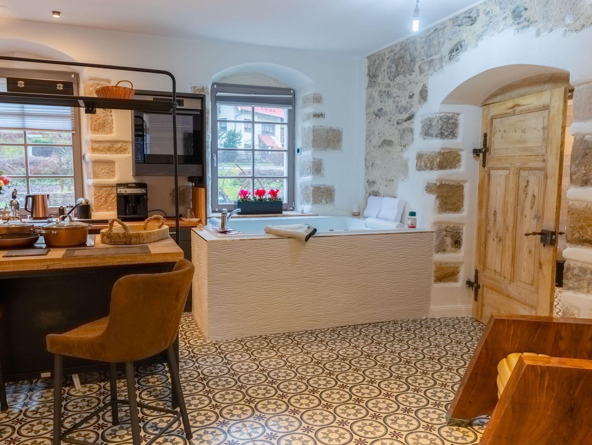• voll eingerichtete offene Küche mit Mikrowelle, Backofen, Ceranfeld, Toaster, Wasserkocher, Mixer, Kaffeemaschine und Kaffeevollautomat, Soda-Stream, Kühlschrank, Tee und Kaffee von Julius Meinel, Weinkühlschrank