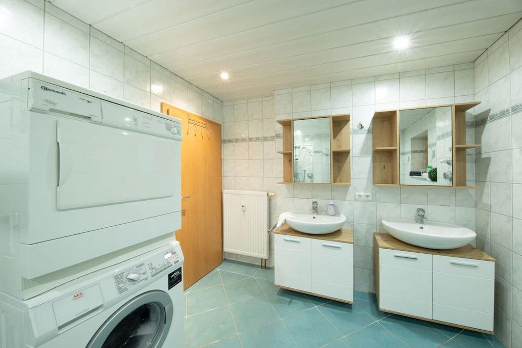 Kælderetage: (entre(, ), Køkken(kakkelovn, kogeplade, komfur, ovn, opvaskemaskine , køleskab, varme), stue / spisestue(, Fjernsyn, spisebord), soveværelse(, , dobbeltseng, radio), soveværelse(, , enkeltseng, enkeltseng, tremmeseng), badeværelse(, toilet, badekar, bruser, håndvask, varme)) , , , entre, guest toilet(, toilet, håndvask), Internetadgang, tørretumbler, vaskemaskine, varme, terrasse(havemøbler, baldakin), parkering, cykler til rådighed, strygebræt, strygejern, tørreskab