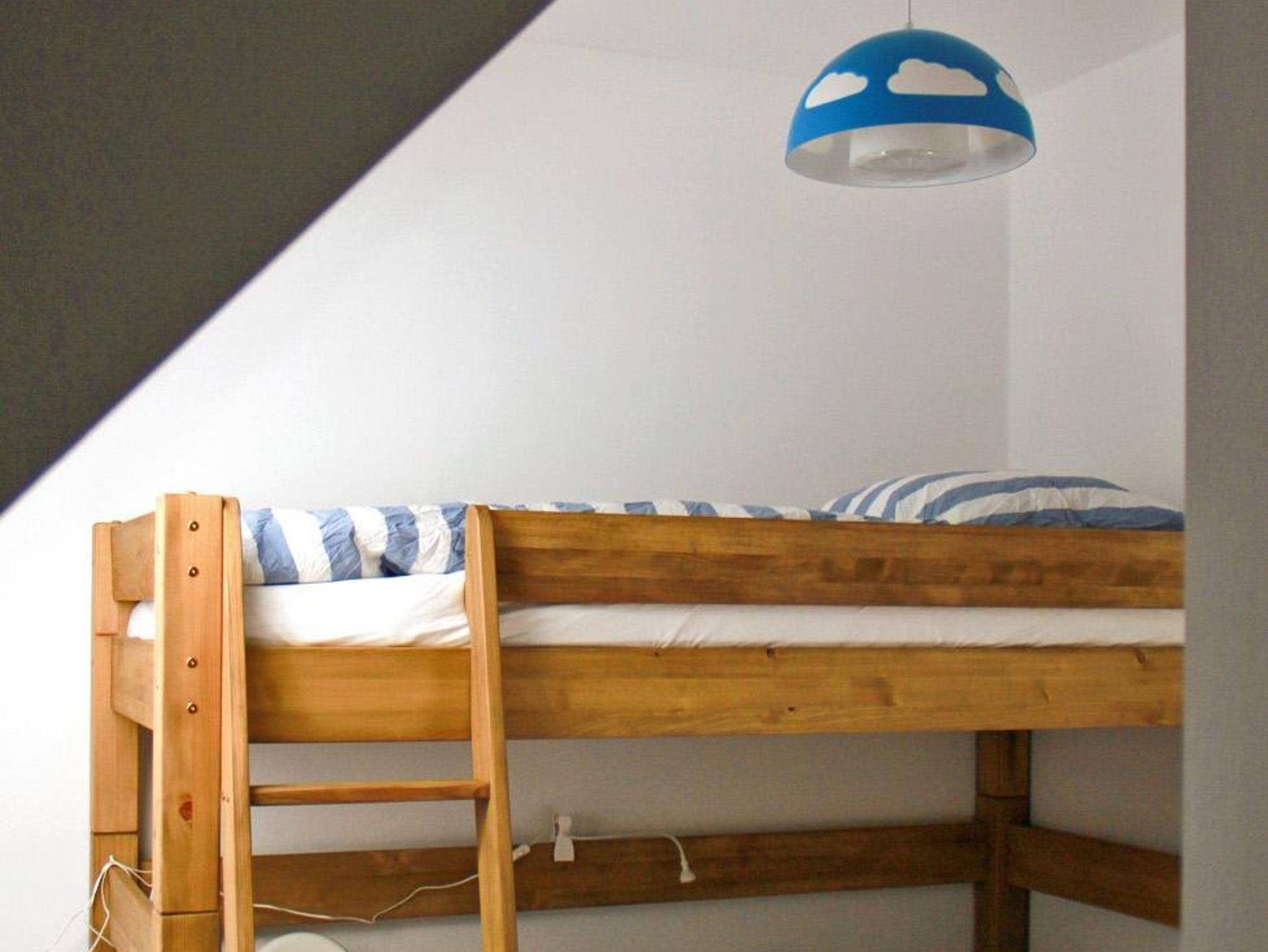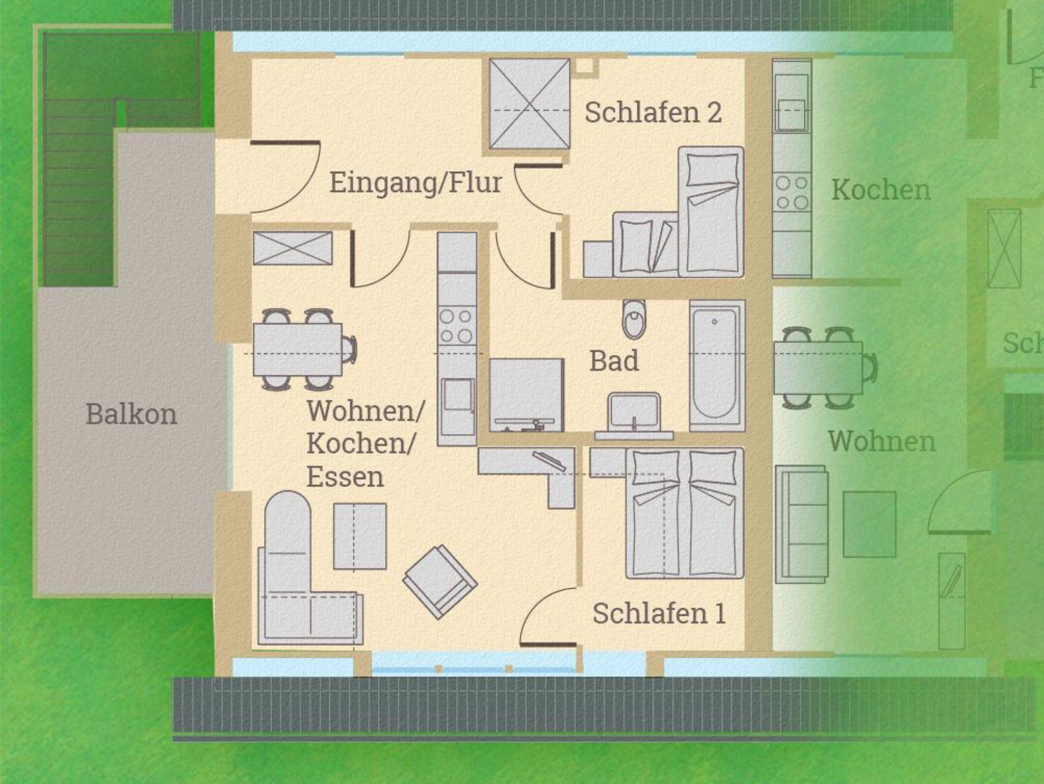 Die 73 Quadratmeter große Ferienwohnung befindet sich im Obergeschoss und ist für vier Personen geeignet, eine Aufbettung ist nicht möglich. Die Wohnung gliedert sich in eine Küche (ausgestattet mit Herd, Spüle, Geschirrspüler, Mikrowelle, Kühlschrank, Abzugshaube), einen Essbereich mit großem Esstisch mit 4 - 6 Stühlen und Kinderhochstuhl und den Wohnbereich mit Sofa, Tisch, Sideboard und TV. Die Wohnung hat zwei Schlafzimmer, eines mit Doppelbett und eines mit Doppelstockbett, ein Kinderbett ist vorhanden. Zur Wohnung gehört ein Balkon mit Tisch und 4 Stühlen sowie Poolliegen und Sonnenschirm.