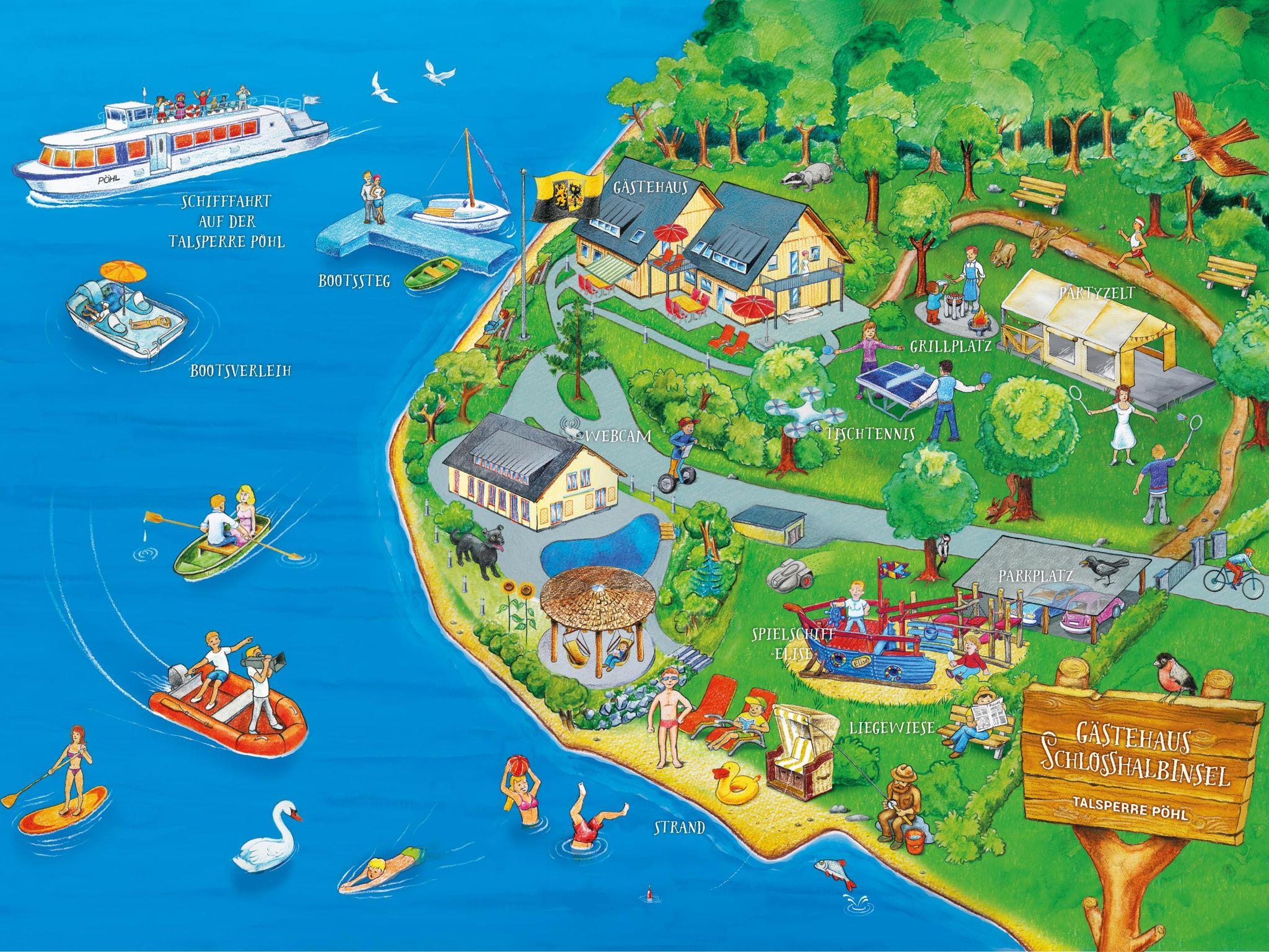 Direkt an der Talsperre Pöhl bietet das Gästehaus Schloßhalbinsel vier moderne, helle Ferienwohnungen in exklusiver Lage an.