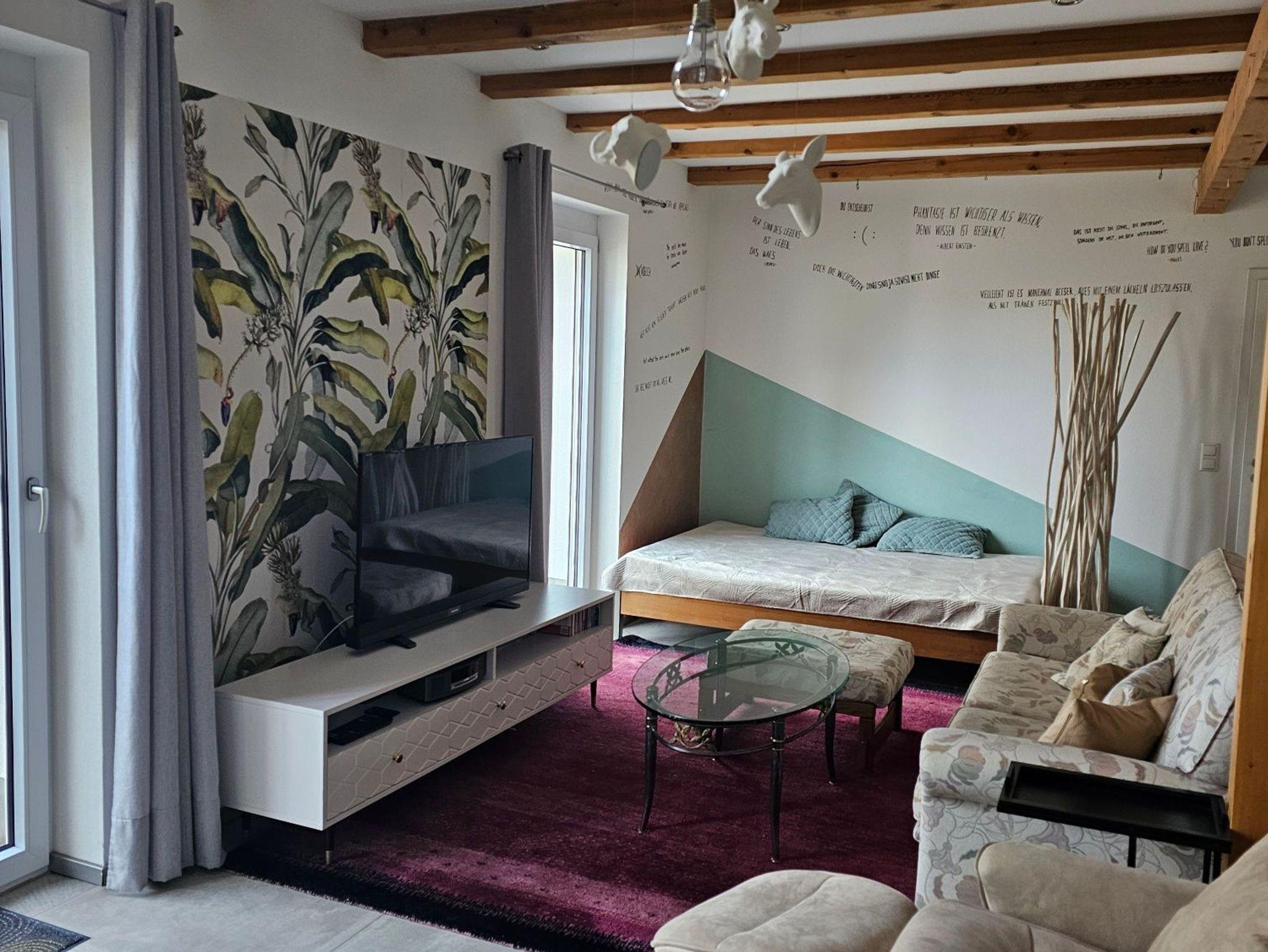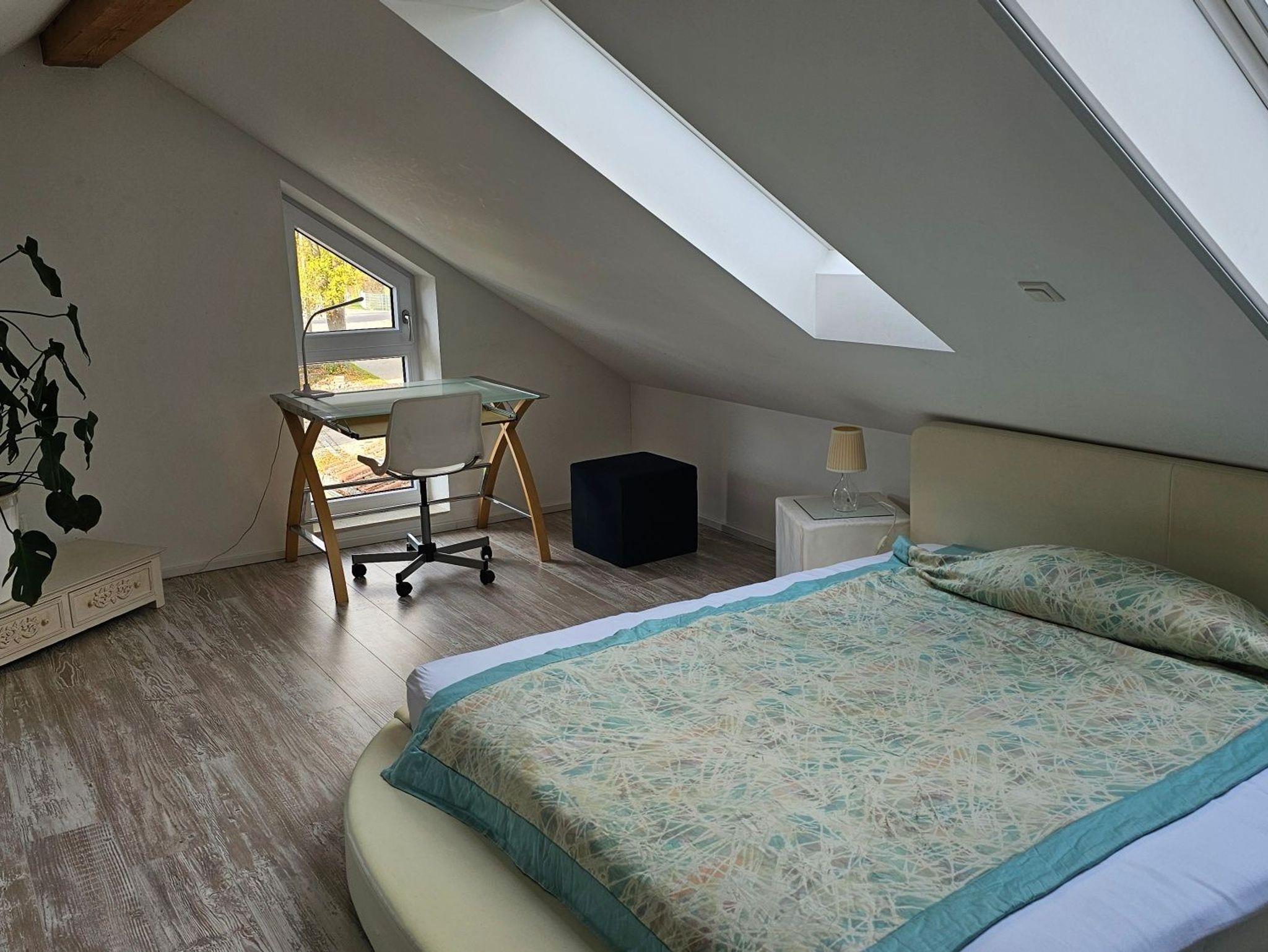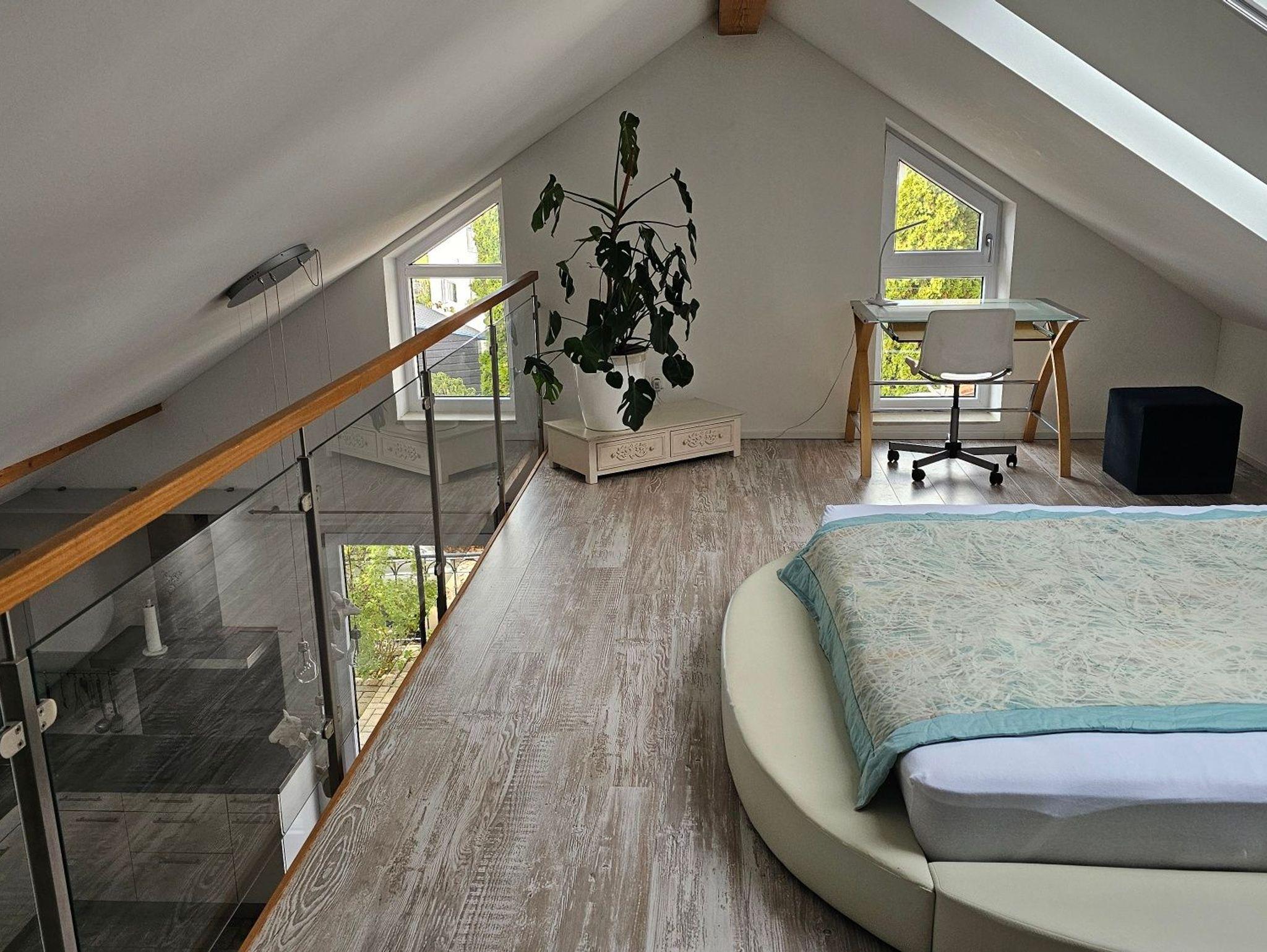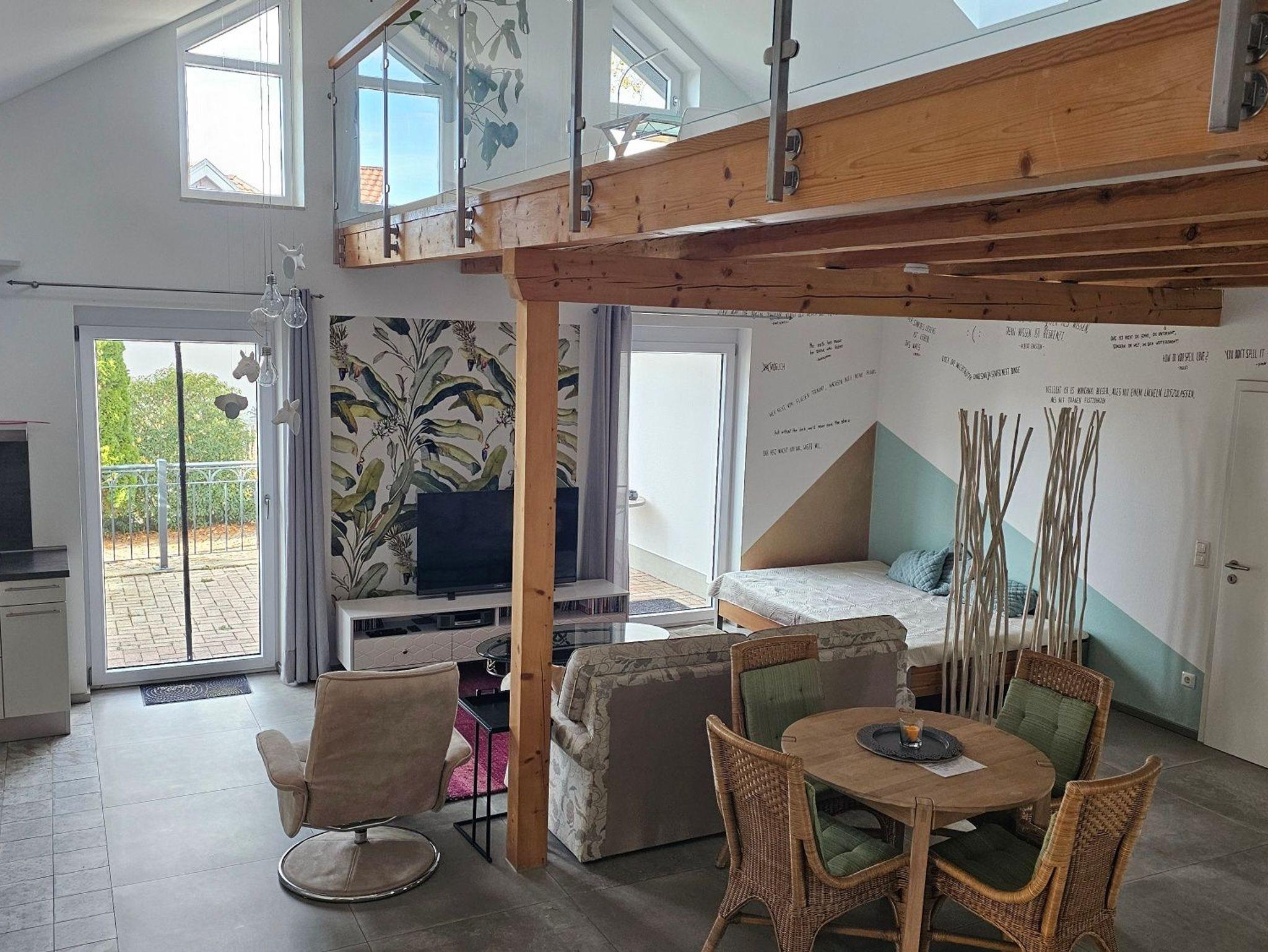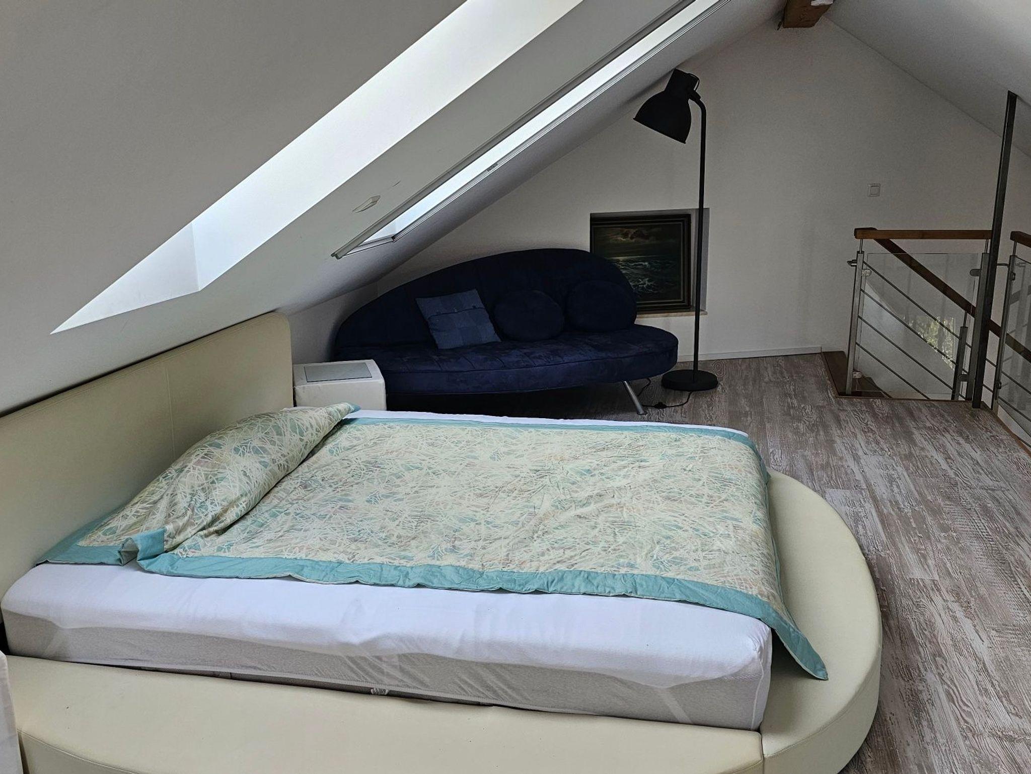 Das Schlafzimmer ist etwas ganz Besonderes: das ehemalige Heulager wurde zur gemütlichen Empore ausgebaut, auf der heute ein komfortables Doppelbett steht - ideal für Pärchen oder Alleinreisende. Die offene Bauweise mit den alten Balken verleiht dem Haus eine urige und charmante Atmosphäre.