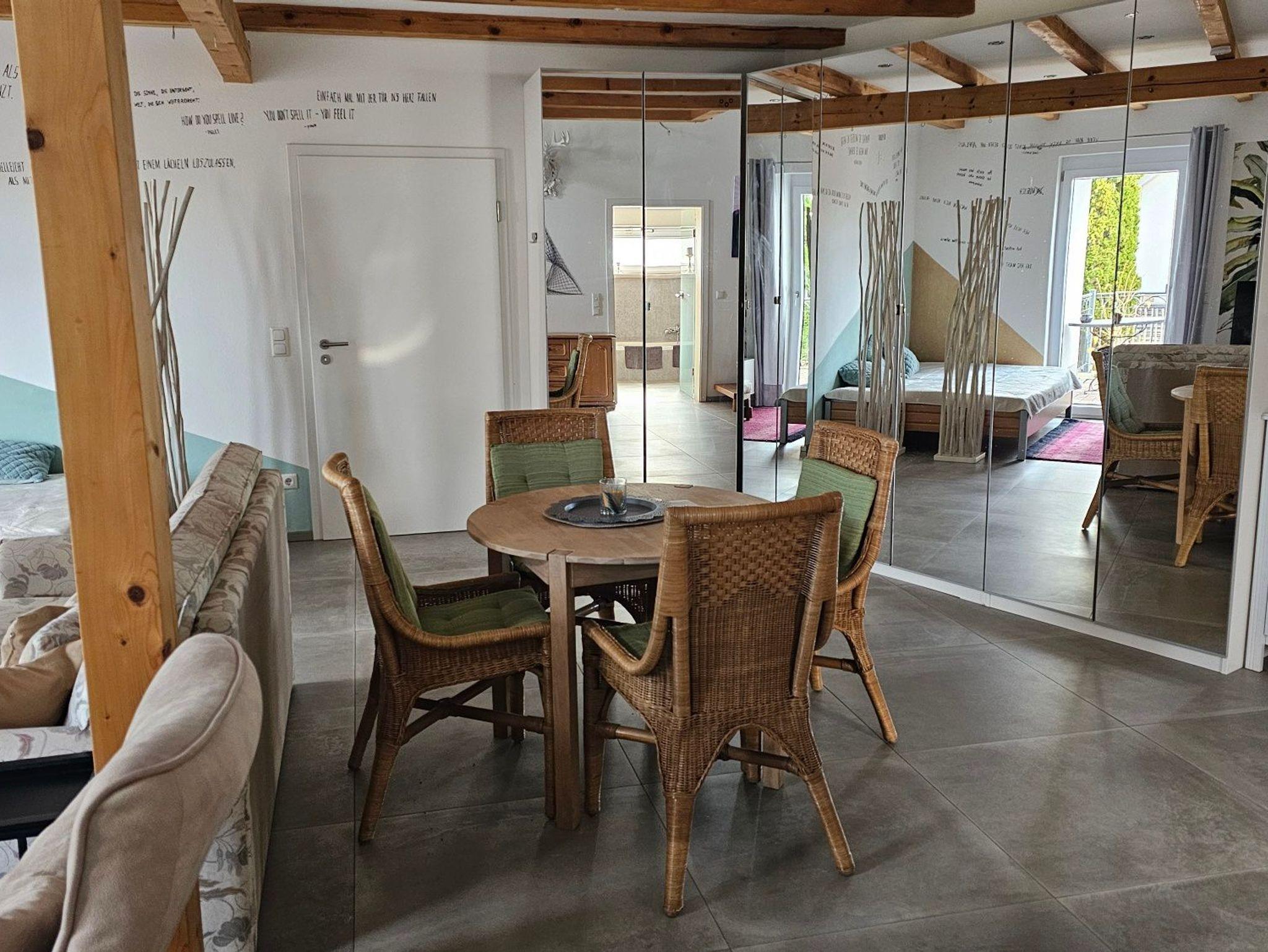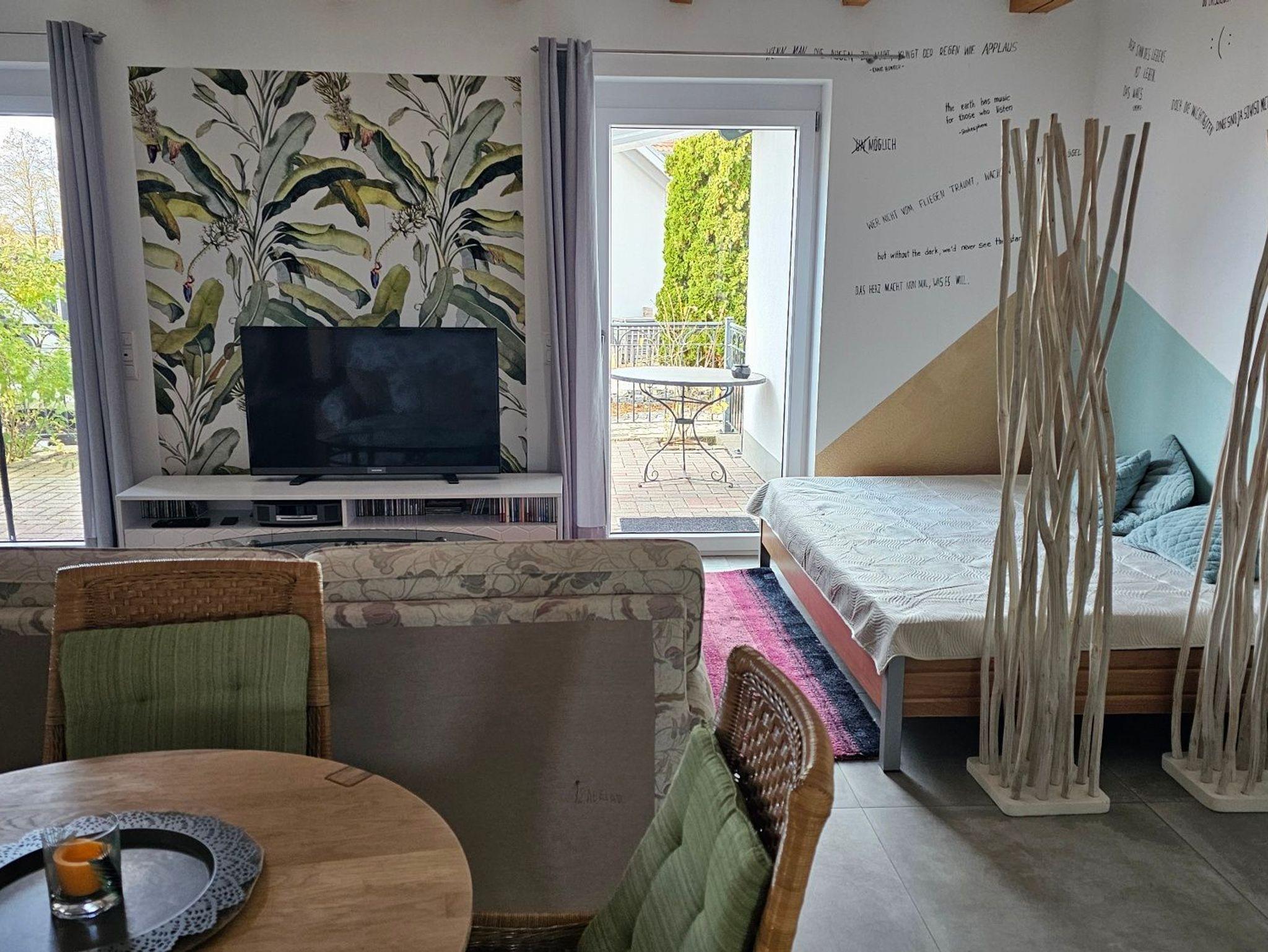 Draußen lädt ein Sitzplatz auf der Terrasse zum Entspannen ein - ob beim Kaffee und beim Glas Wein am Abend.