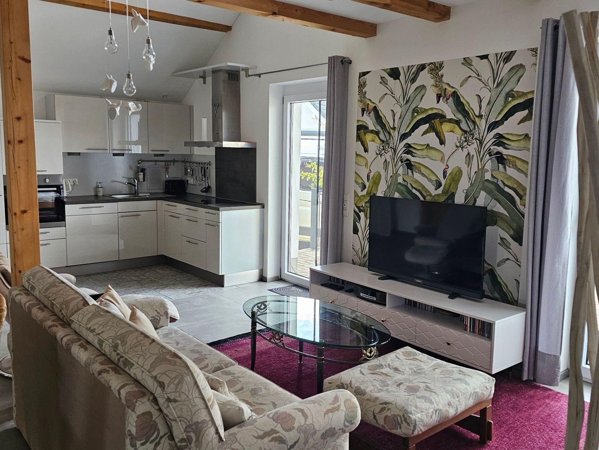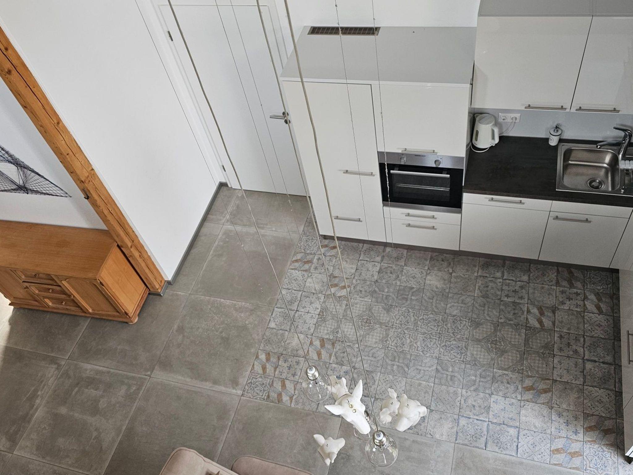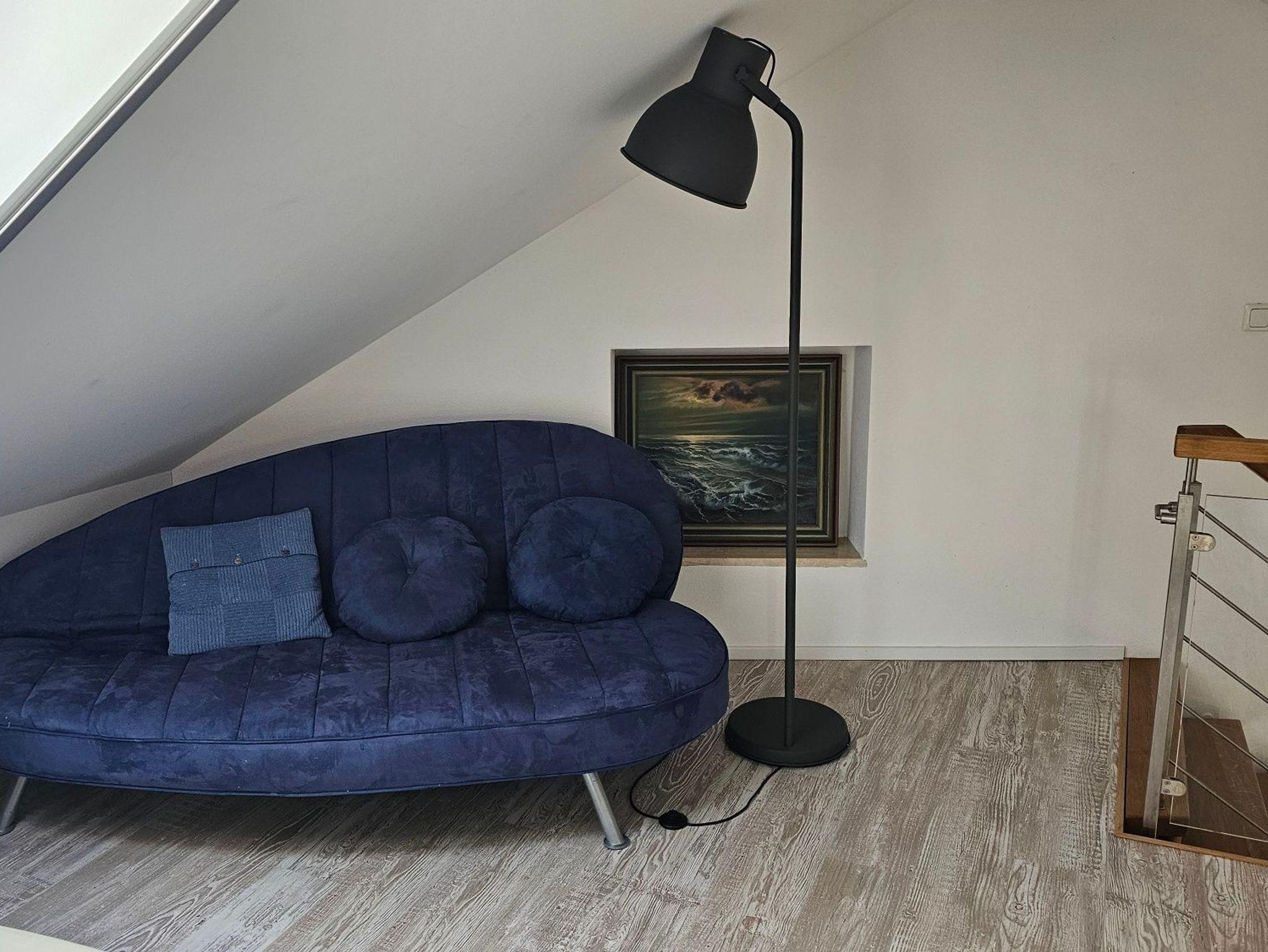 Im Erdgeschoss befinden sich der Wohnbereich mit Sitzmöglichkeiten und einem Schlafsofa, eine offene Küche, sowie das Badezimmer mit Badewanne.