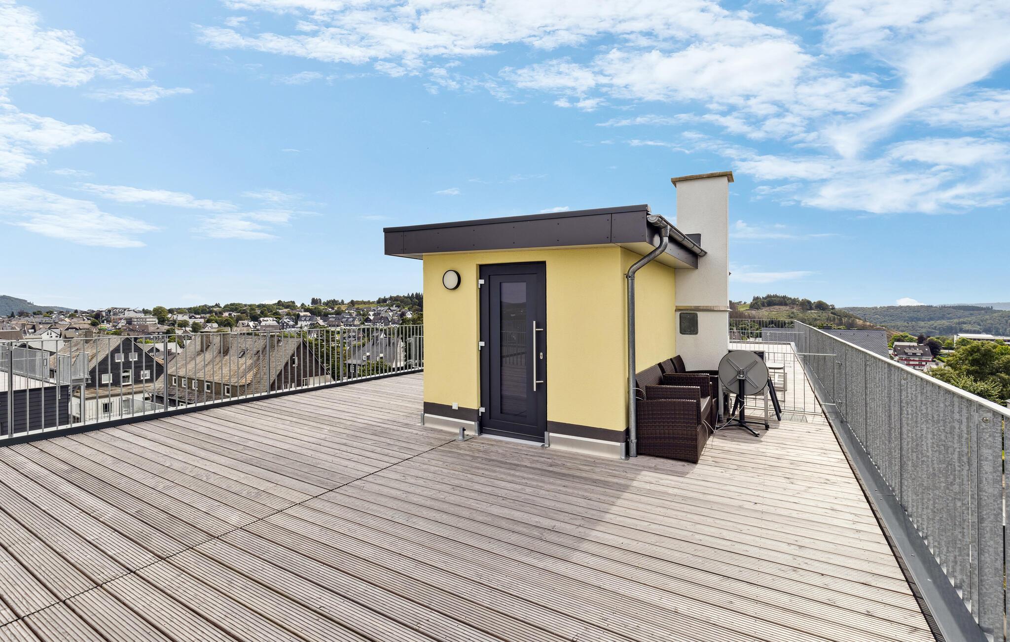 Men man kan ikke bare tilbringe skønne timer i ferielejligheden. På varme sommerdage er tagterrassen og altanen med havemøbler et vidunderligt sted at slappe af. Her kan I få en afslappet morgenmad og tilberede lækre måltider på grillen. Nyd panoramaudsigten over bjergene og landskabet fra tagterrassen.