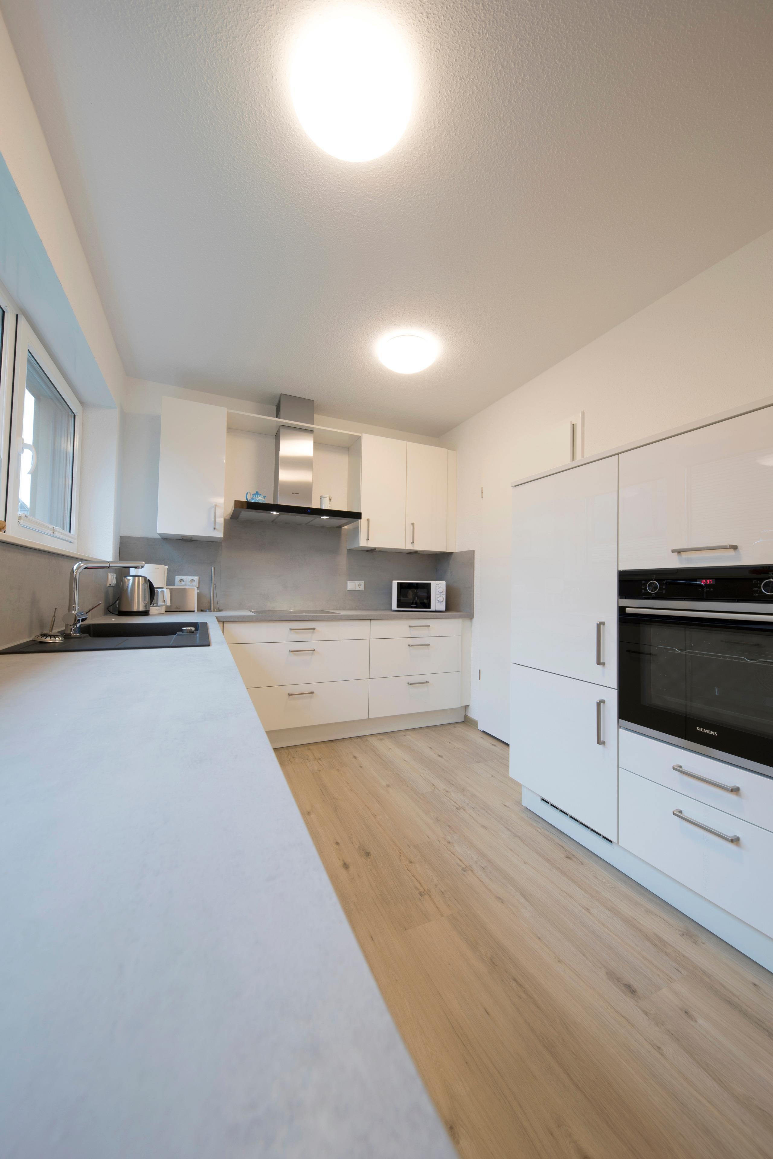 • offene, moderne, komplett ausgestattete Wohnküche mit gemütlichem Sofa, großem Smart-TV und Balkon