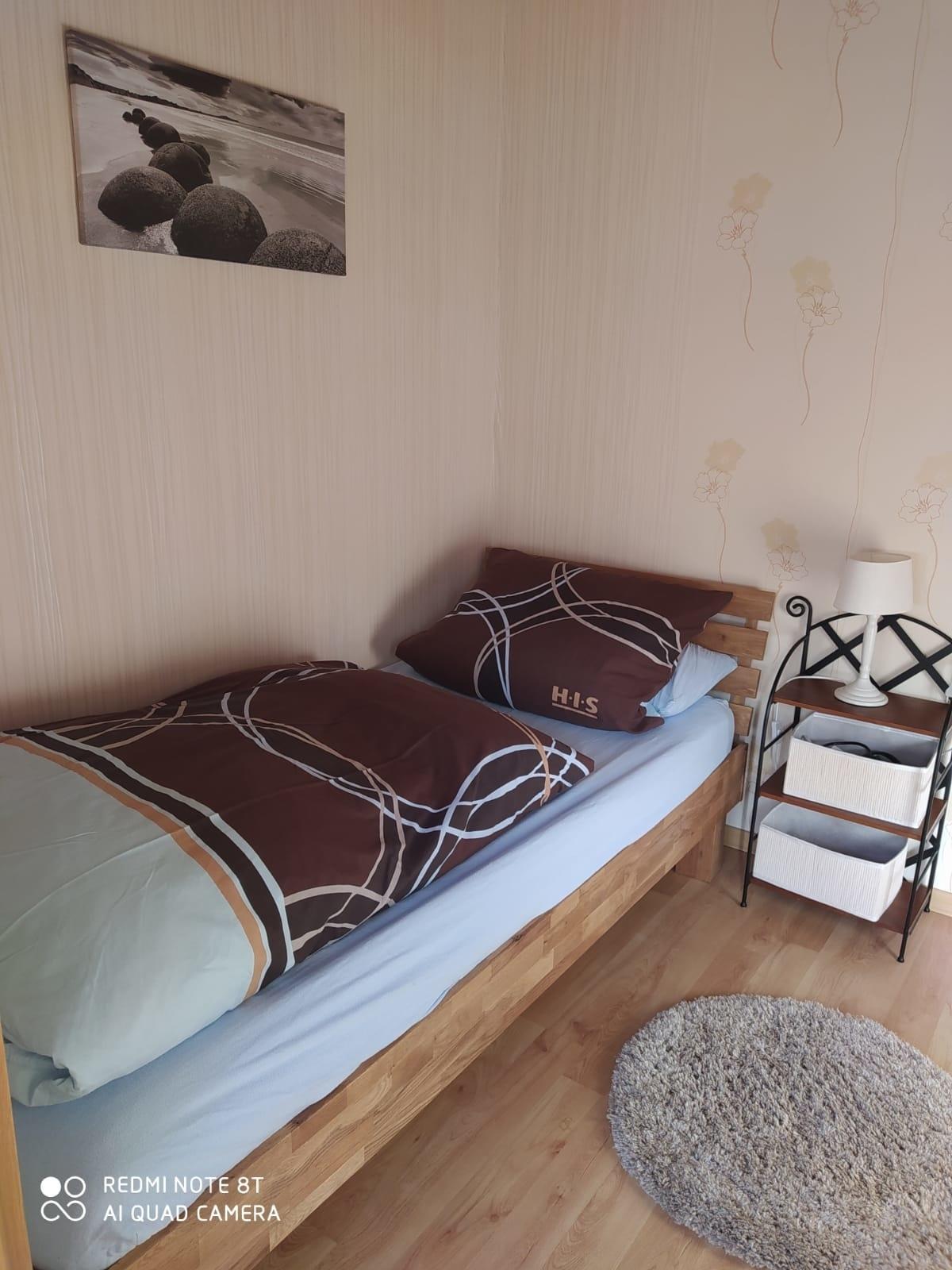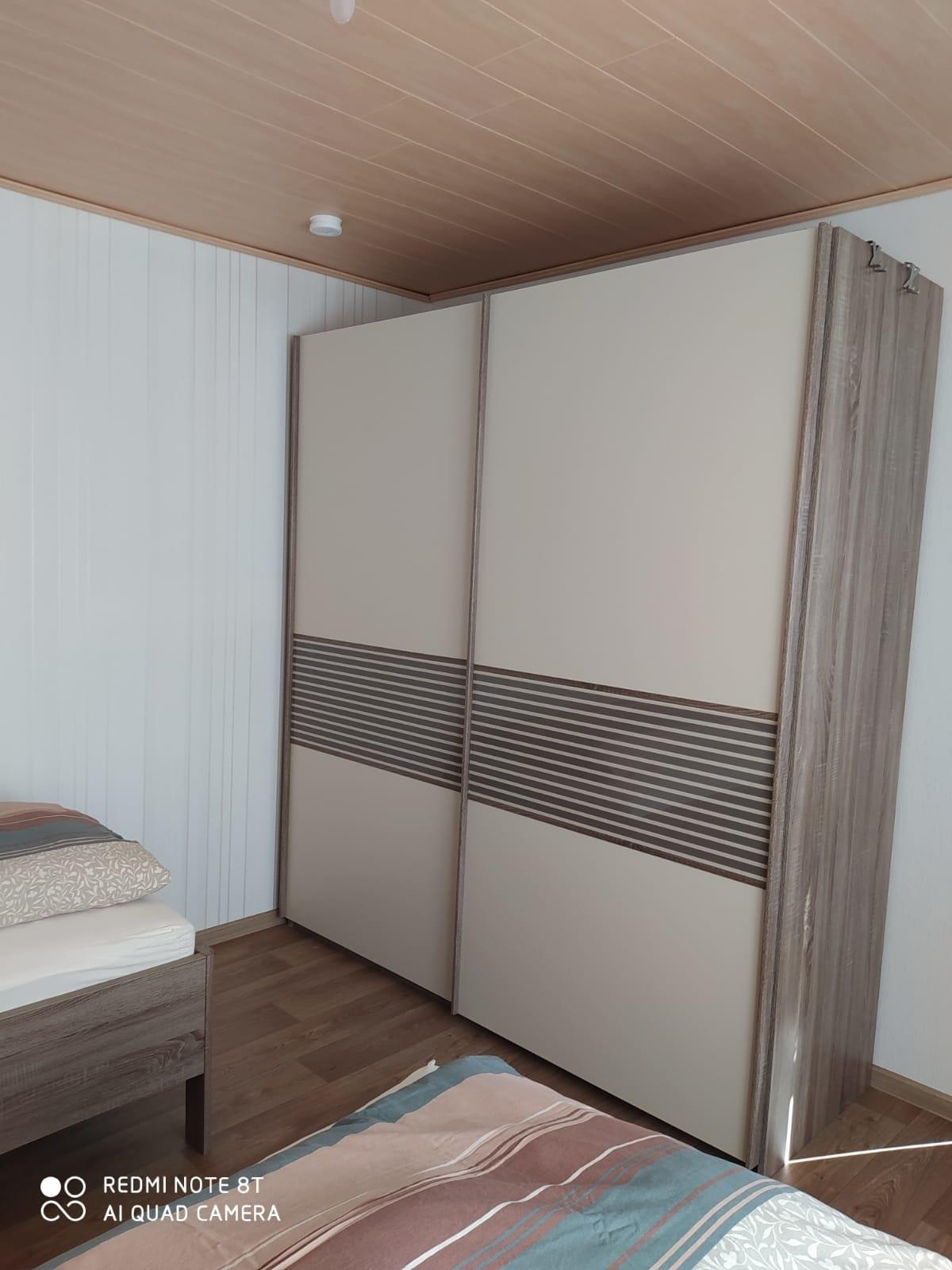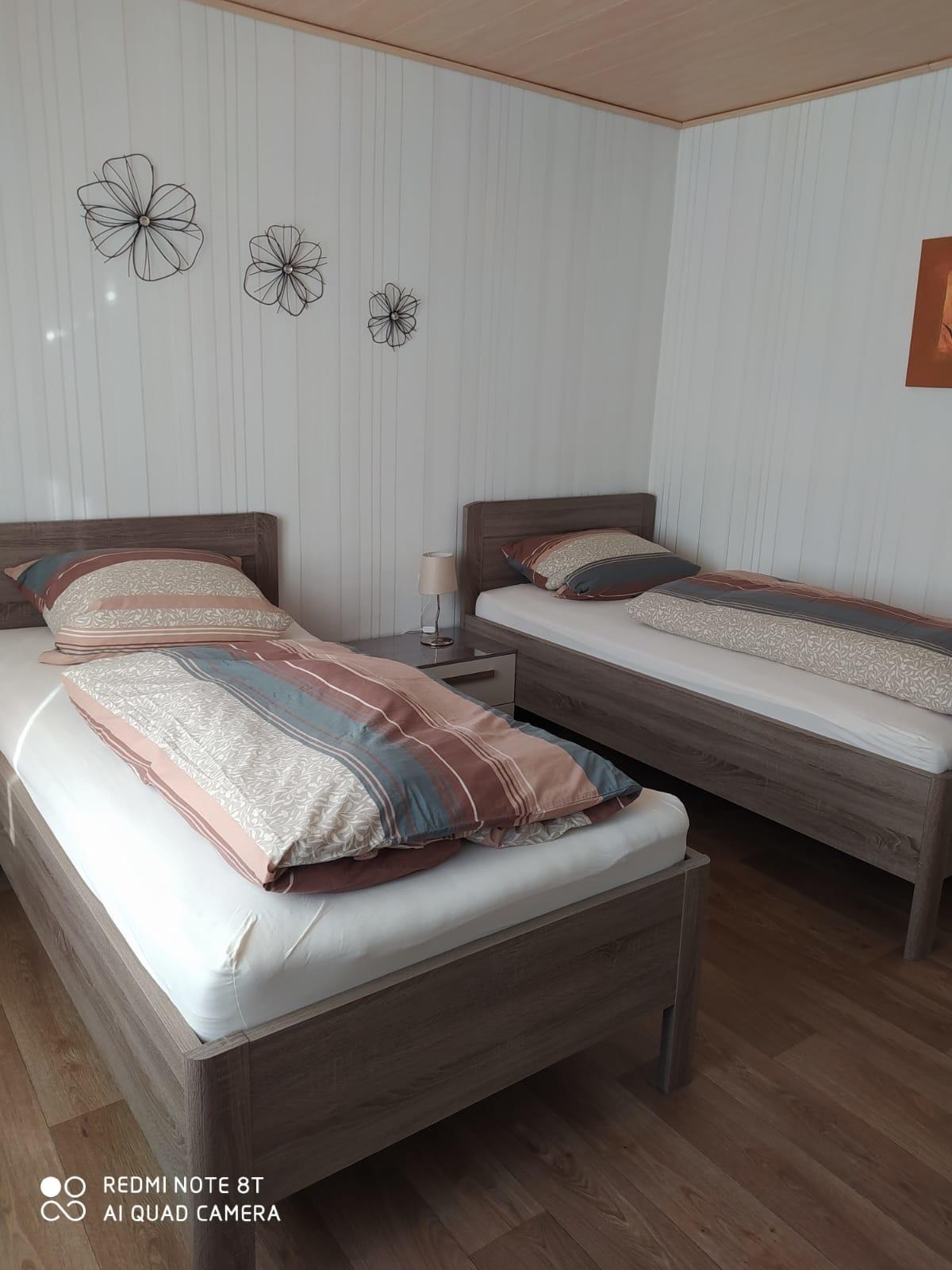 Kinderbett und Hochstuhl können auf Wunsch dazu gestellt werden. Die Betten im Schlafzimmer können auch als Doppelbett genutzt werden.