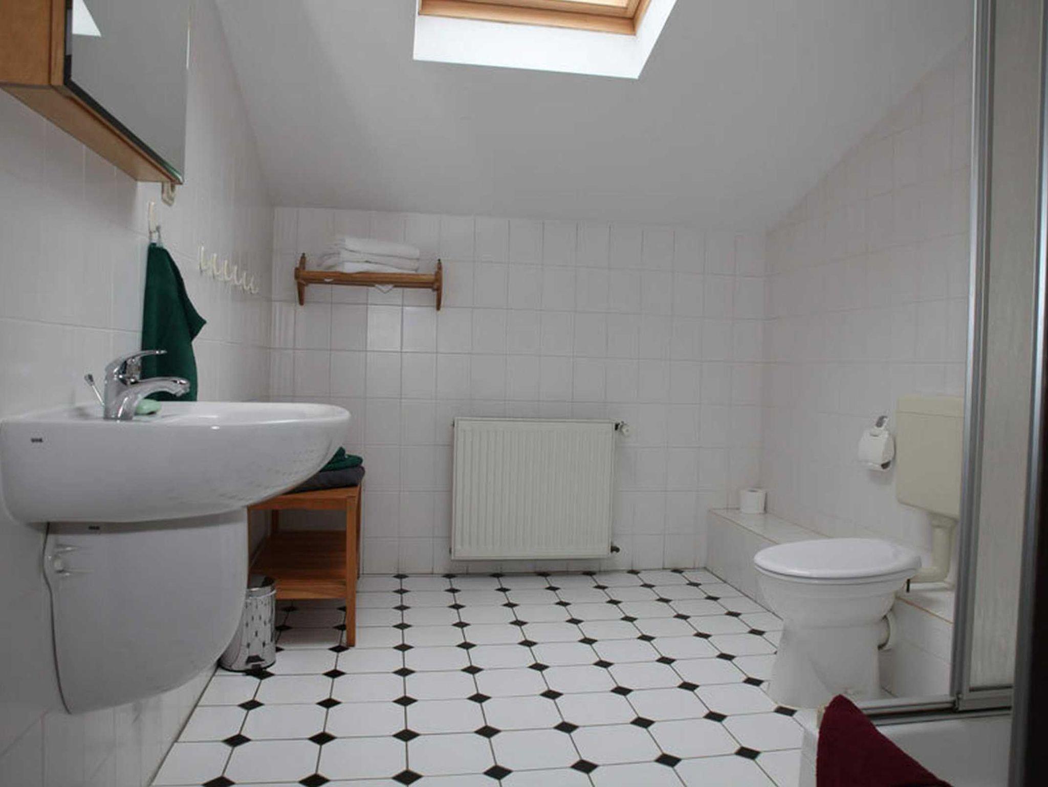 Das Bad hat Toilette mit Dusche. Die Fußböden in allen Räumen bestehen aus Terracottafliesen.