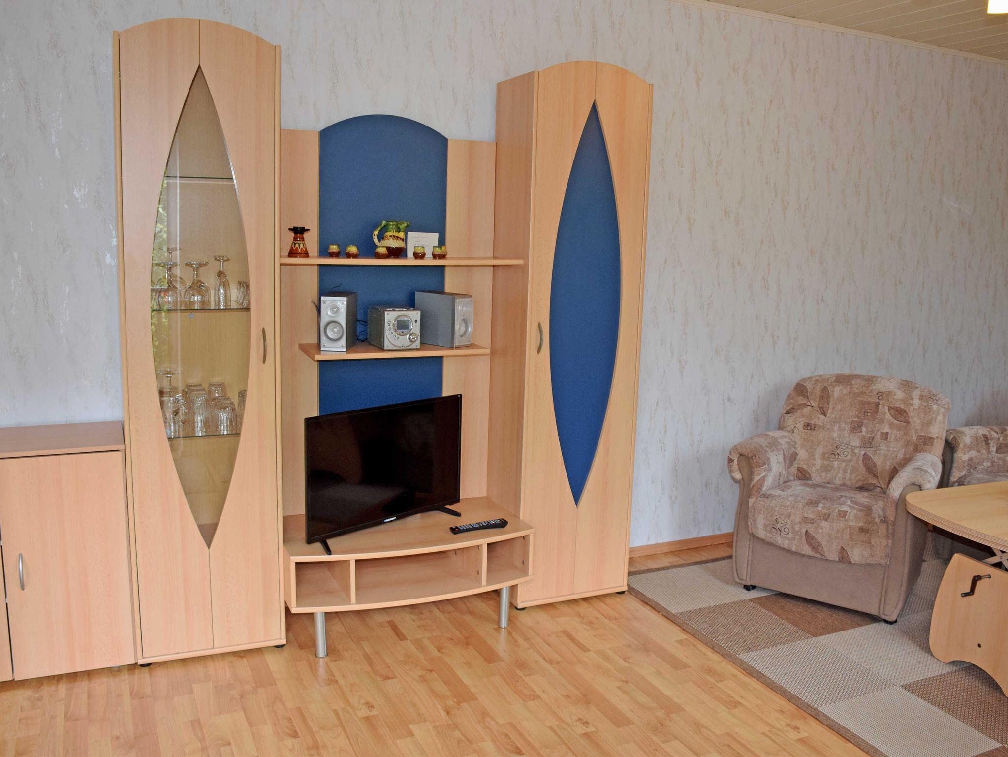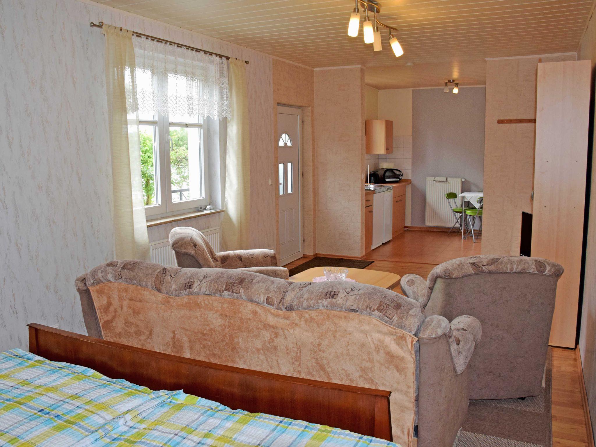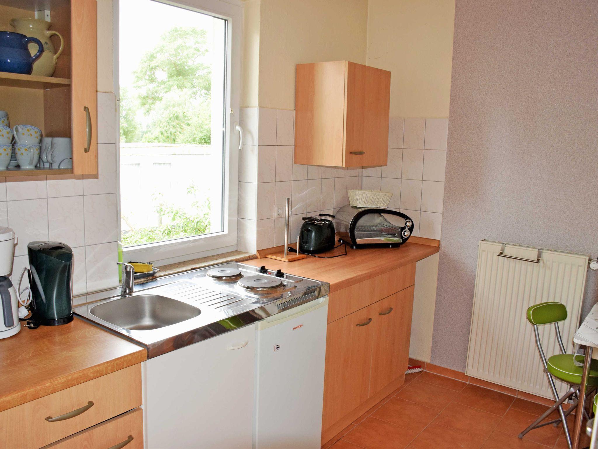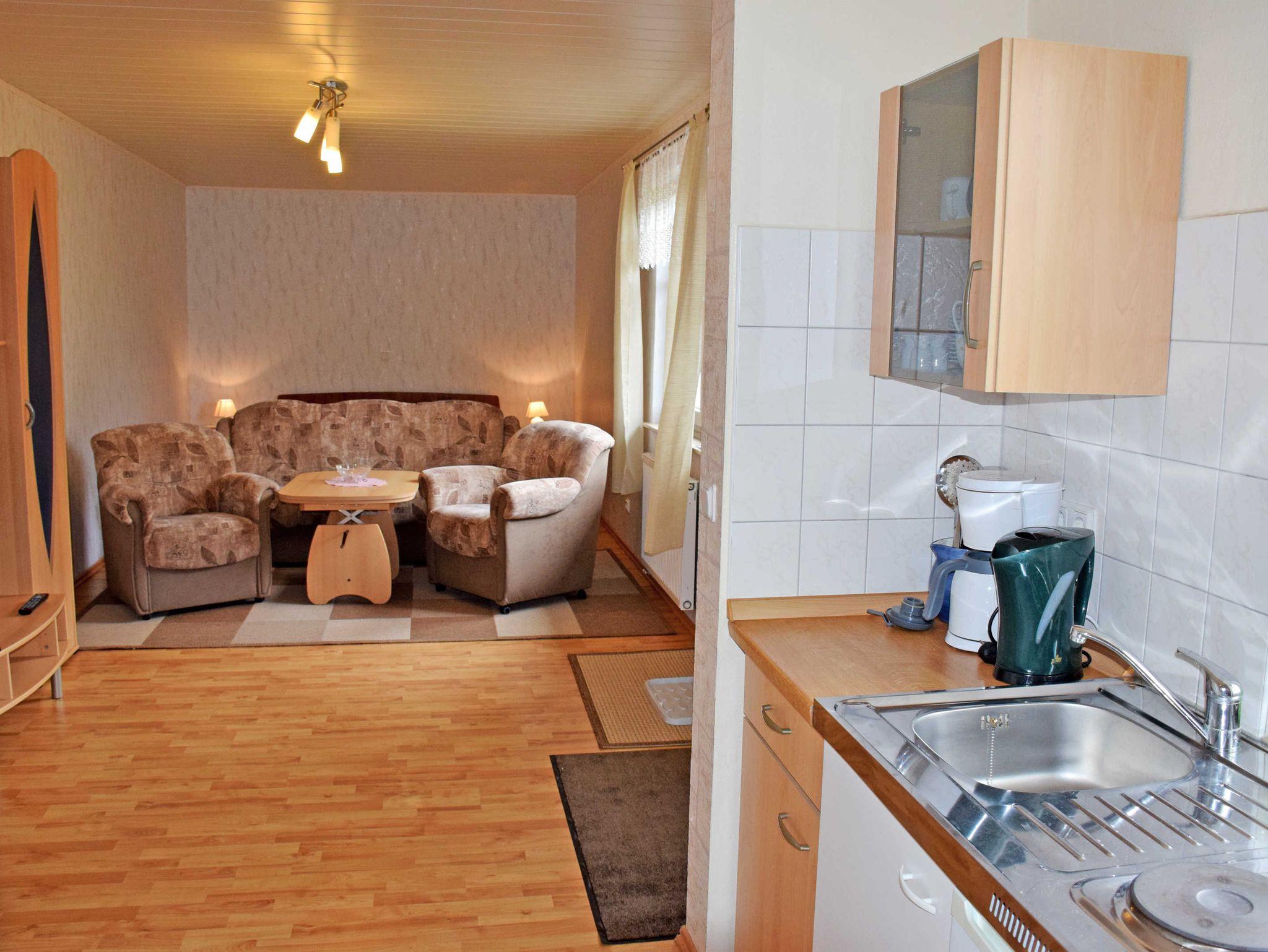 Unsere Ferienwohnung im Erdgeschoss ist ca. 30 qm groß, hat Platz für maximal 3 Gäste und wurde liebevoll und modern eingerichtet. Sie verfügt über einen separaten Eingang. In dem Wohnbereich befinden sich eine Sitzcouch mit Tisch und Sessel, Leselampe, TV-Gerät und eine Musikanlage. Die Küchenzeile im Wohnbereich ist mit einem Herd, Wasserkocher, Kaffeemaschine, Toaster und Kühlschrank ausgestattet. Dazu gehört auch ein kleiner Esstisch mit Stühlen.