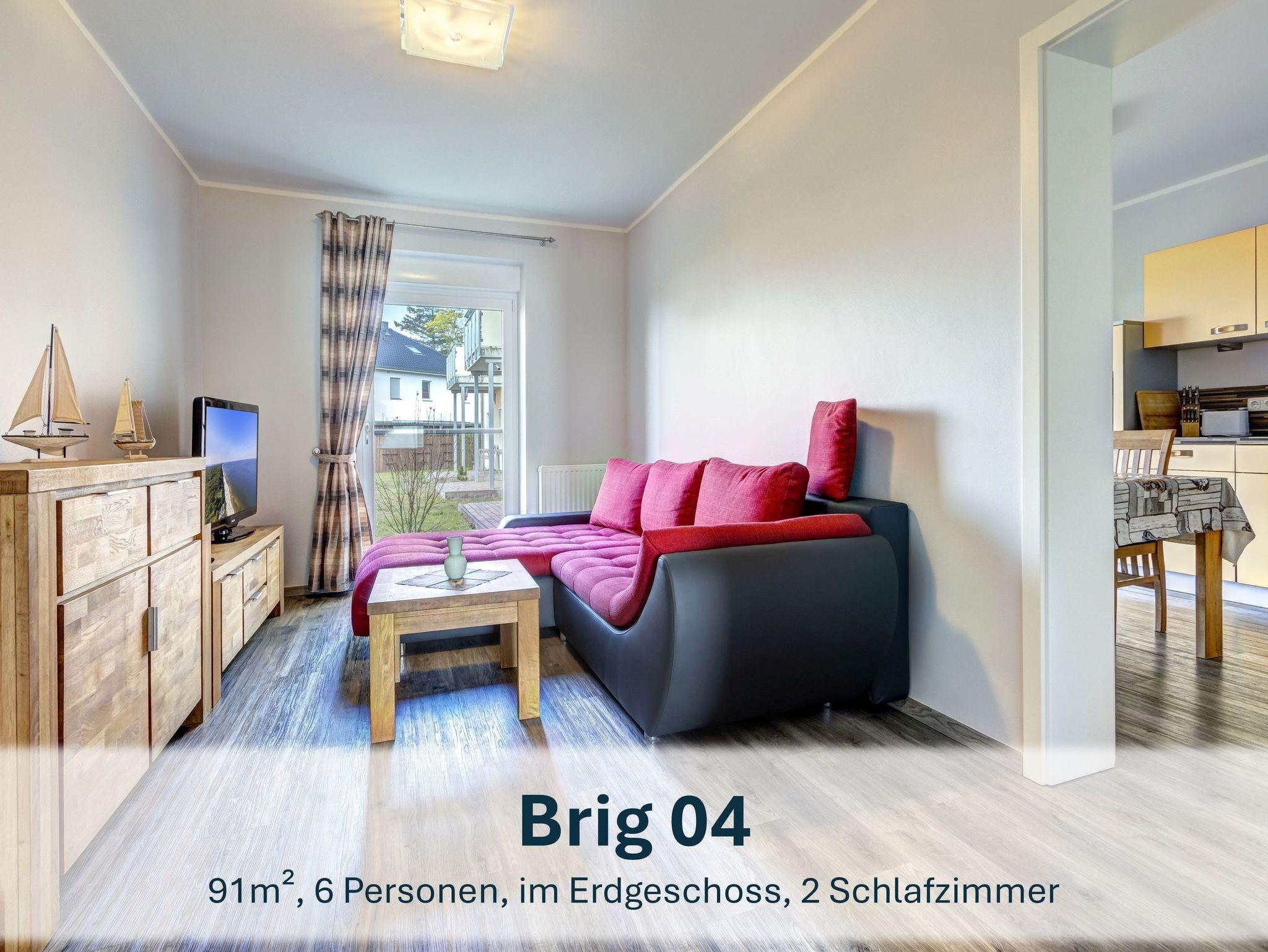 Die Erdgeschosswohnung „Brig 04“ bietet auf 91m² Platz für bis zu 5Erwachsene und ein Kleinkind. Sie verfügt über zwei Schlafzimmer ? eines mit Doppelbett, eines mit zwei Einzelbetten ? sowie einen großzügigen Wohnbereich mit Schlafcouch, Flat-TV und WLAN. Die offene Küche ist voll ausgestattet mit Herd, Backofen, Spülmaschine, Kühlschrank mit Gefrierfach, Mikrowelle, Kaffeemaschine, Wasserkocher und Toaster. Das moderne Bad bietet eine ebenerdige Dusche. Eine möblierte Terrasse lädt zum Verweilen im Freien ein. Wäschepakete, Kinderreisebett und Hochstuhl sind zubuchbar. Ein wohlerzogenes Haustier (keine Katzen oder Listenhunde) ist auf Anfrage willkommen. Die Kaution von 150€ ist mit der Restzahlung fällig und wird nach ordnungsgemäßer Rückgabe erstattet.