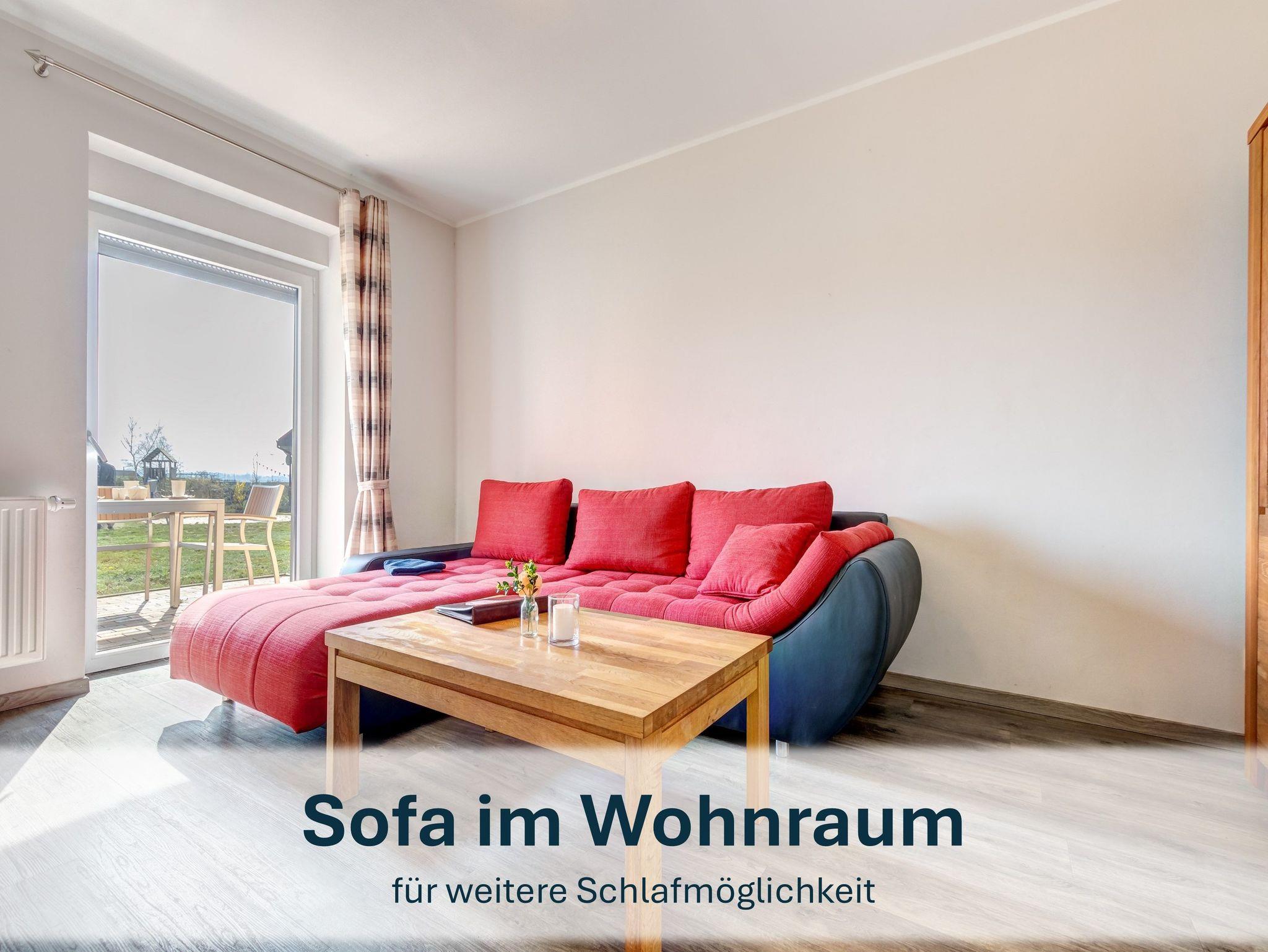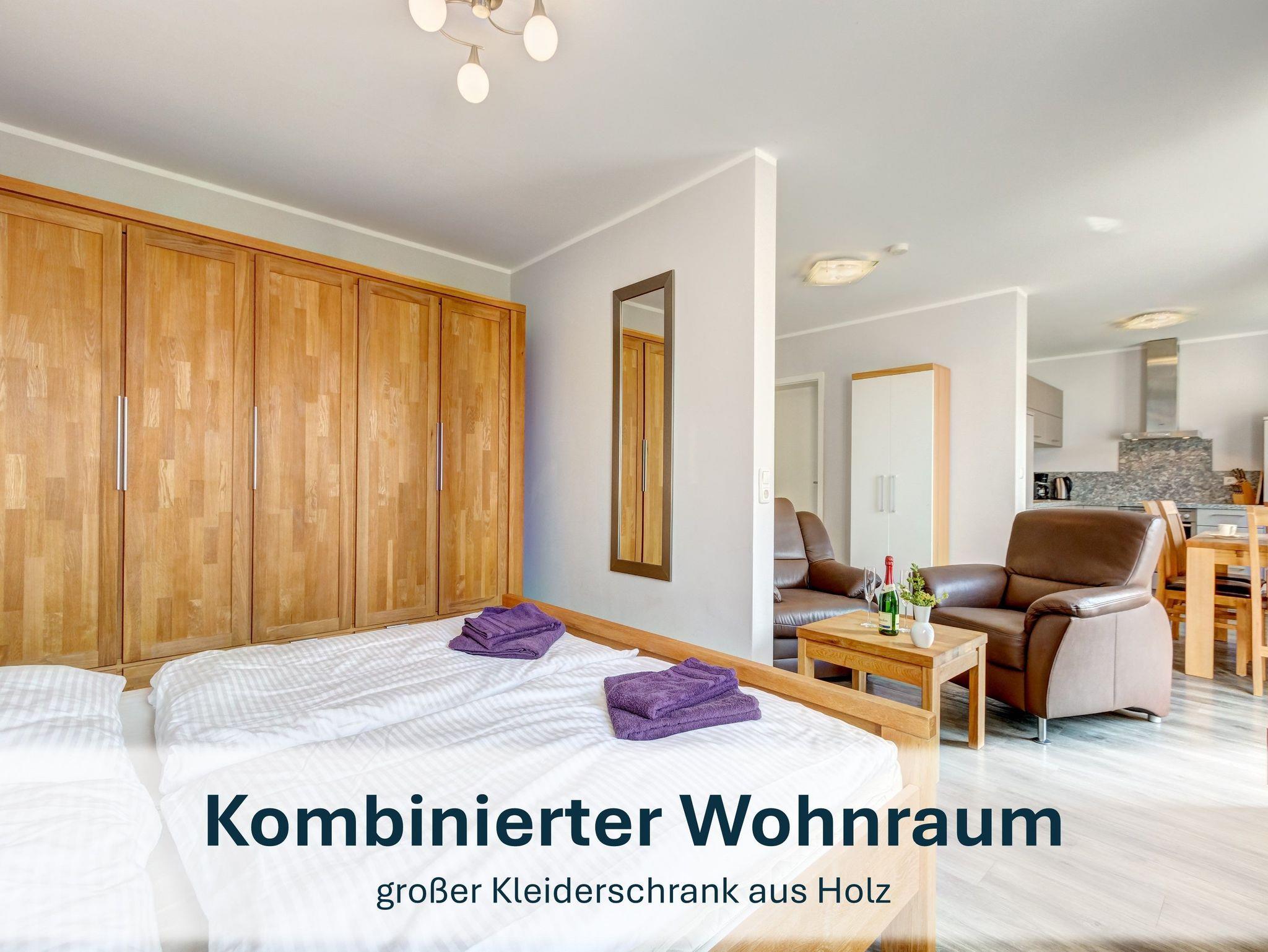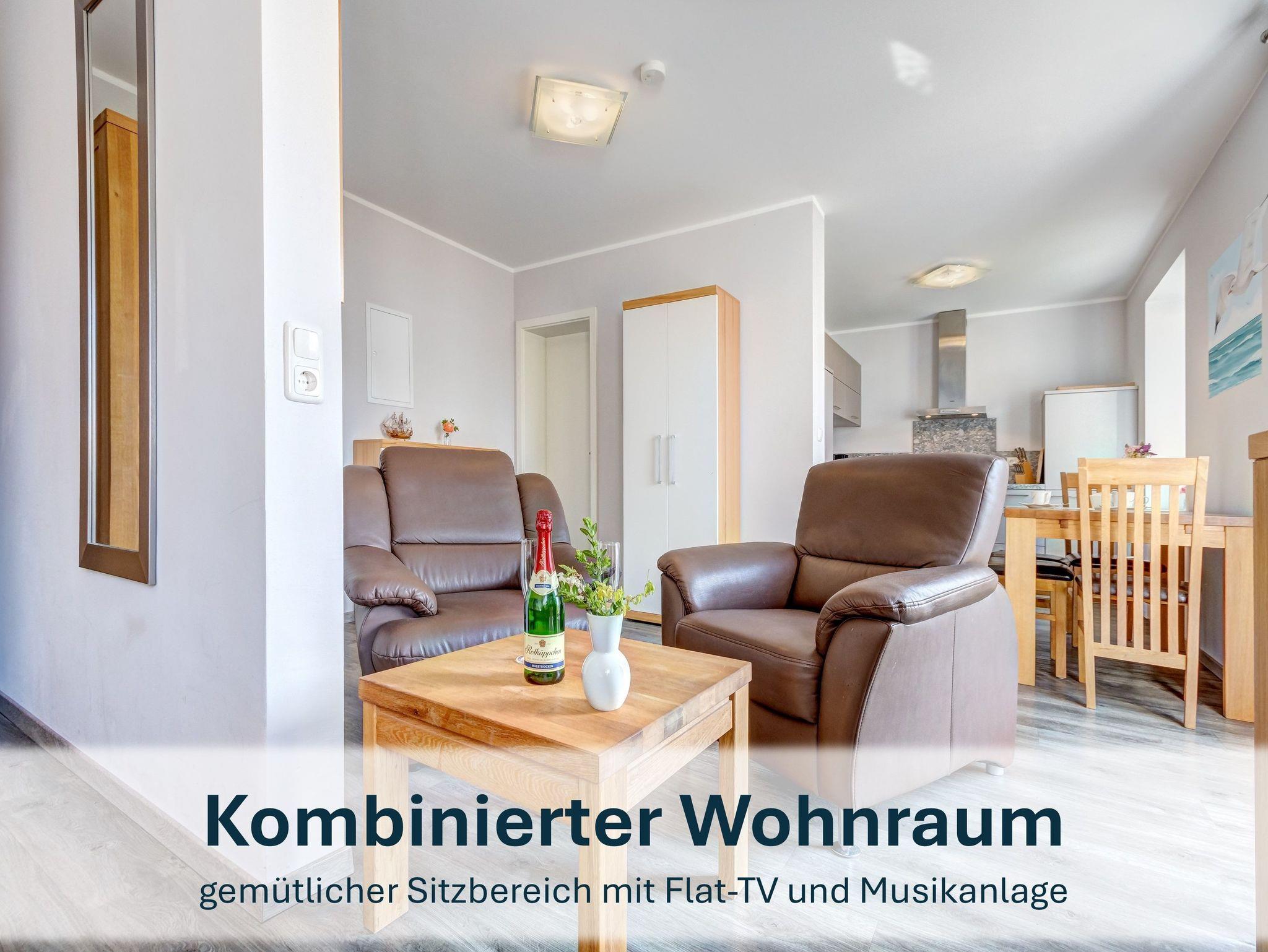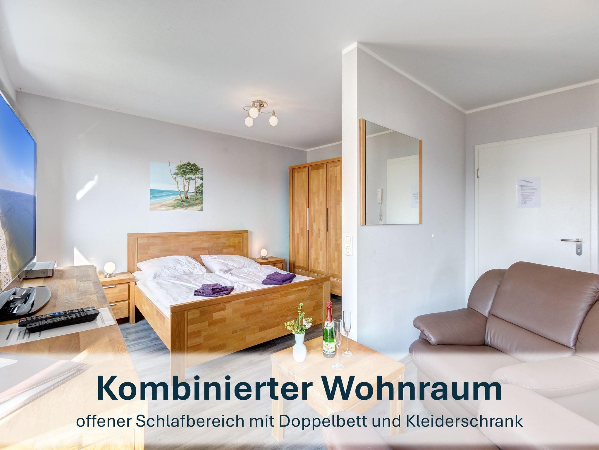 Für Paare oder Einzelreisende bietet die Wohnung „Jolle 16“ im Obergeschoss eine charmante Rückzugsmöglichkeit auf 43m². Der kombinierte Wohn- und Schlafbereich, eine kleine Küche und der möblierte Balkon schaffen eine gemütliche Atmosphäre für entspannte Tage.
