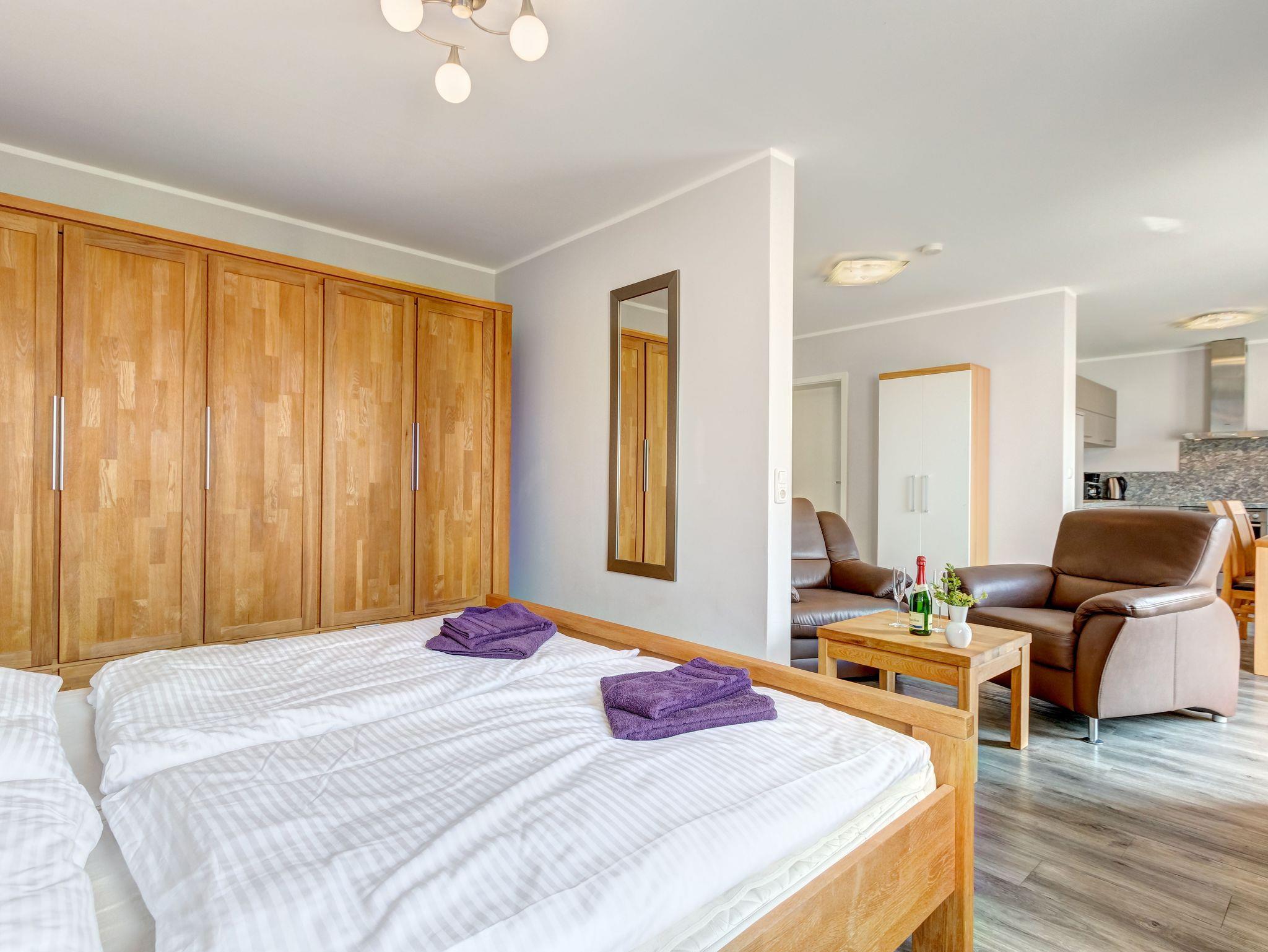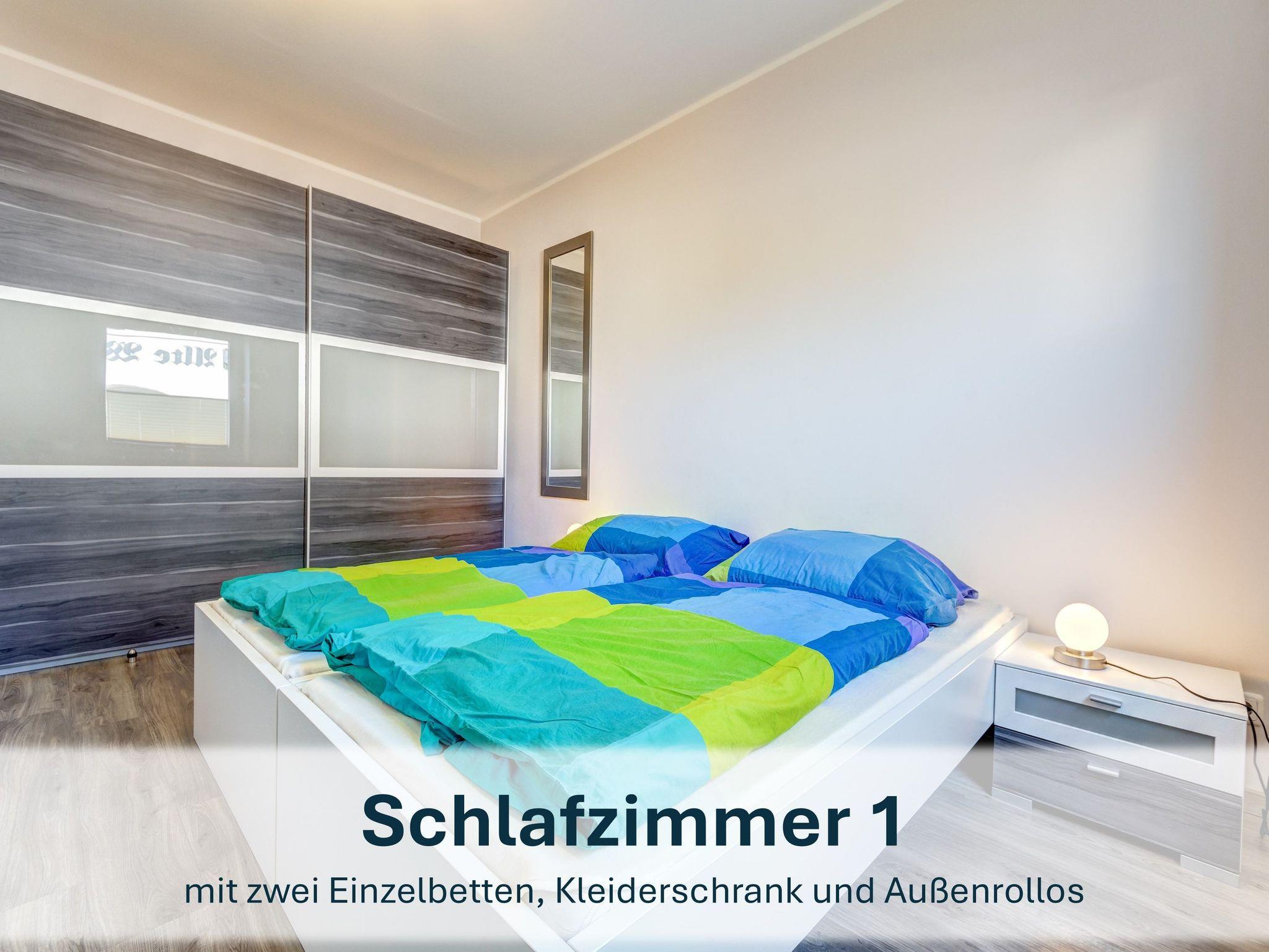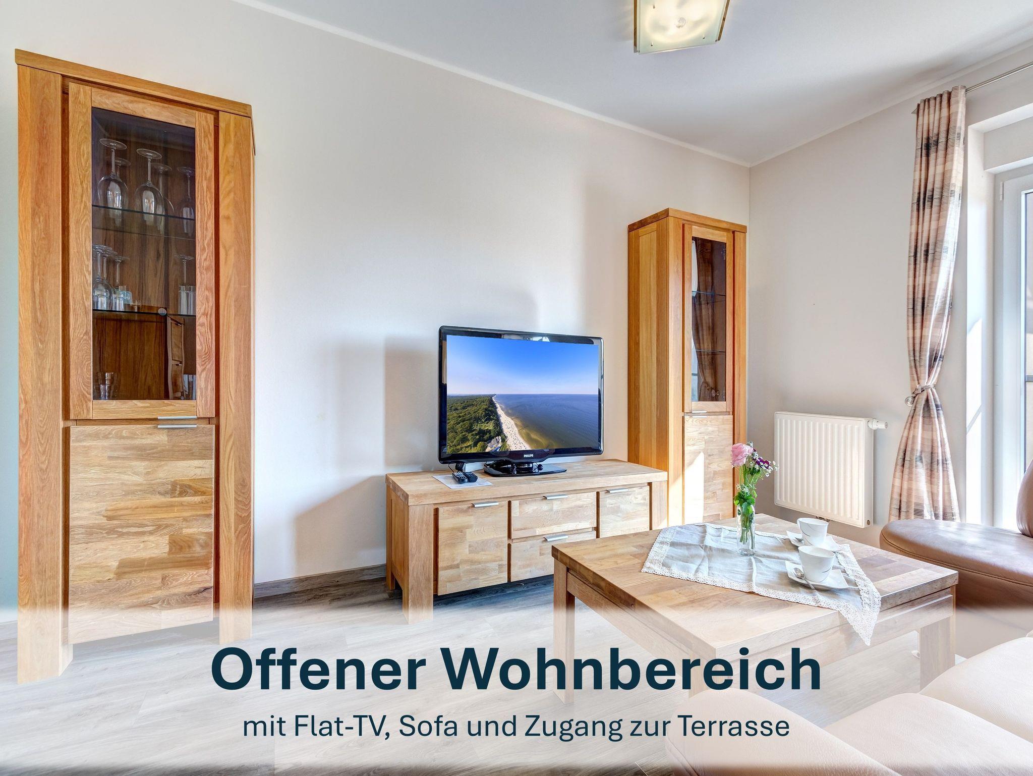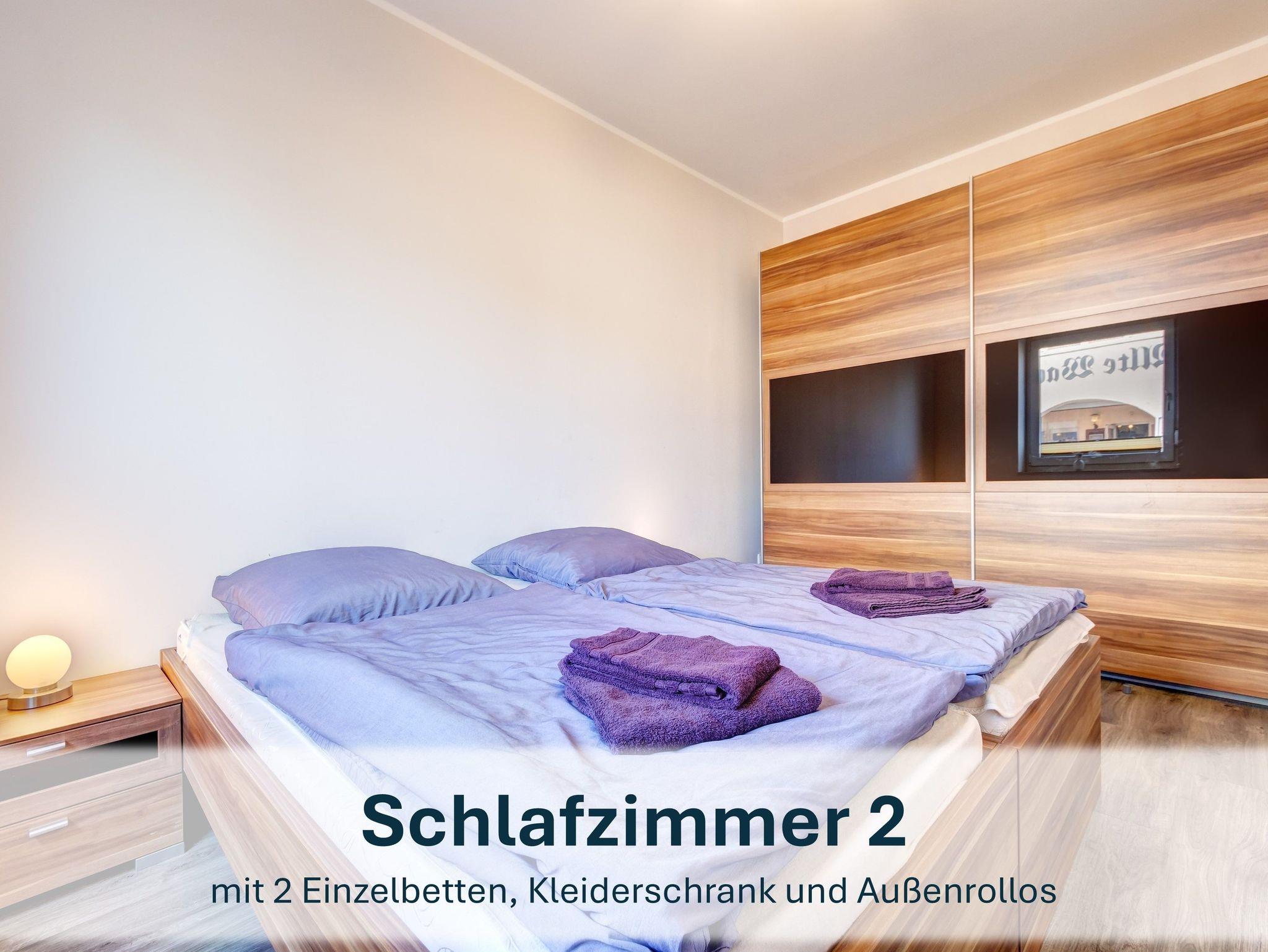 Für Paare oder Einzelreisende bietet die Wohnung „Jolle 16“ im Obergeschoss eine charmante Rückzugsmöglichkeit auf 43m². Der kombinierte Wohn- und Schlafbereich, eine kleine Küche und der möblierte Balkon schaffen eine gemütliche Atmosphäre für entspannte Tage.