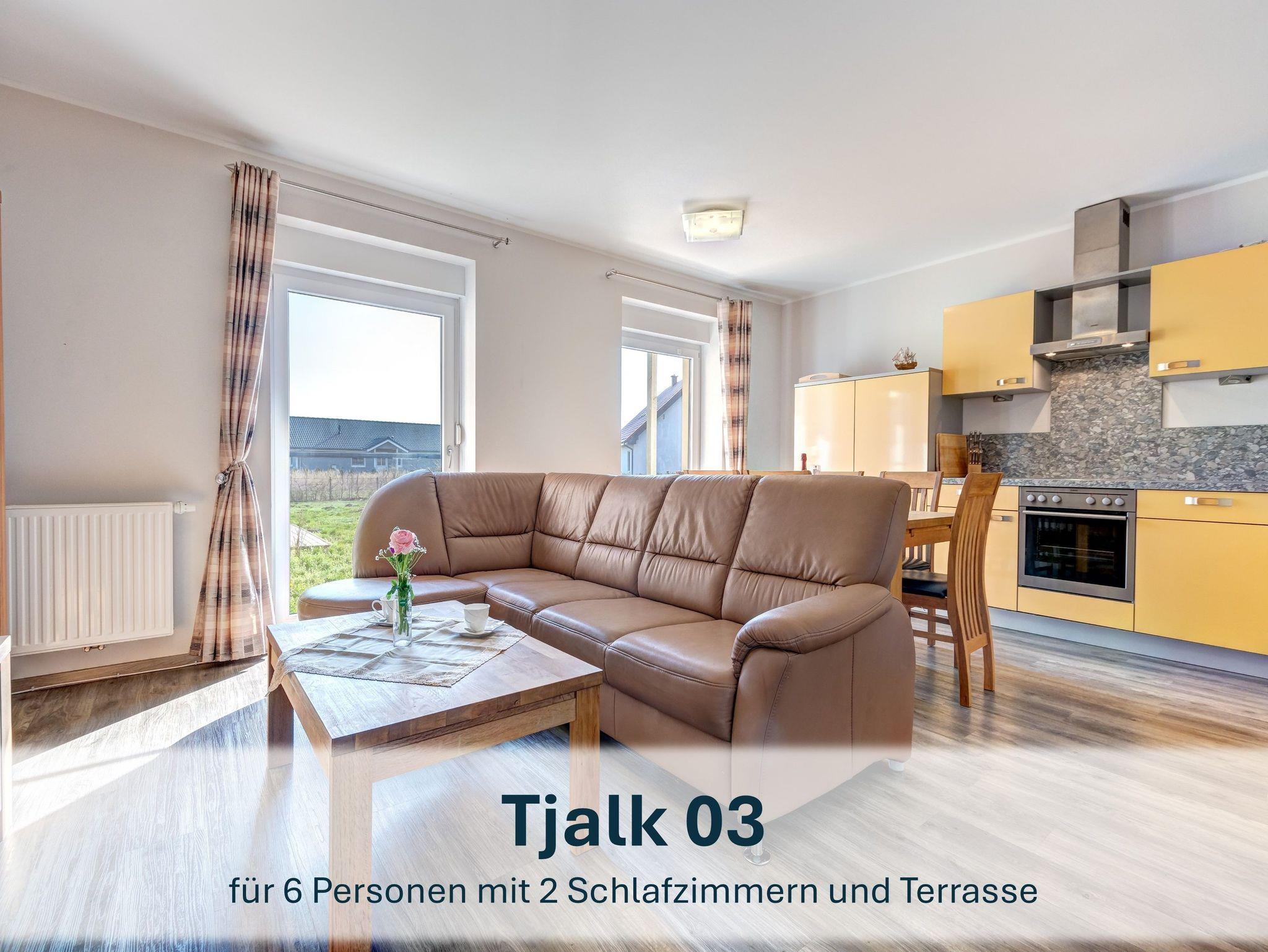 Ebenfalls im Erdgeschoss liegt die Wohnung „Tjalk 03“ (72m²), die sich mit identischer Ausstattung perfekt ergänzt: Zwei Schlafzimmer, ein großzügiger Wohnbereich mit Küche und ein eigener Terrassenplatz bieten Platz für bis zu fünf Personen und ein Kleinkind.
