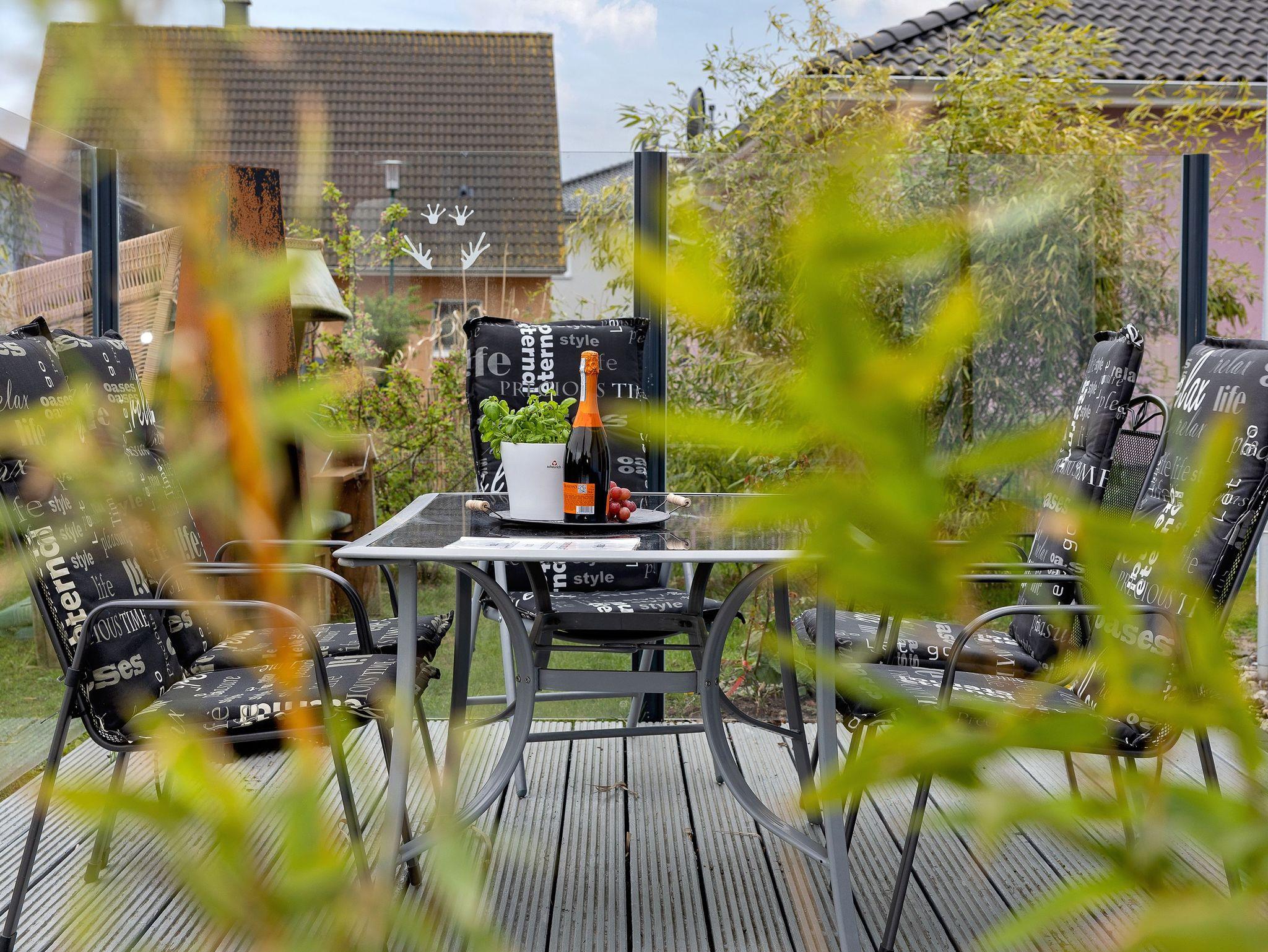 Das Haus verfügt über eine Terrasse mit Windschutz und kleinem Terrassenofen. Neben der Terrasse befindet sich ein feststehender Grill.