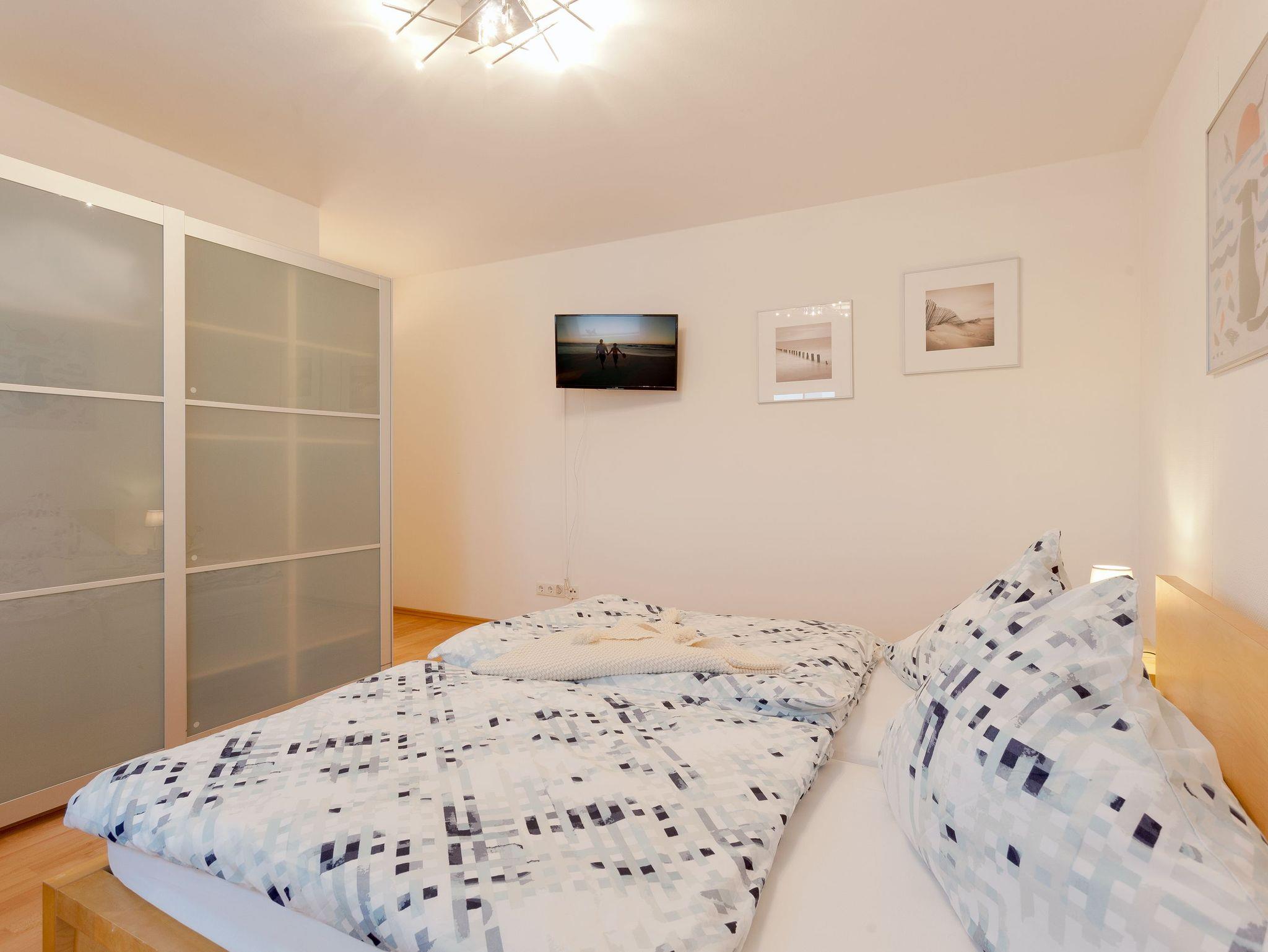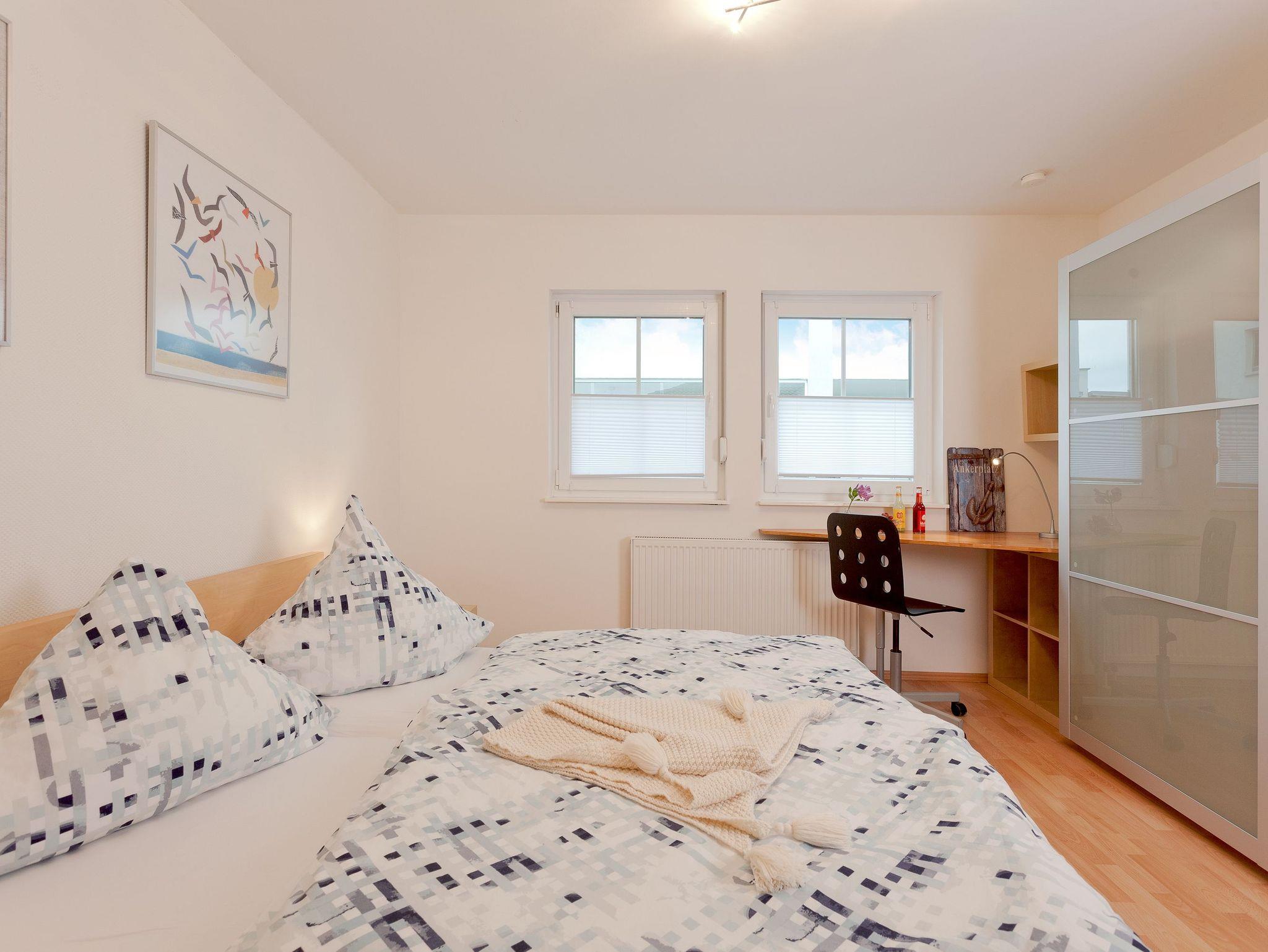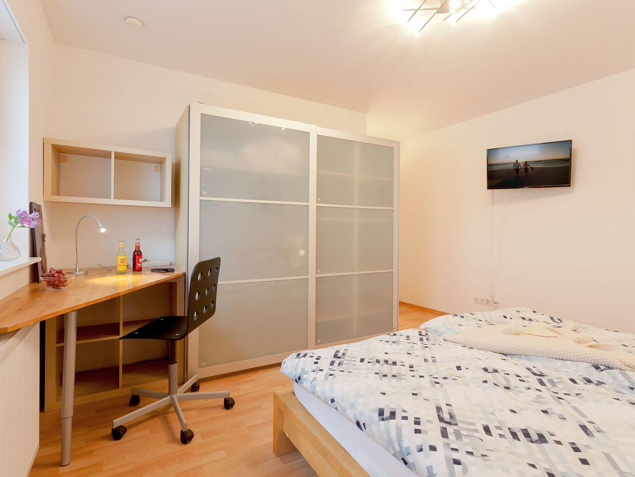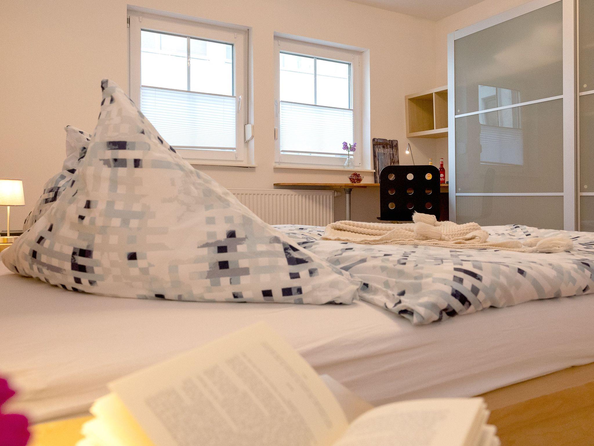 Die Räumlichkeiten sind aufwändig und sehr gemütlich gestaltet. Man gelangt über einen großzügigen Flur in zwei Schlafzimmer mit je einem Doppelbett ( 1 x 1,80 m , 1 x 1,60 m breit), einem Kleiderschrank sowie einem Fernseher. In einem Schlafzimmer befindet sich zudem ein kleiner Arbeitsplatz. Für die kleineren Gäste steht ein Kinderreisebett (ohne Bettzeug) und ein Hochstuhl zur Verfügung. Eine weitere Schlafmöglichkeit befindet sich im Wohnzimmer (zwei Schlafcouches, Liegefläche 121 x 194 cm breit).