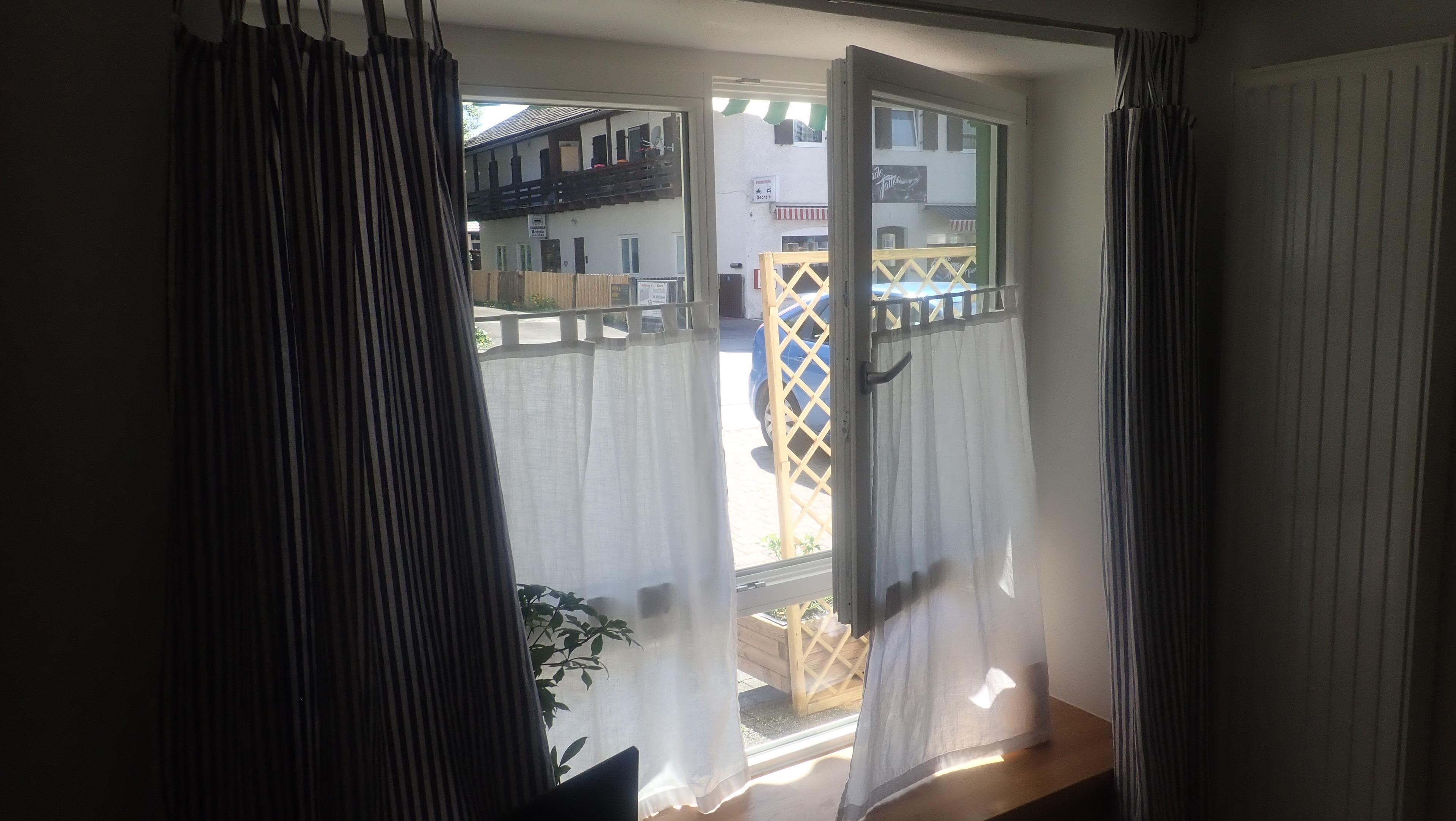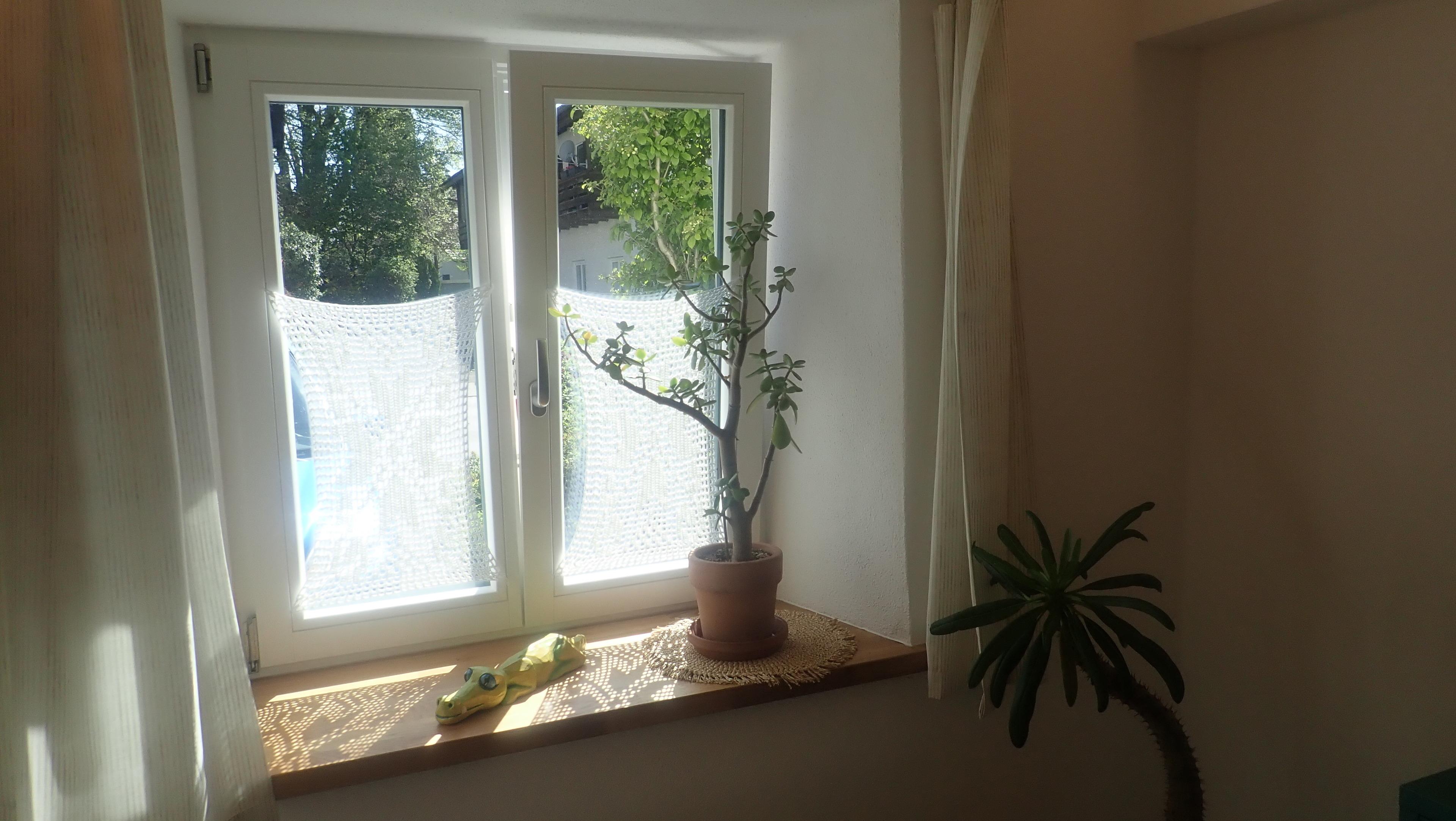Große zweiteilige Fenster lassen viel Licht und Sonne (Südseite!) in die Wohnung, aber eine große automatische Markise über die Längsseite der Wohnung sorgt bei Bedarf für Schatten.