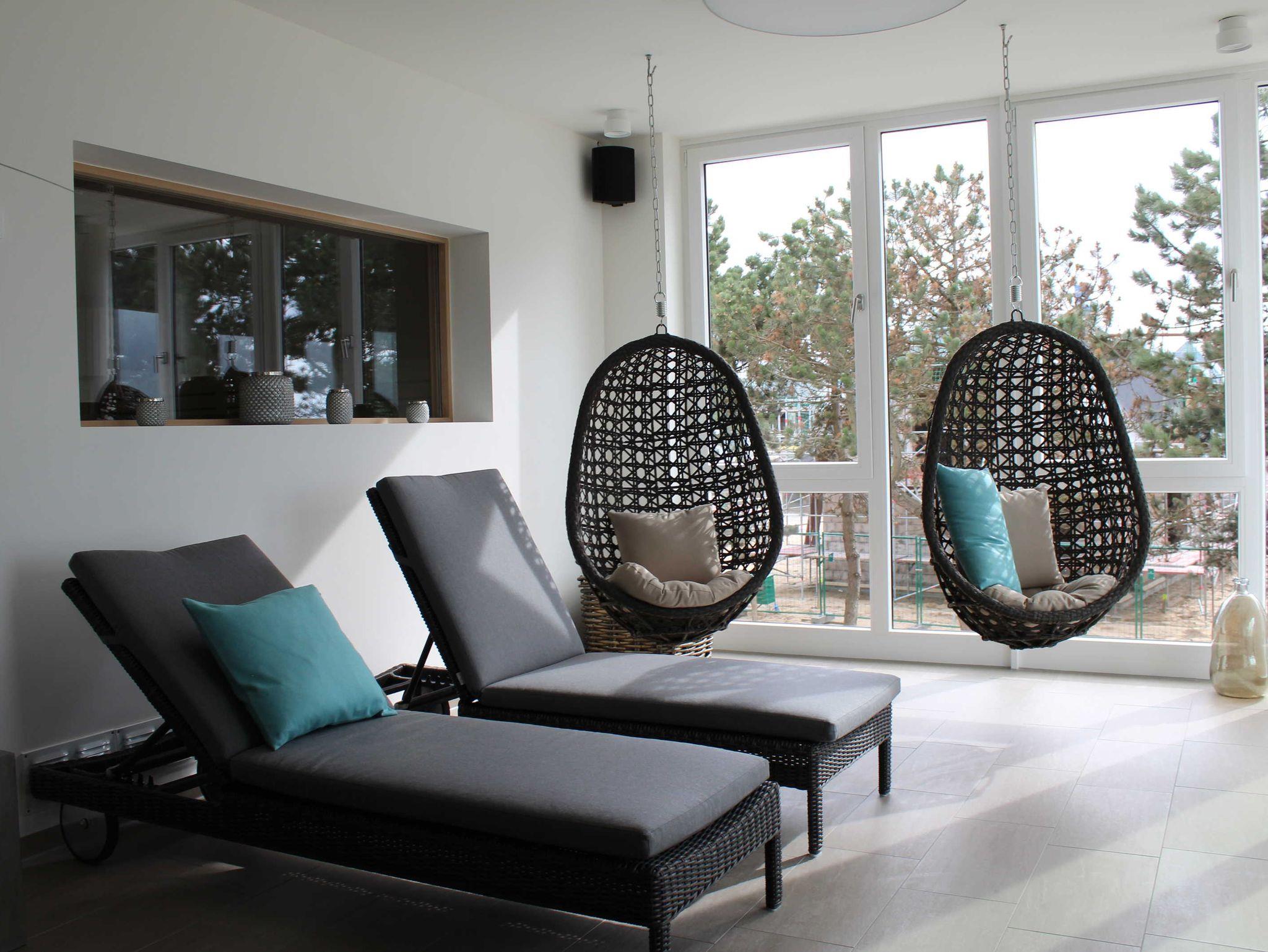 Im 2. Obergeschoß des Hauses H befindet sich auf 250 m² der Sauna- und Fitnessbereich. Zur Saunalandschaft gehören eine finnische Sauna, eine Bio-Licht-Sauna und eine Infrarot-Sauna. Ein sehr geschmackvoll gestalteter Ruheraum lädt mit Ostseeblick zum Verweilen ein. Im angrenzenden Fitnessbereich finden unsere Gäste eine ausreichende Geräteauswahl, um auch im Urlaub etwas für den Körper zu tun. Das Spielzimmer für die ganz kleinen Gäste schließt sich direkt dort an, so dass auch bei schlechten Wetter für Abwechslung gesorgt ist. Alle diese Einrichtungen stehen selbstverständlich allen Gästen zur Verfügung.