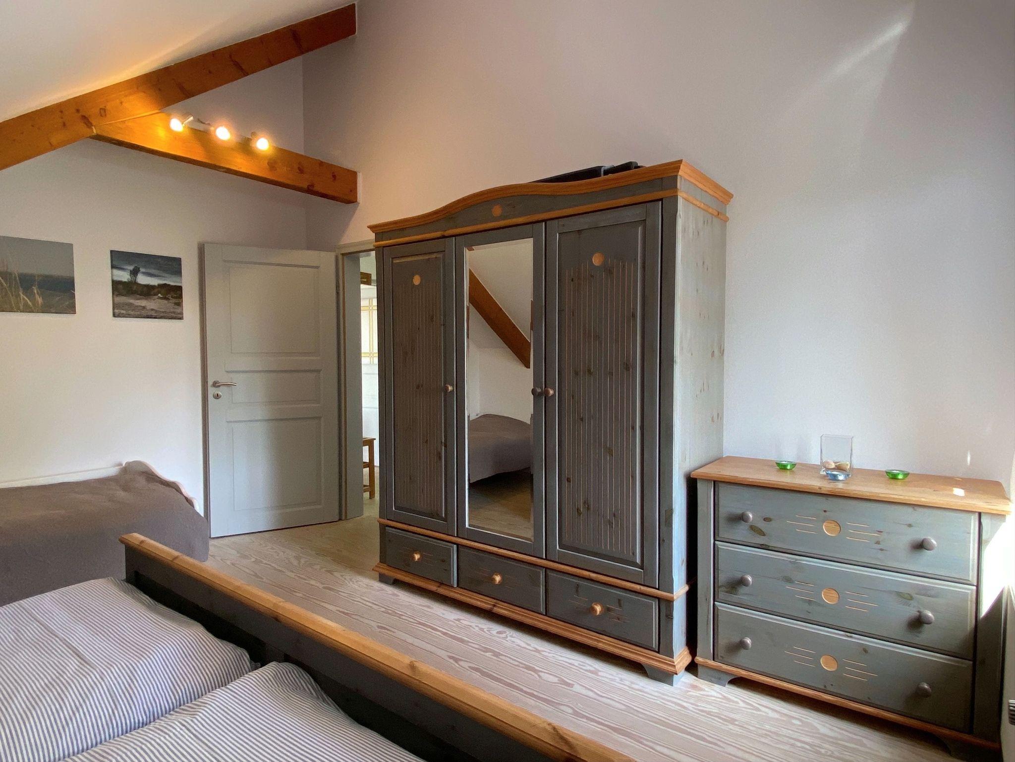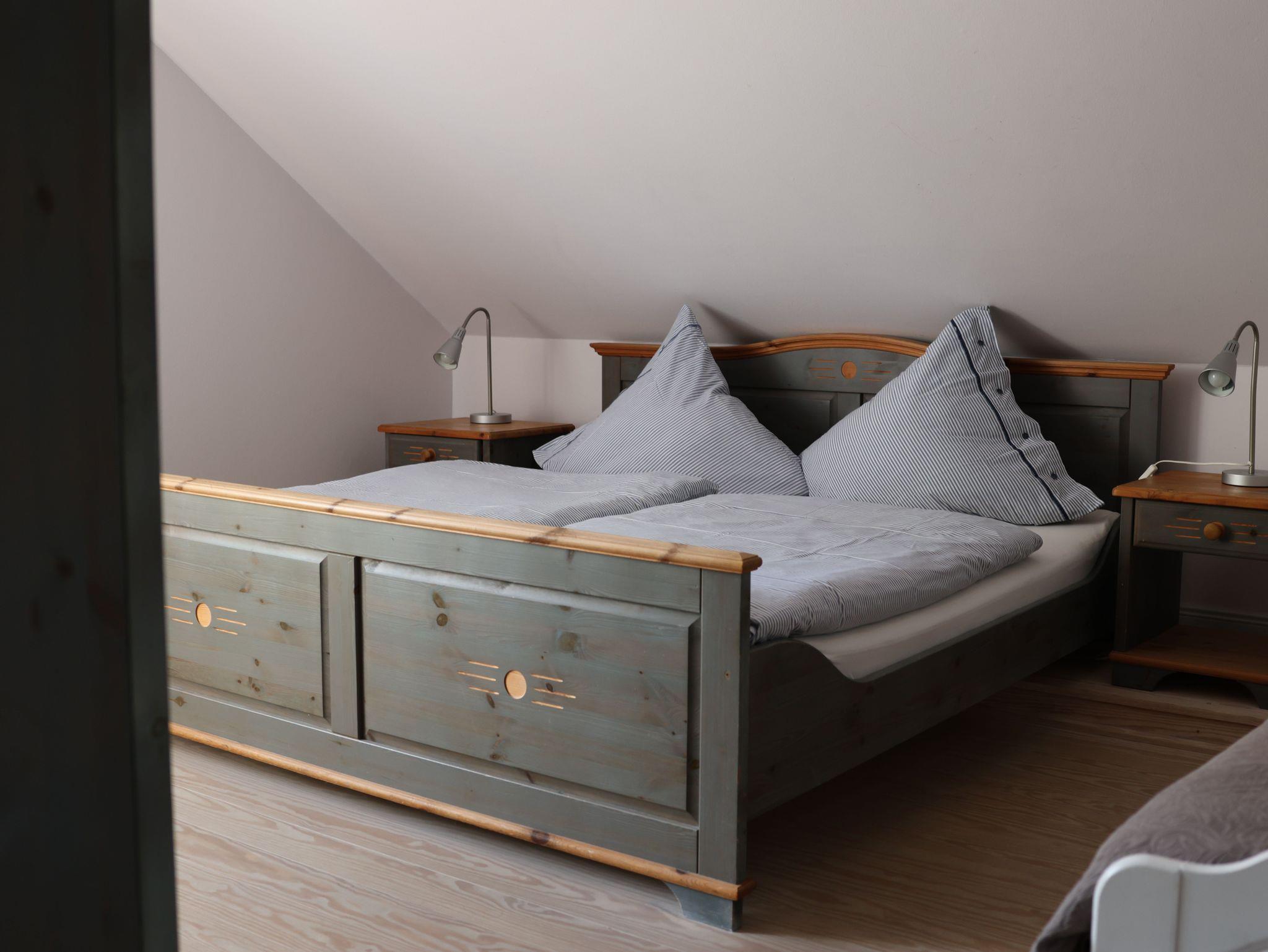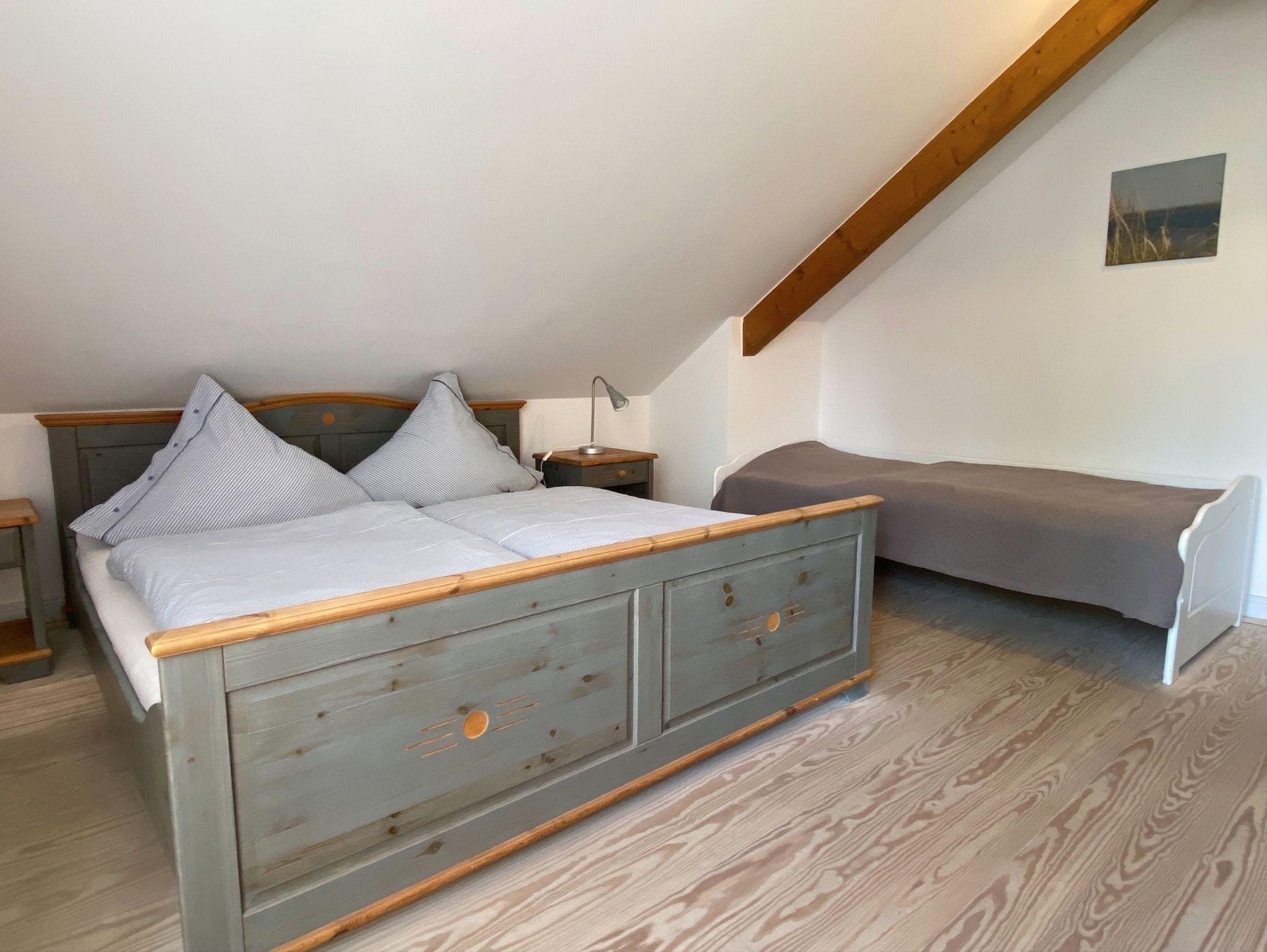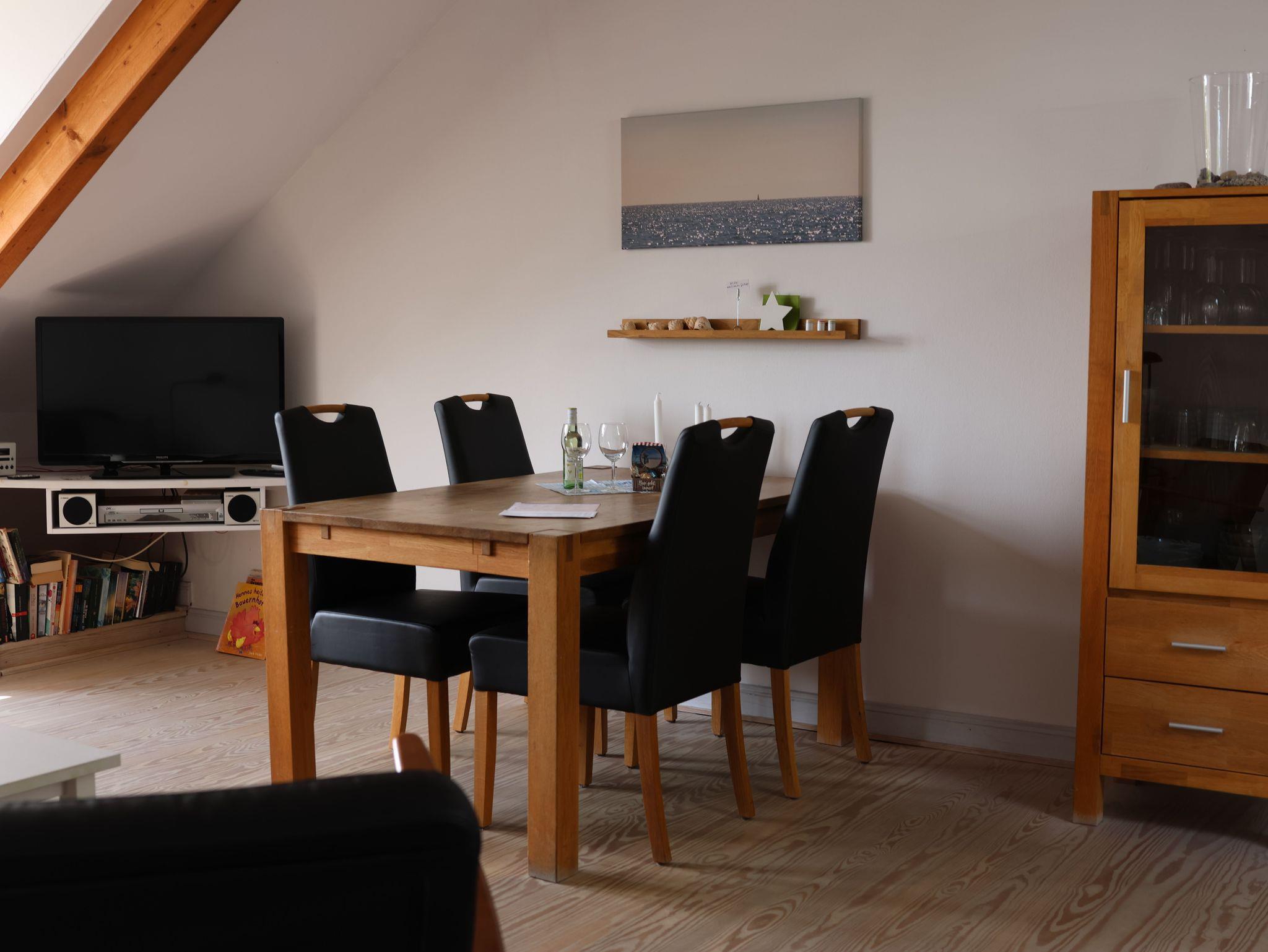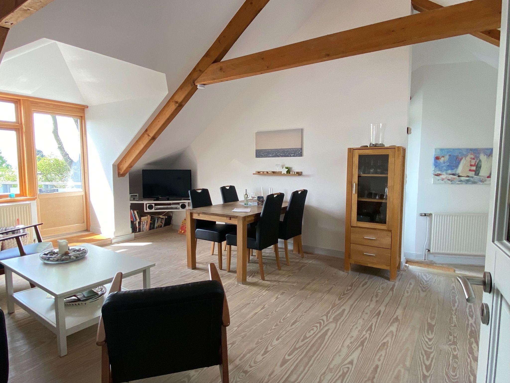 Die 80 m² große, komfortabel eingerichtete Wohnung im 1.Stock hat einen separaten Eingang und der Wohnraum ist nach Süden ausgerichtet. Das Wohnzimmer ist mit einer Sitzecke, Essbereich, SAT-TV, DVD-Player und einer offenen Vollküche mit Geschirrspüler ausgestattet. In einem der beiden Doppelschlafzimmer steht ein zusätzliches Einzelbett zur Verfügung. Ein Babybett kann ebenfalls aufgestellt werden. Der große Südbalkon mit Blick auf die Ostsee und eine geschützte Holzterrasse mit Grill erweitern den Wohnraum. Das Duschbad /WC verfügt über eine Waschmaschine und einen Trockner. Wäschepakete können hinzugebucht werden.