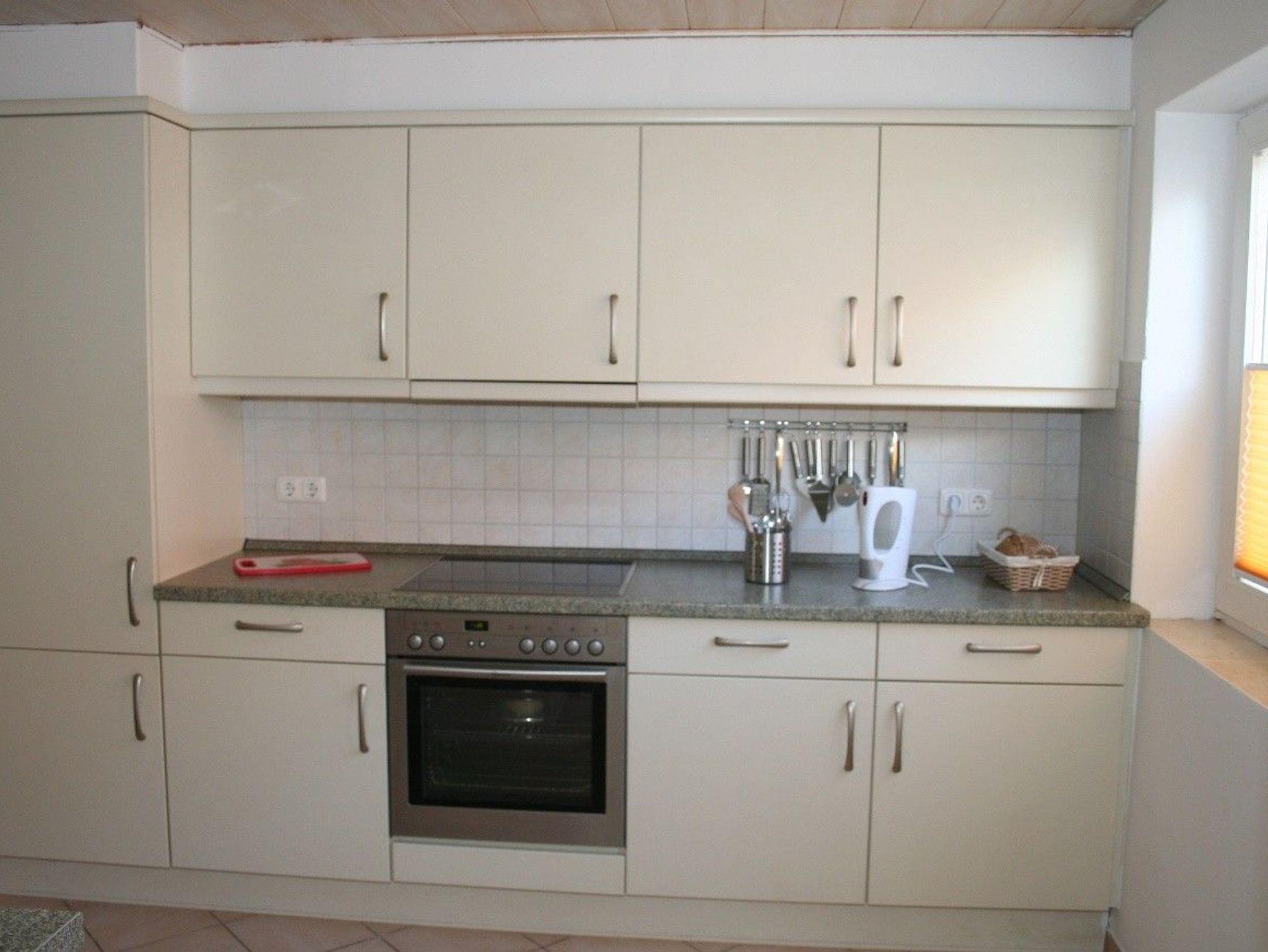 Vollausgestattete Küche mit Mikrowelle, Backofen und Spülmaschine. Der Kühlschrank besitzt ein Gefrierfach.