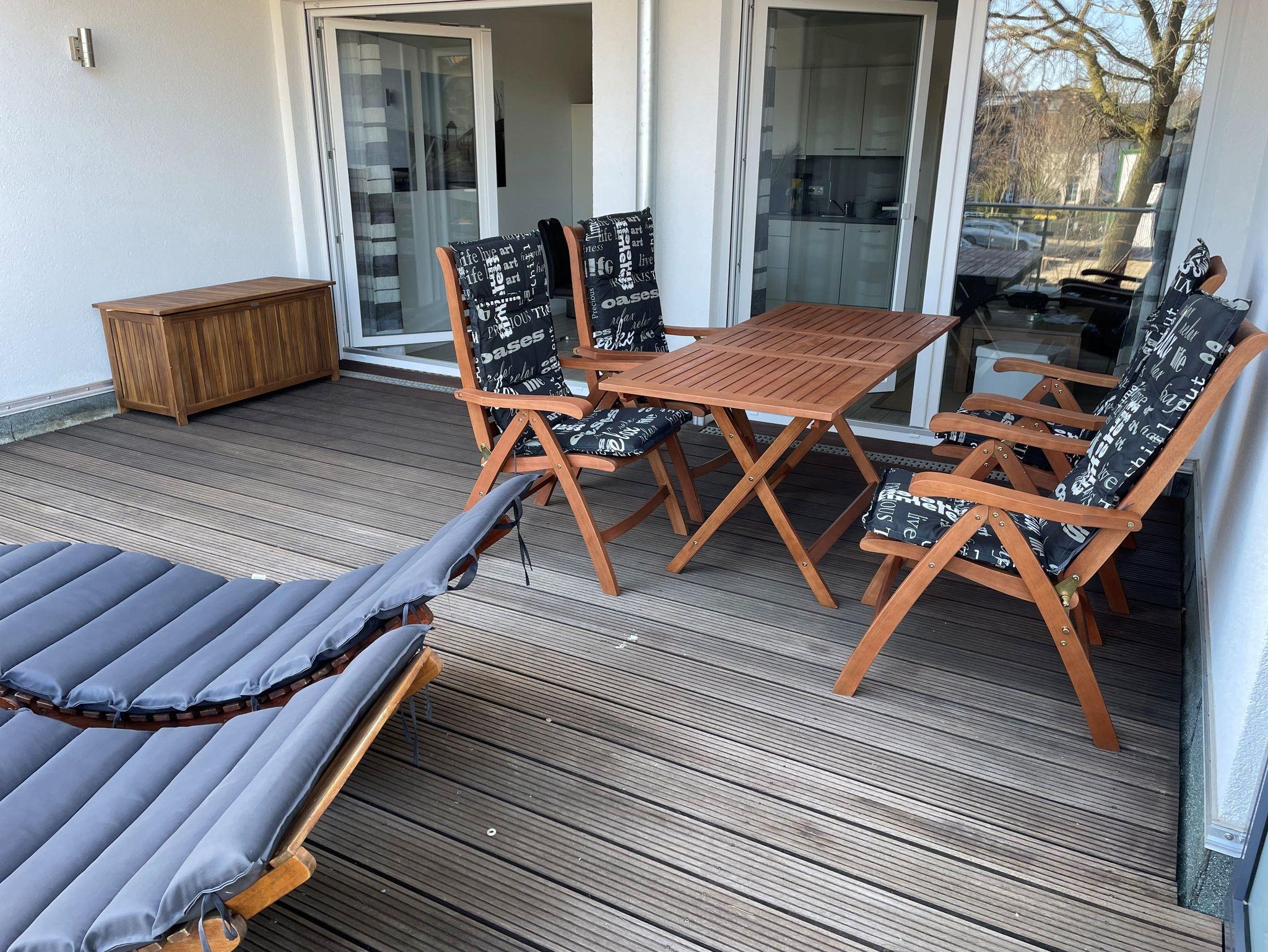 Die Beschattung durch elektrische Rollläden ist inklusive. Der mit ca. 11 m² große halbüberdachter Balkon mit einem seitlichen Blick auf die Ostsee wurde mit Bangkirai belegt. Eine Sitzgruppe bestehend aus einem Tisch mit 4 Stühlen und zwei Liegen sorgt für einen schönen Urlaubstag. Der Balkon ist leider nicht mit Rollstuhl befahrbar.