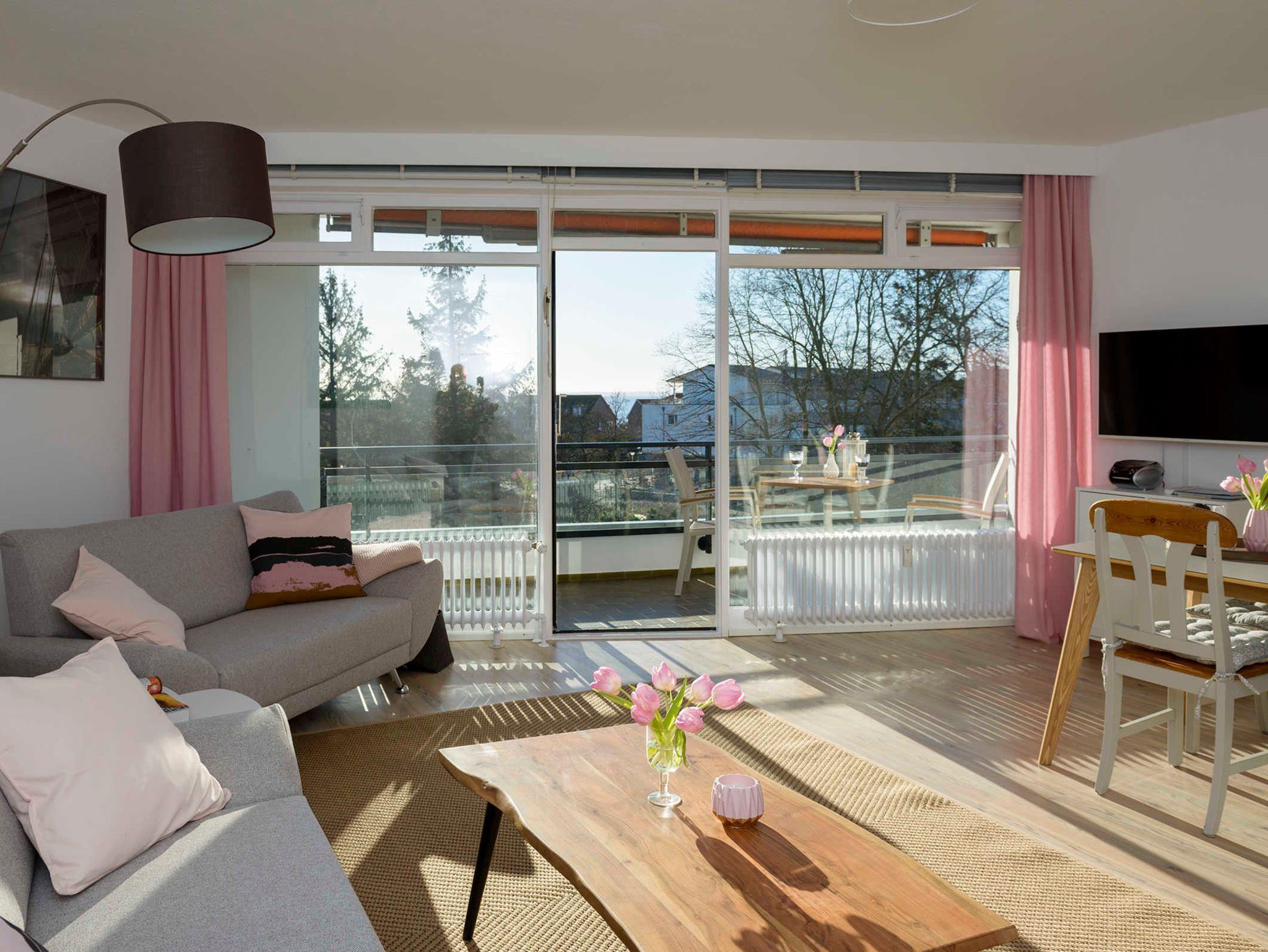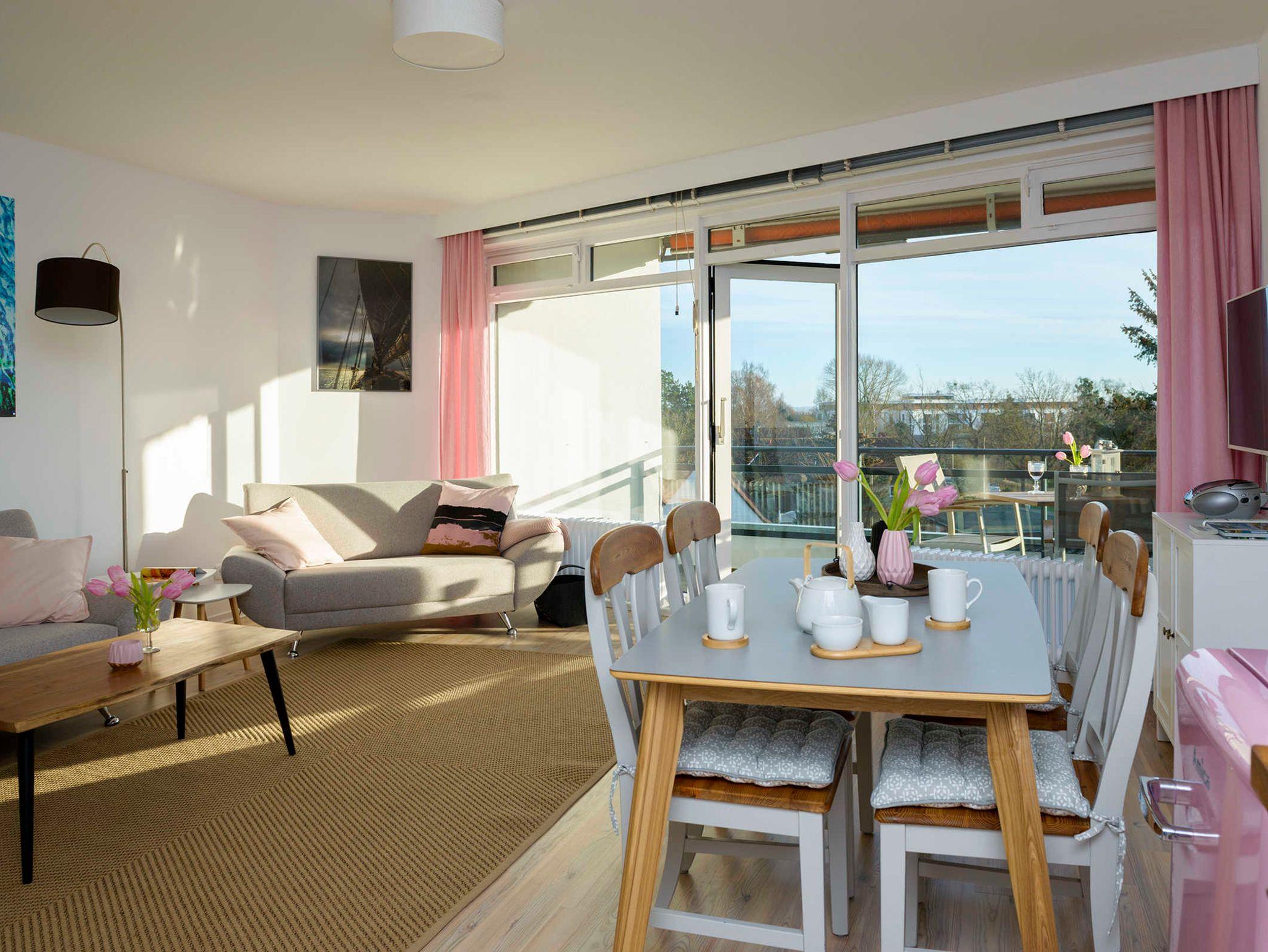 Vom Wohnzimmer treten unsere Gäste auf die mit Balkonmöbeln ausgestattete Loggia in Südlage. Von hier kann man sogar die Ostsee sehen!