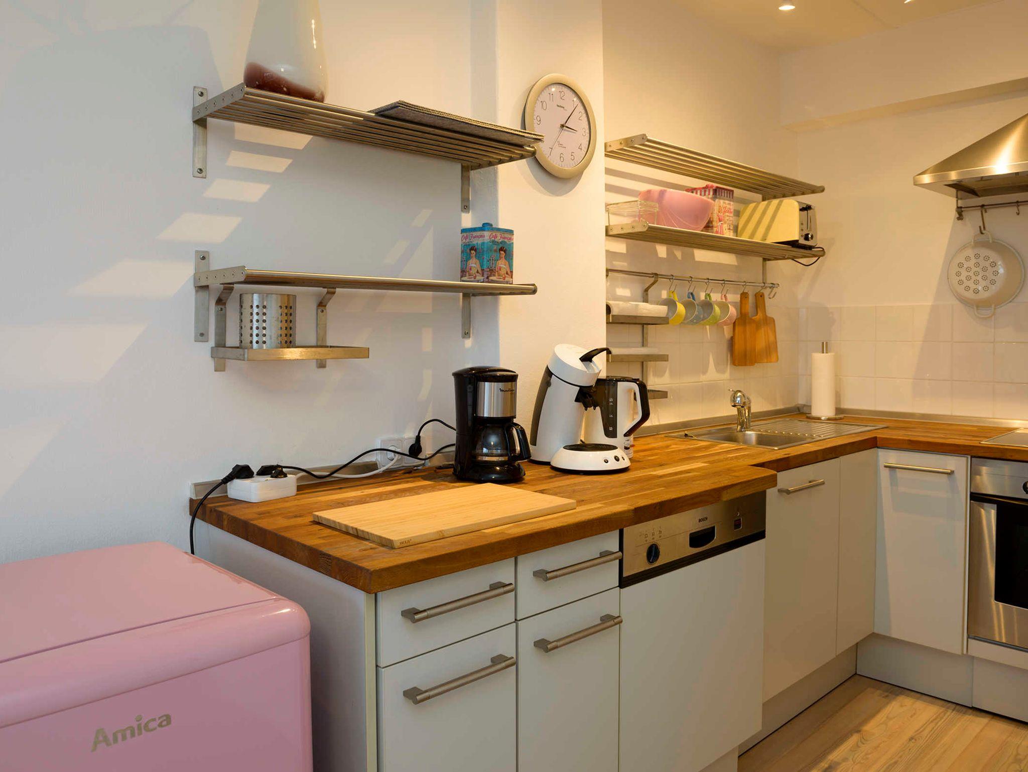 Die zum Wohnraum offene Küche ist komplett ausgestattet: Herd mit Backofen, Geschirrspülmaschine, Kühl-/Gefrierkombi, Kaffeefilter- sowie Padmaschine, Sodastream etc. Reinigungsmittel und Geschirrhandtücher liegen bereit.