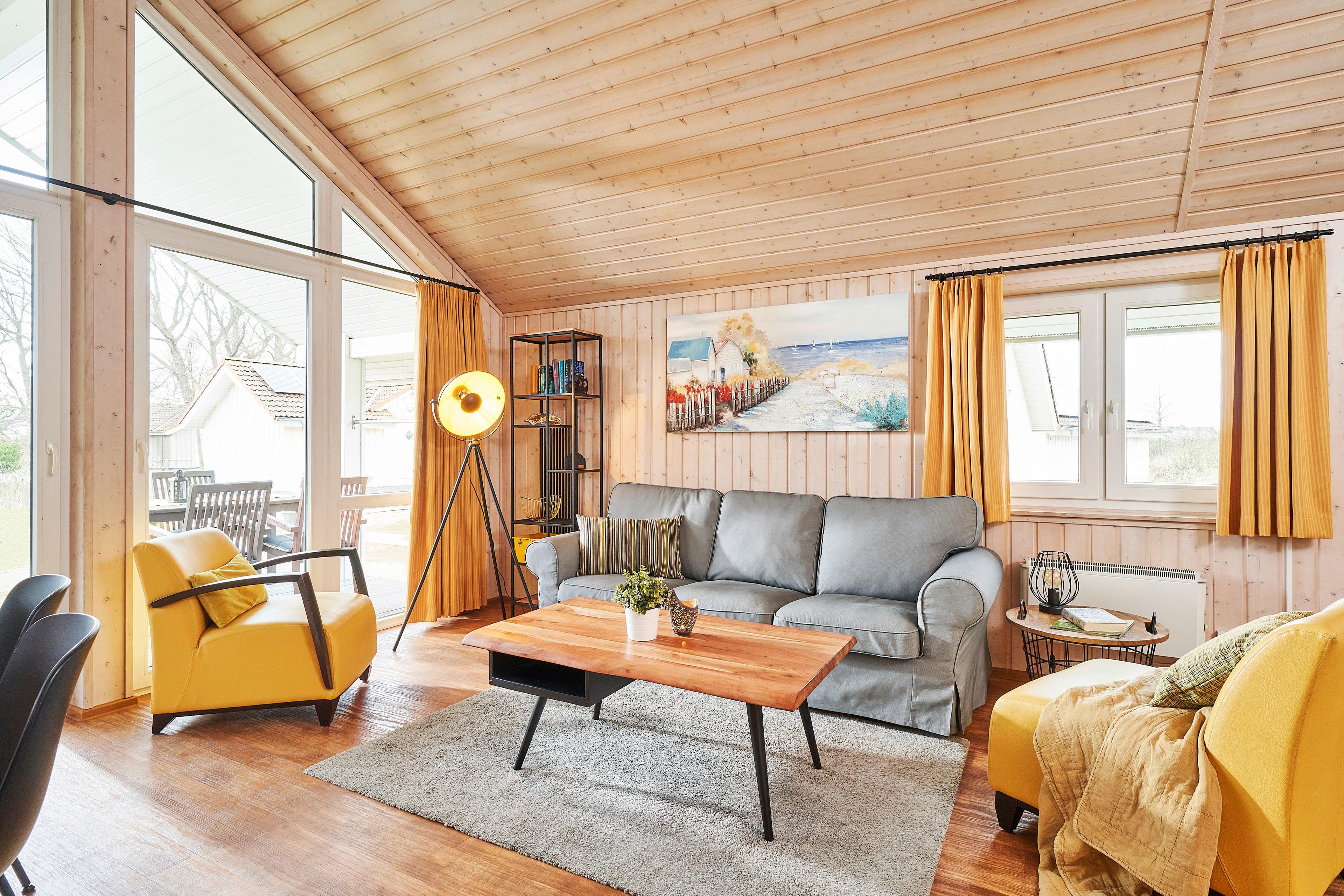 Die Fjordhäuser haben drei abgeschlossene Schlafzimmer und bieten damit sechs Personen reichlich Platz. Küche, Ess- und Wohnbereich gehen auch bei diesem Haustyp fließend ineinander über. Die freundliche, cremefarbene Einrichtung wird von kräftigen sonnengelben Akzenten unterstüzt. Dieser Haustyp verfügt über eine Sauna, die direkt vom Duschbad aus zu erreichen ist.