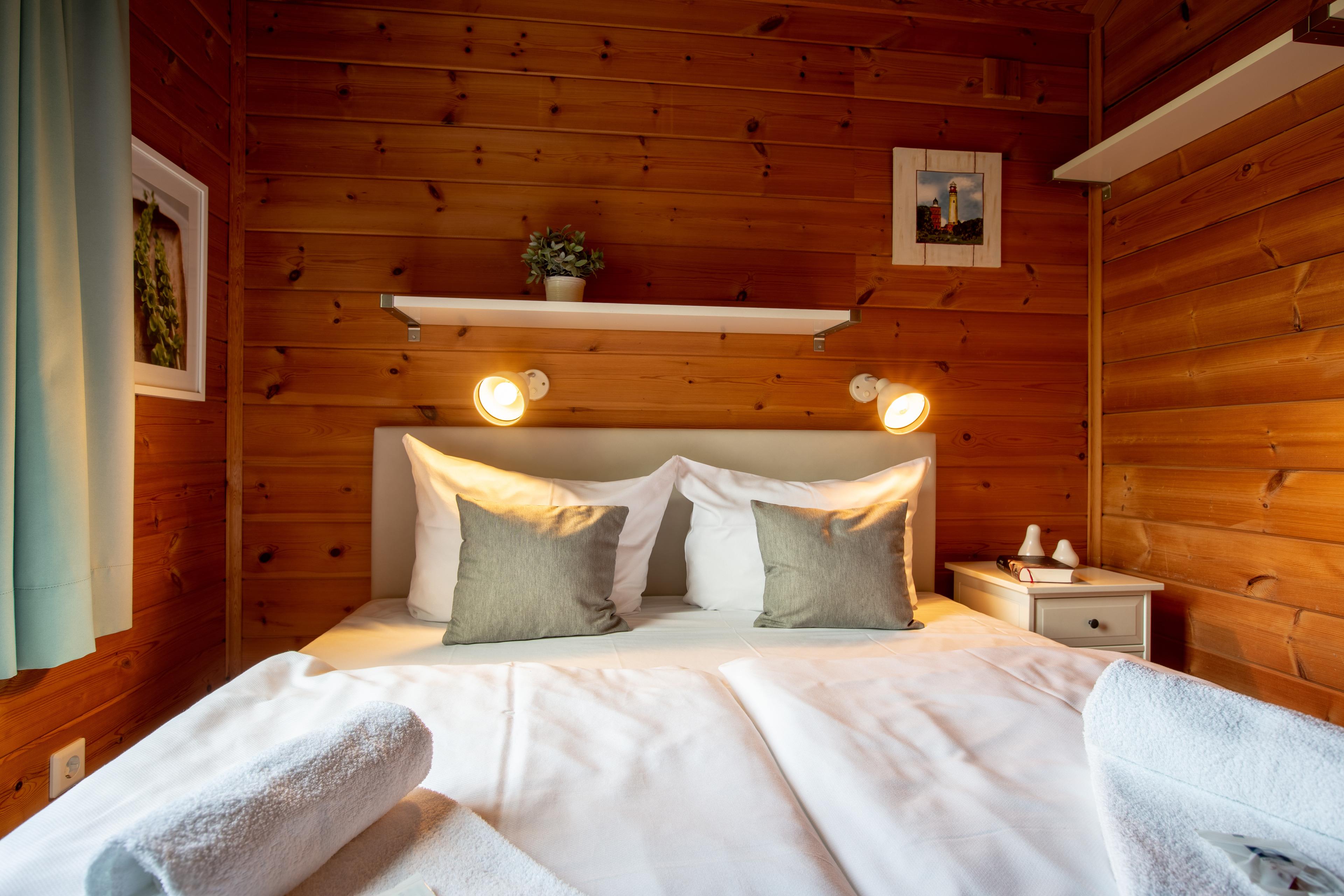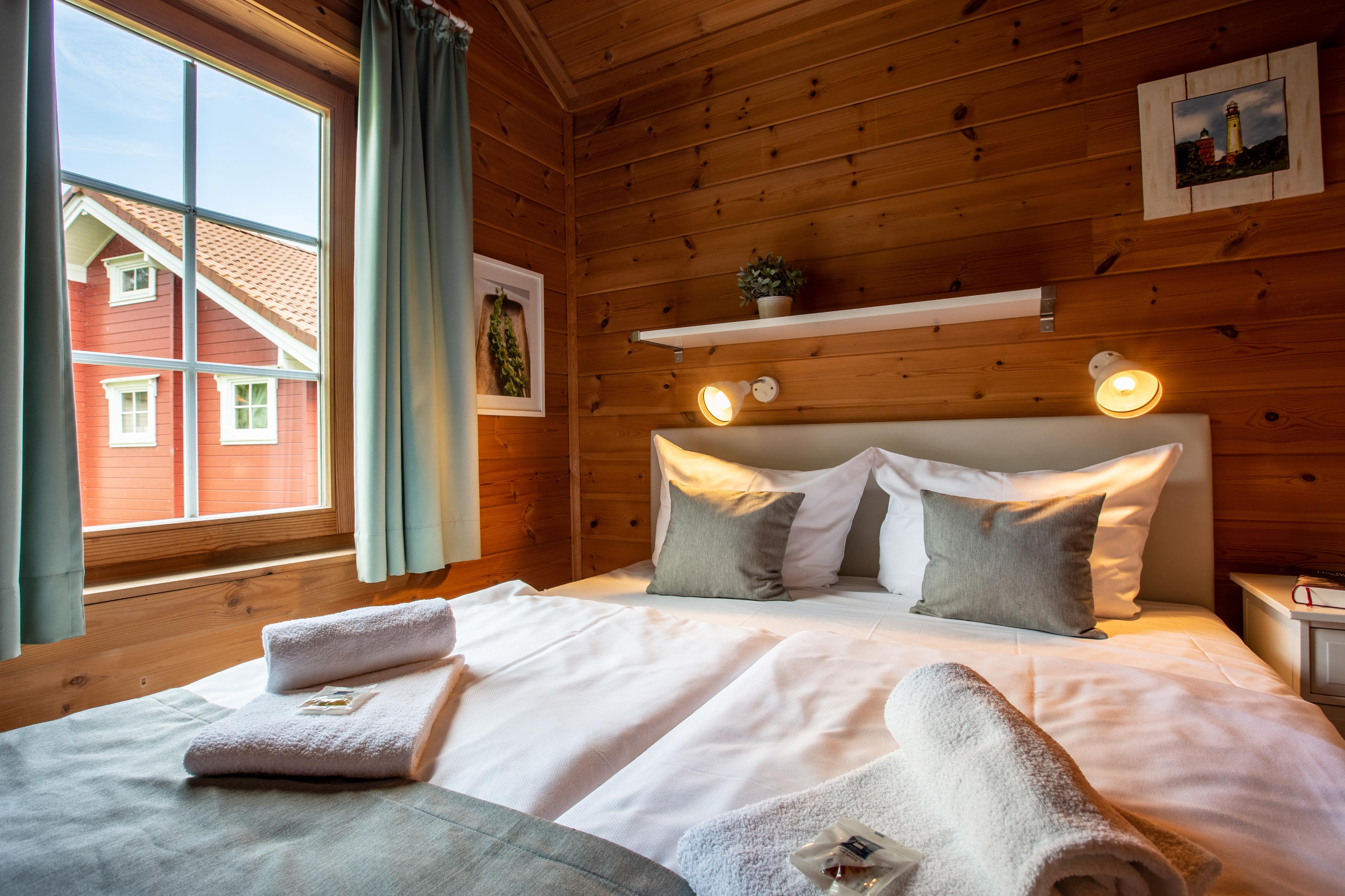 Die Schärenhäuser sind mit drei abgeschlossenen Schlafzimmern für sechs Personen ausgelegt. Die Eichenmöbel sowie die Farben Mint und Grün unterstreichen den frischen Landhausstil der Blockhäuser. Die Chill-Empore lädt exklusiv zum Relaxen ein und ist unter anderem mit einem extra Fernseher und Sitzsäcken ausgestattet.