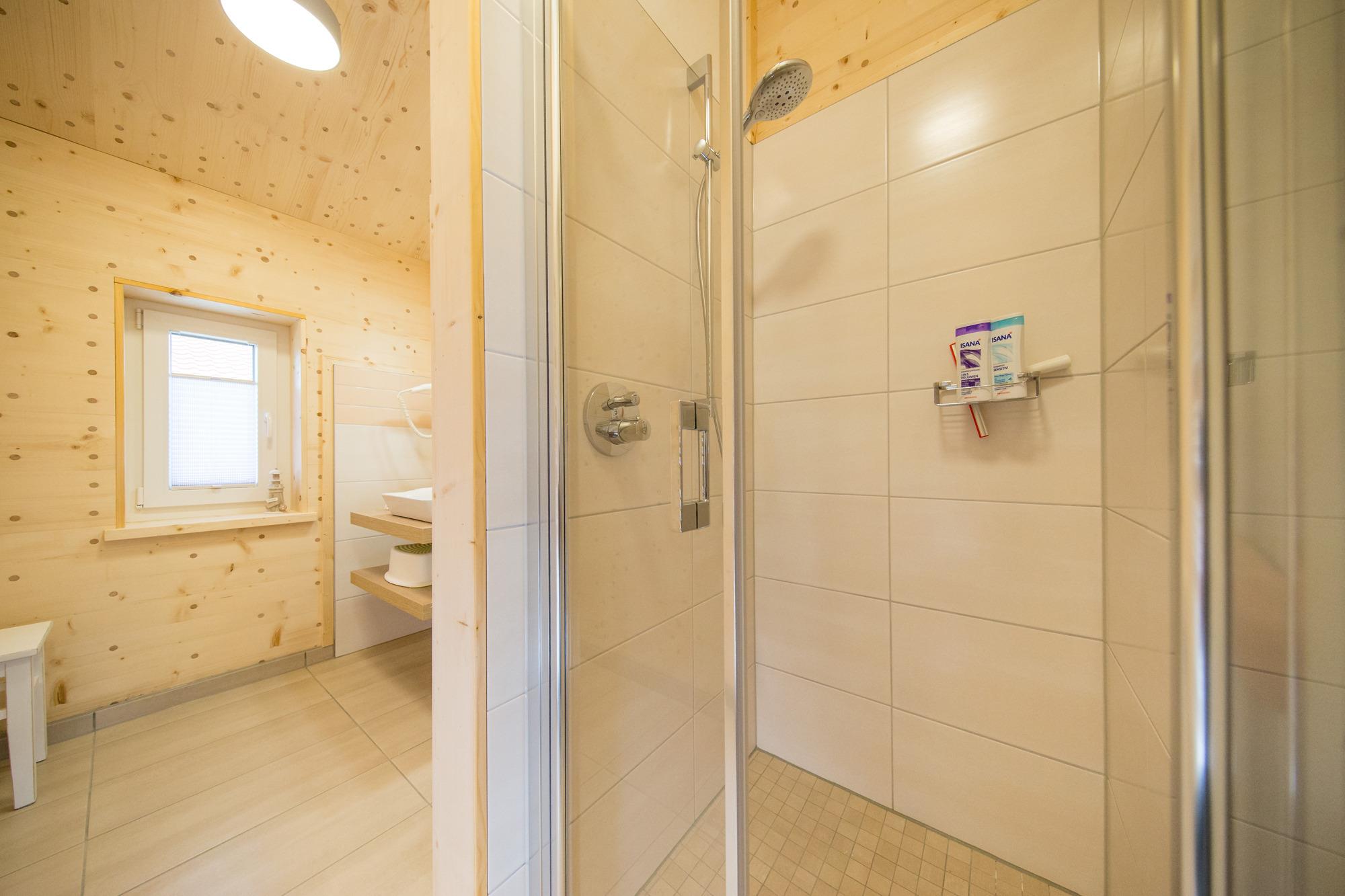 Die P-Liner Häuser verfügen über zwei ebenerdige Duschbäder. Die Sauna erreicht man über das große Badezimmer und in zwei Minuten ist man zum Abkühlen am Strand.