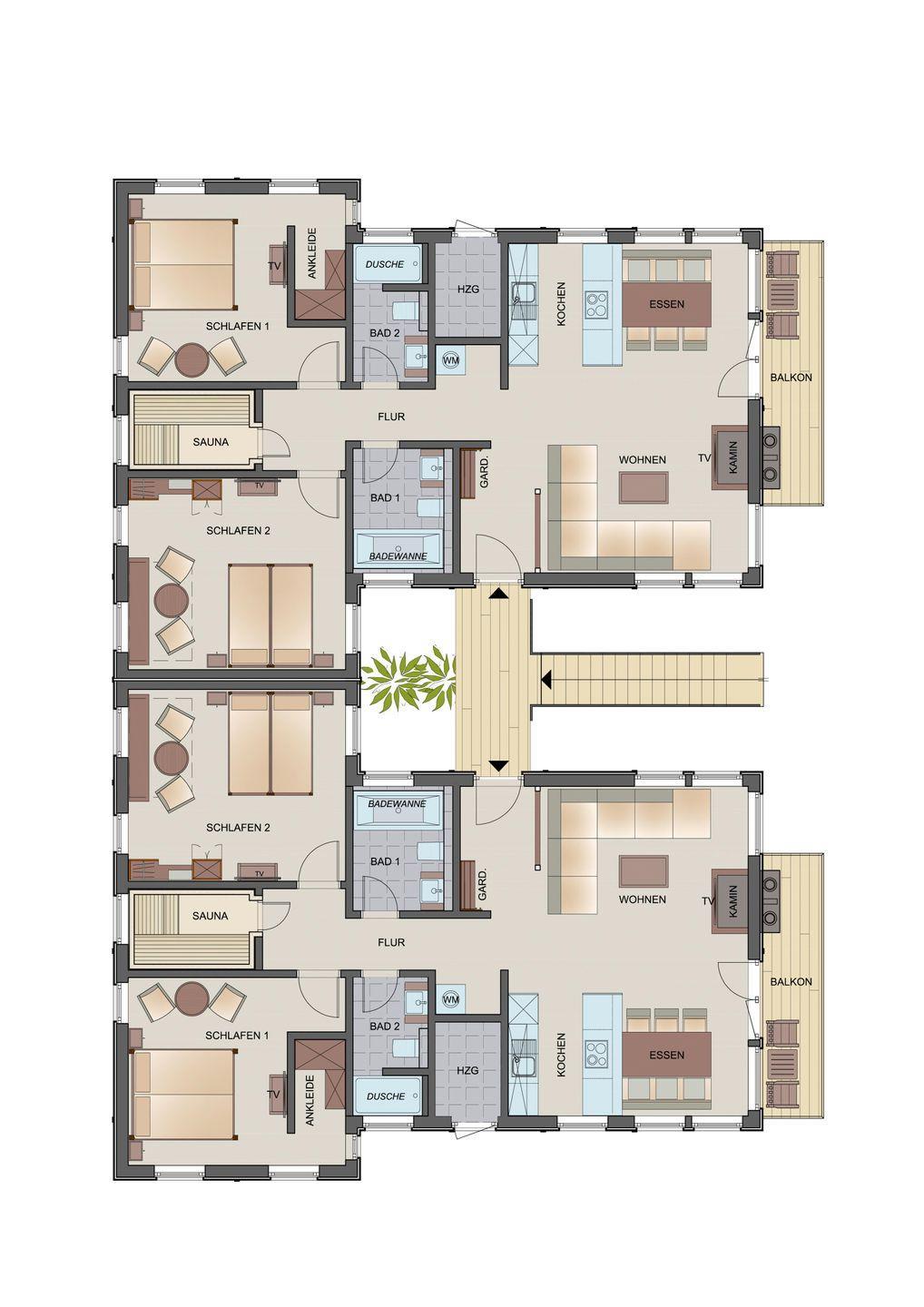 Auf 90 m2 umfassen die Ferienwohnungen D2 zwei Schlafzimmer mit je einem Doppelbett und auf Wunsch mit einem zusätzlichen Bett für eine fünfte Person. Ausgestattet mit zwei Badezimmern, einer offenen Küche mit Esstisch und einer gemütlichen Sofaecke, Kamin und Sauna laden unsere Ferienwohnungen zum entspannten Ostseeurlaub zu jeder Jahreszeit ein. Die Ferienwohnungen im Erdgeschoss besitzen eine große, umlaufende Holzterrasse mit Grill. Im Obergeschoss erwartet Sie ein möblierter Balkon, von dem Sie über das gesamte Feriendorf in Richtung Ostsee blicken.