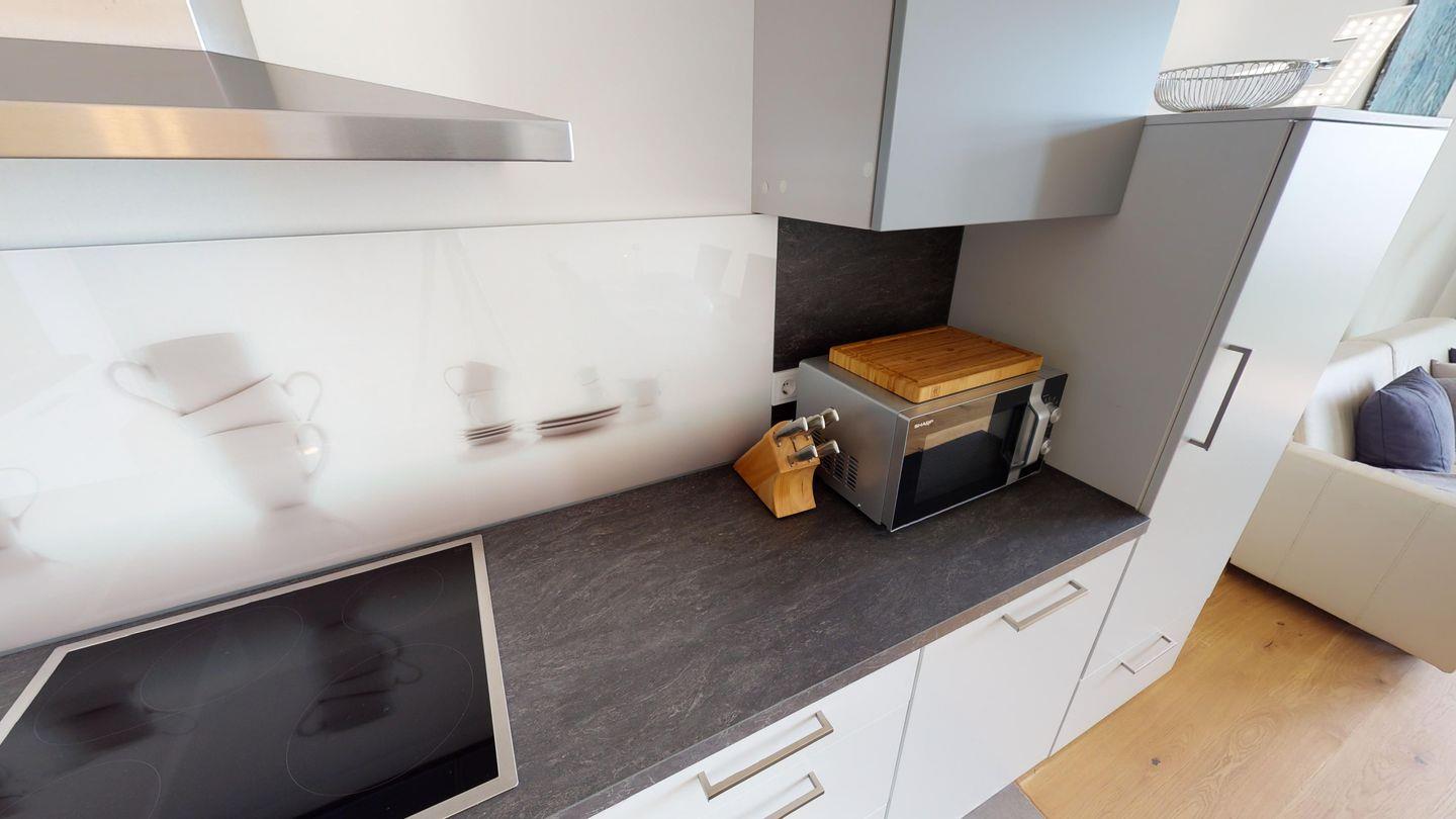 Das Herzstück der Wohnung ist der offene, moderne Wohn-/Essbereich mit direktem Meerblick. Hier befindet sich auch die voll ausgestattete Küche mit hochwertigen Markengeräten. Das Schlafzimmer ist ruhig gelegen, und selbst von hier aus kann man den direkten Meerblick genießen, sogar vom Bett aus. Zusätzlich gibt es im Wohnzimmer eine Schlafcouch für bis zu 2 Personen und einen 55 Zoll Fernseher. Ein Duschbad mit WC komplettiert die Ausstattung.