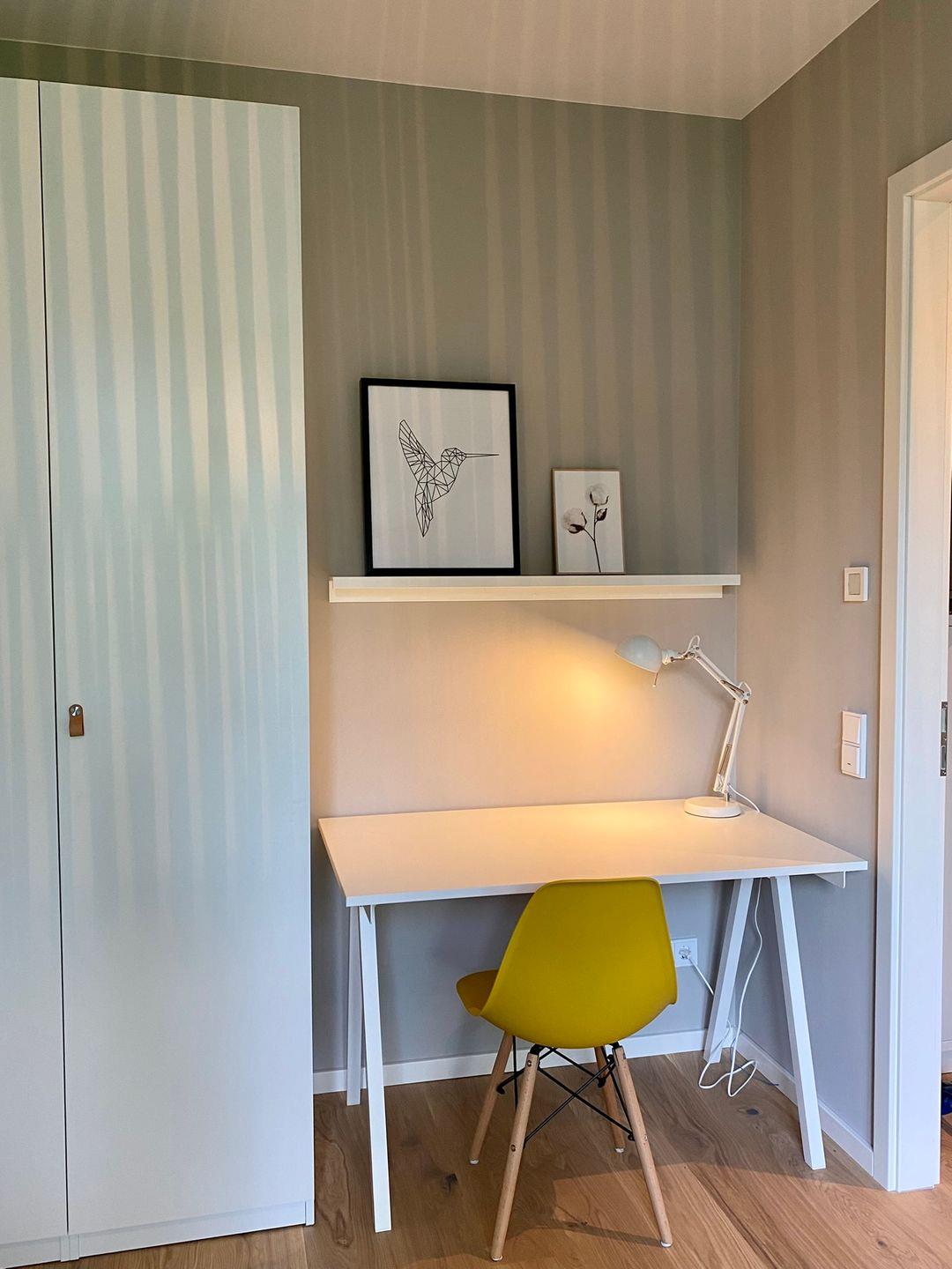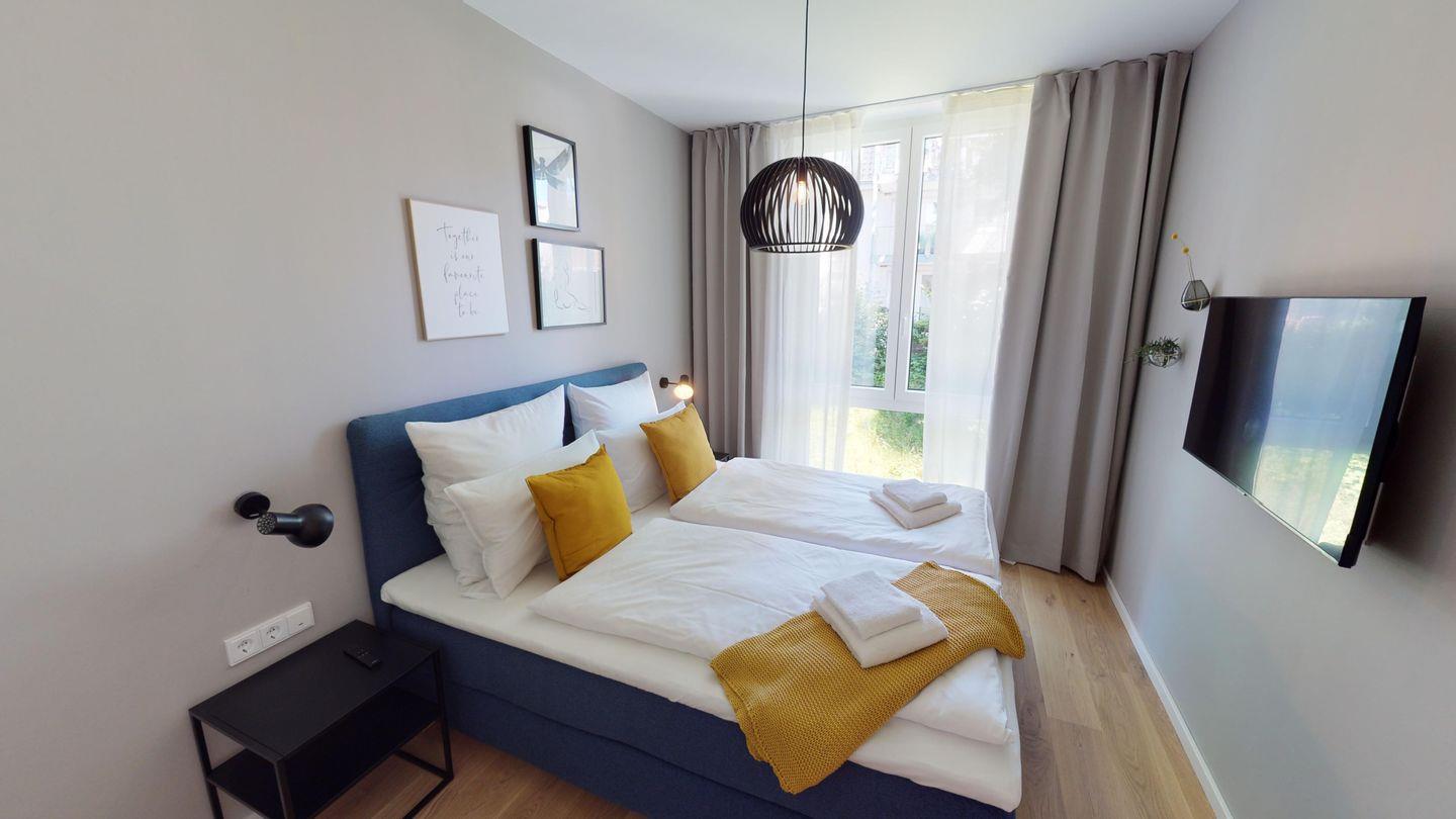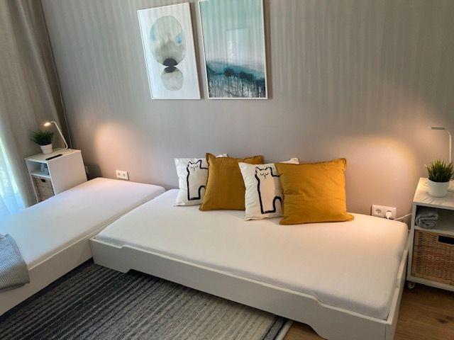 Der großzügige, offene Wohn- und Essbereich ist gemütlich eingerichtet und offen zur voll ausgestatteten Küche, die keine Wünsche offen lässt. Die beiden Schlafzimmer sind ruhig nach hinten gelegen. Im Master-Bedroom befindet sich ein hochwertiges Doppelbett, im zweiten Schlafzimmer stehen zwei Einzelbetten, die variabel gestellt werden können. Beide Schlafräume verfügen über einen Smart-TV, einen Kleiderschrank und Verdunkelungsvorhänge.