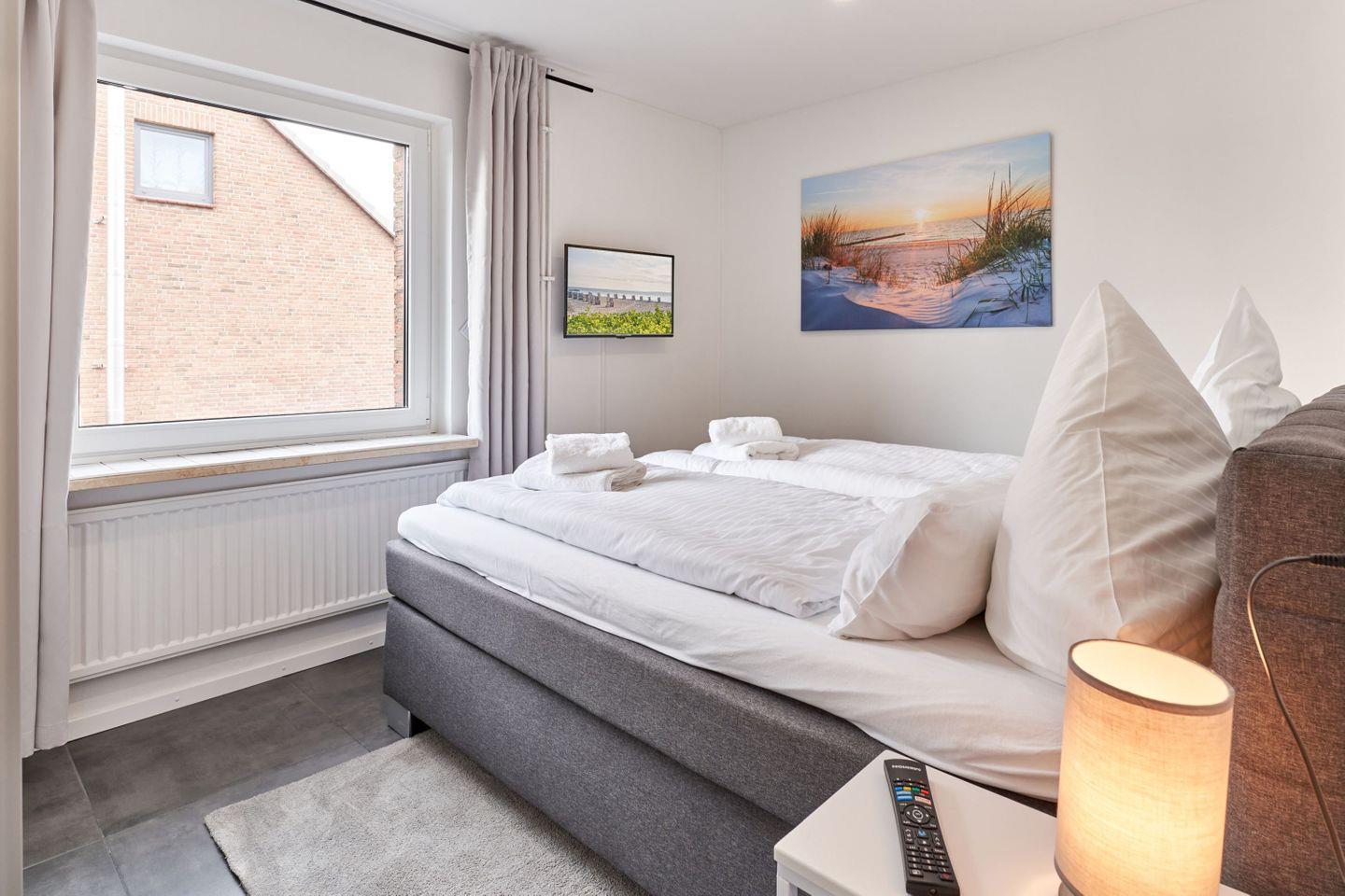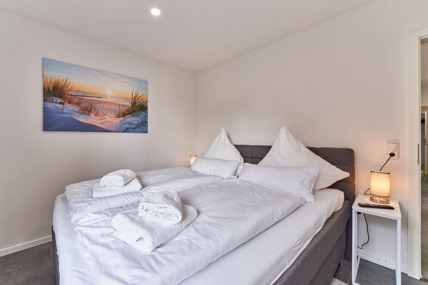 Das Masterschlafzimmer verfügt über eine komfortables Boxspringbett (180x200cm), das Ihnen einen ruhigen und erholsamen Schlaf während Ihres Aufenthalts schenken wird. Im Kinderschlafzimmer ist ein Etagenbett (90x200cm) und schafft einen eigenen Bereich für schöne Träume nach einem Strandtag. Sollten Sie ein Kinderreisebett und einen Hochstuhl benötigen, so können Sie dieses bei Ihrer Buchung direkt dazubuchen.