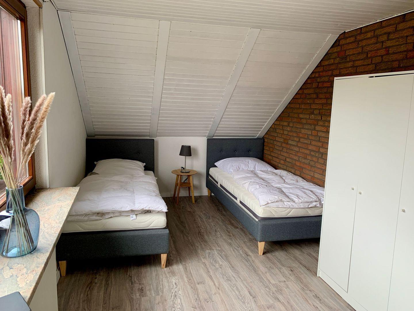 Das Haus verfügt über ein zusätzliches Doppelzimmer 24qm , mit Smart TV, Tisch und 2 Stühlen, und Kleiderschrank, allerdings ohne Bad. Das Bad der Hauptwohnung muss dann mitbenutzt werden. Zwei moderne Polsterbetten (90x200cm) mit Geltexmatratzen sorgen für erholsamen Schlaf. Die Betten können auch zusammengestellt werden. Das Ergänzungszimmer wurde im Juni 2022 renoviert und wird nur in Verbindung und nach Verfügbarkeit mit der Ferienwohnung vermietet. Sprechen Sie uns bei Bedarf gerne an.