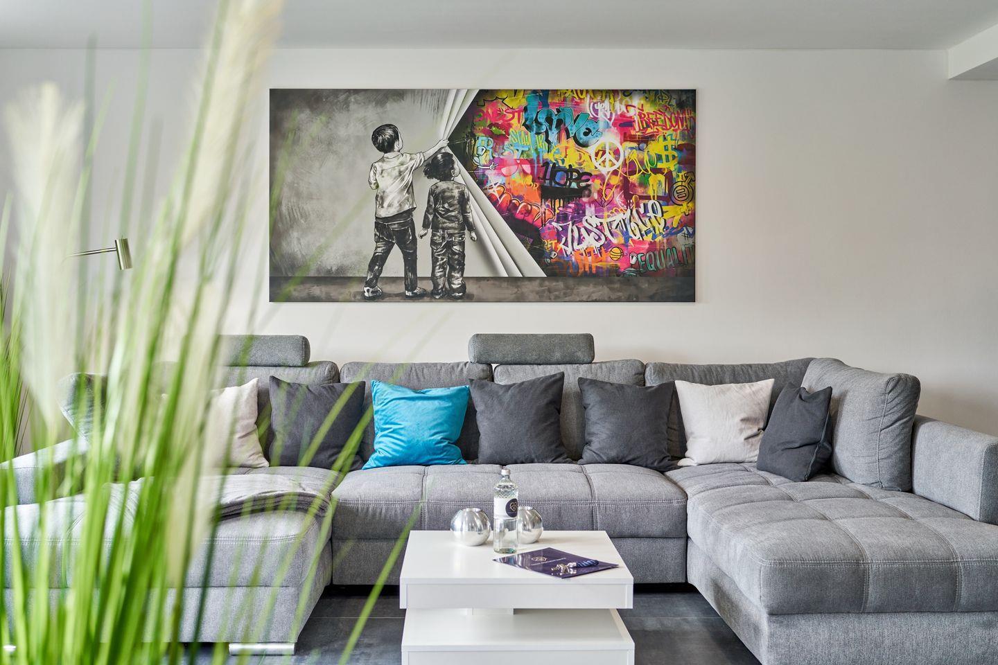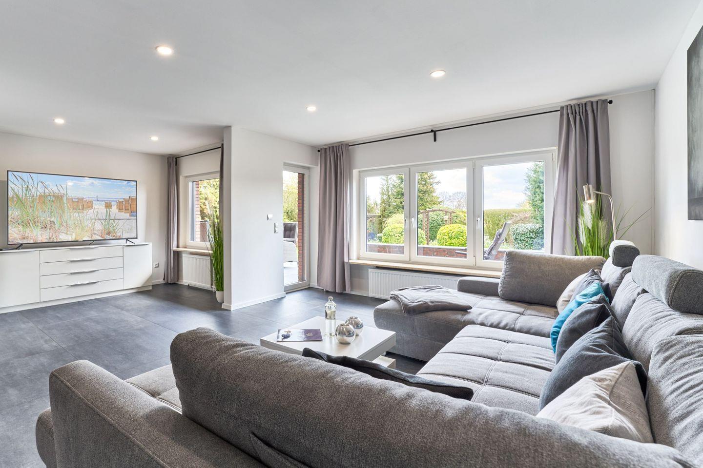Der große und helle Wohn- und Essbereich, mit gemütlicher Wohnlandschaft lädt zu entspannten Fernsehabenden mit großem Smart TV mit der gesamten Familie ein. Ein direkter Zugang zur Sonnenterasse und zum Garten lädt gerade in den Sommermonaten zu schönen Grillabende auf der Terrasse ein.