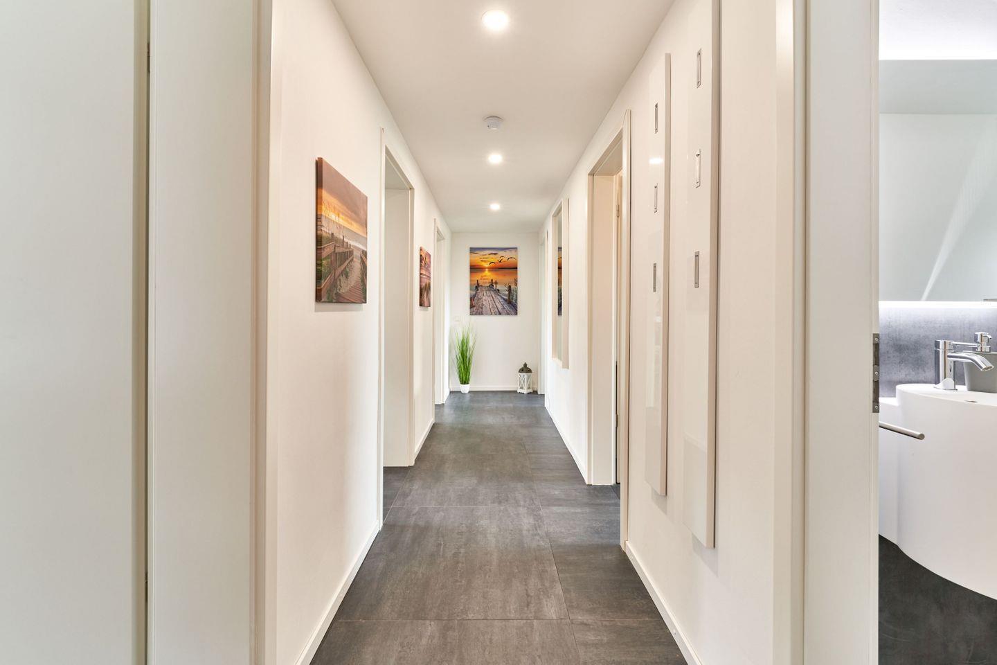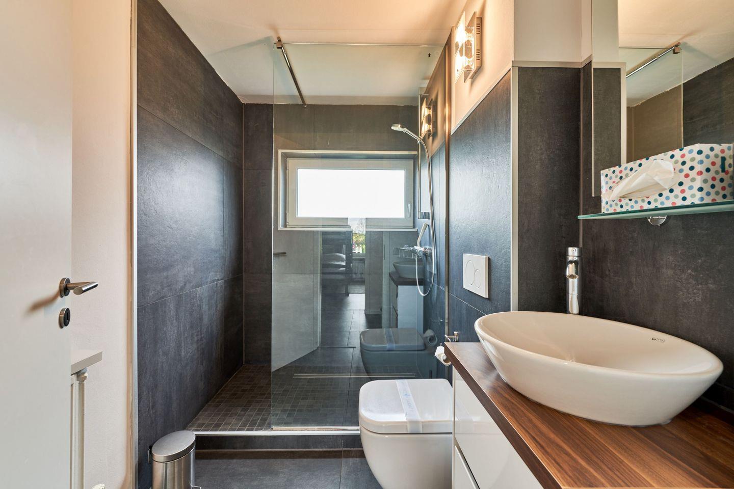 Das moderne Badezimmer ist mit einer bodentiefen Dusche ausgestattet und zusätzlich steht Ihnen ein separates Gäste WC zur Verfügung.