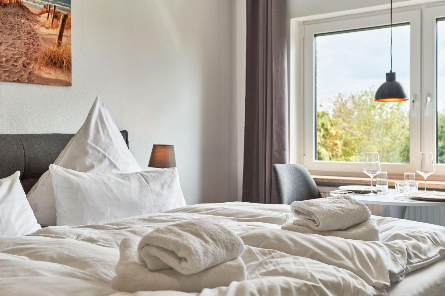 Nach einem ereignisreichen Strandtag finden Sie im komfortablen Boxspringbett (180x200cm) die benötigte Ruhe und einen erholsamen Schlaf. Bitte beachten Sie, dass Wäschepakete nicht enthalten sind, sie können jedoch optional hinzu gebucht werden.