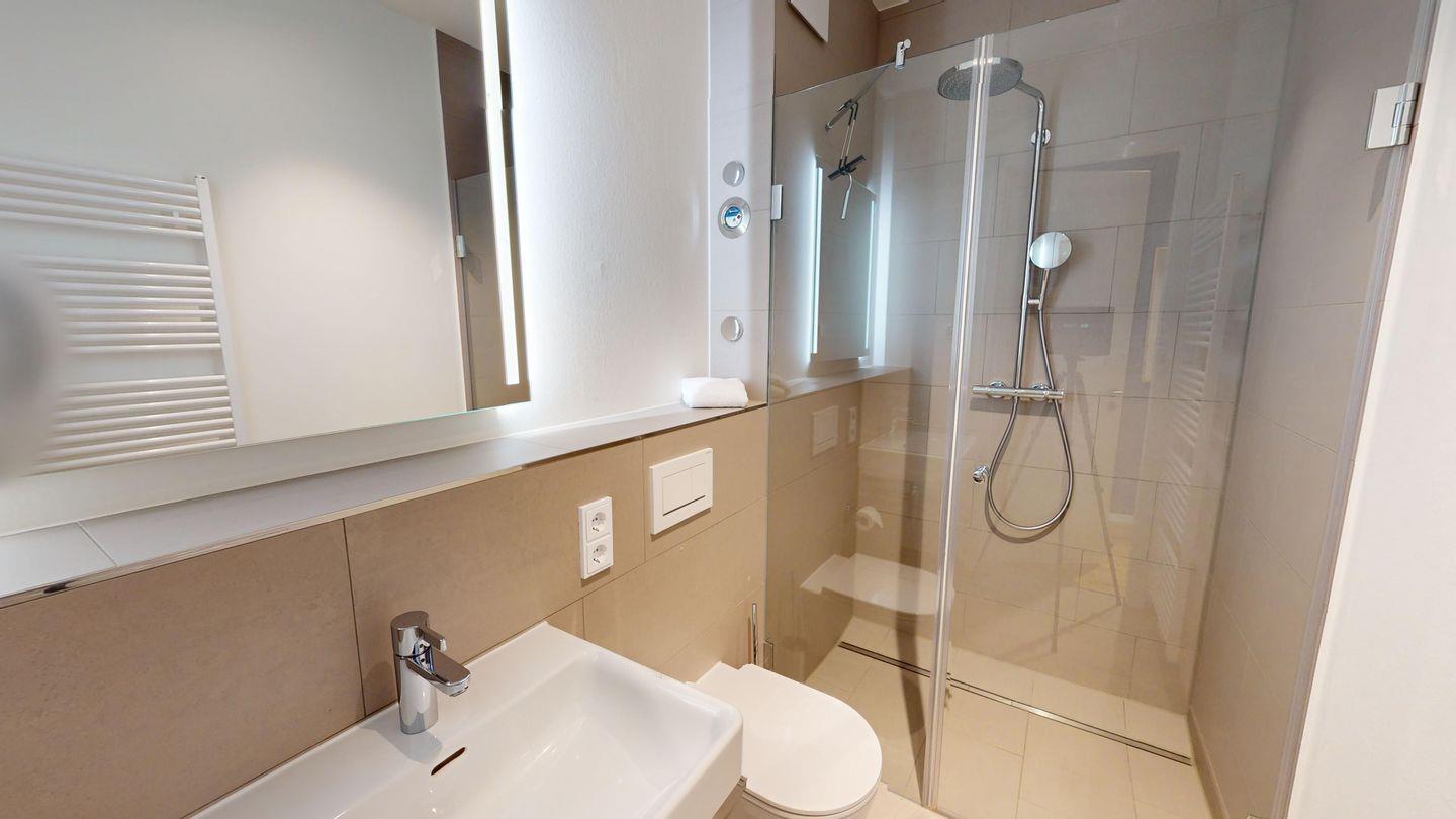 In dieser Wohnung gibt es zwei ruhige Schlafzimmer nach hinten gelegen, eins mit Doppelbett und eins mit Doppelbett und zusätzlichem Etagenbett. Besonders komfortabel sind die beiden Badezimmer, eines mit einer großzügigen Dusche und Badewanne sowie ein kleineres Gästebad mit Dusche.