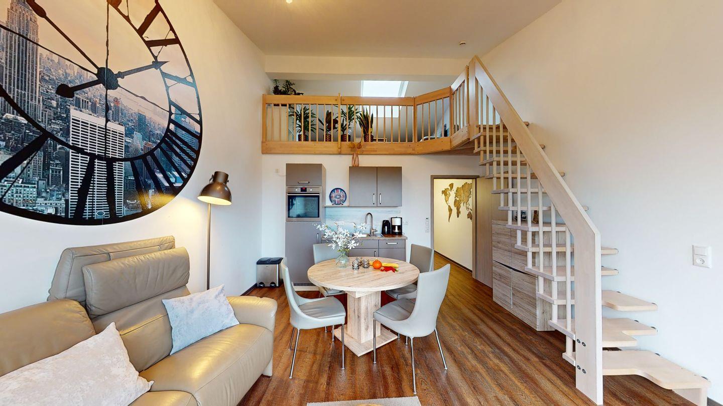 Liebevoll eingerichtet erwartet Sie ein gemütliches Urlaubszuhause mit einem hellen Wohn-/Essbereich mit offener und voll ausgestatteter Küche. Ein separates Schlafzimmer sowie das ausziehbare Schlafsofa auf der Galerie bieten Platz für zwei Erwachsene und 2 Kinder. Das moderne Duschbad befindet sich auf der unteren Ebene.
