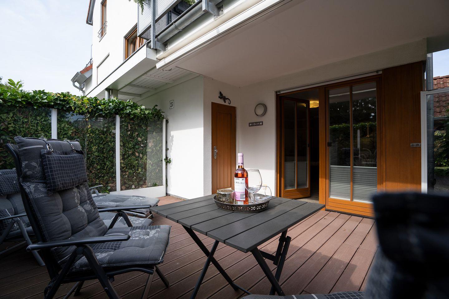 Herzlich Willkommen in der Ferienwohnung Solymar im Ostseebad Pelzerhaken! Die 55 qm große Erdgeschoßwohnung ist für 2 Personen und ggf. 1 Kleinkind (im Reisebett) ausgelegt. Die Wohnung ist mit viel Liebe zum Detail eingerichtet und Sie werden sich hier sicherlich wohlfühlen. Der Wohnbereich bietet Ihnen eine großzügige Ledercouch, einen gemütlichen Fernsehsessel, ein Flachbild-TV, Radio, einen gemütlichen Essplatz und eine, an das Wohnzimmer angrenzende, offene vollausgestattete Küche mit Geschirrspüler, Kühlschrank, Cerankochfeld und einen Minibackofen mit Heißluft. Das Schlafzimmer ist mit einem Doppelbett (1,60m x 2,00m) und einem großen Kleiderschrank ausgestattet. Das Bad ist modern und großzügig gestaltet. Es verfügt über eine bodentiefe Dusche, Handtuchtrockner, Föhn und einer Waschmaschine mit Trocknerfunktion (Waschtrockner). Bei den Bodenbelägen wurde in der gesamten Wohnung besonders viel Wert auf wohngesundheitliche Anforderungen und Hygienestandards gelegt. Weiterhin begeistert die Wohnung durch eine 20 qm große und nicht einsehbare Terrasse. Diese verwöhnt Sie fast den ganzen Tag mit viel Sonne. Die elektrische Markise spendet Ihnen Schatten. In dem angrenzenden Abstellraum auf der Terrasse finden Sie komfortable Liegestühle, Liegen sowie die dazugehörigen Auflagen. Weiterhin sind alle Fenster mit Außenrollos ausgestattet. Der Eigentümer der Ferienwohnung wird sich rechtzeitig vor Ihrer Anreise telefonisch oder per E-Mail mit Ihnen in Verbindung setzen, um den genauen Zeitpunkt Ihrer Anreise für die persönliche Begrüßung und Schlüsselübergabe mit Ihnen abzustimmen.
