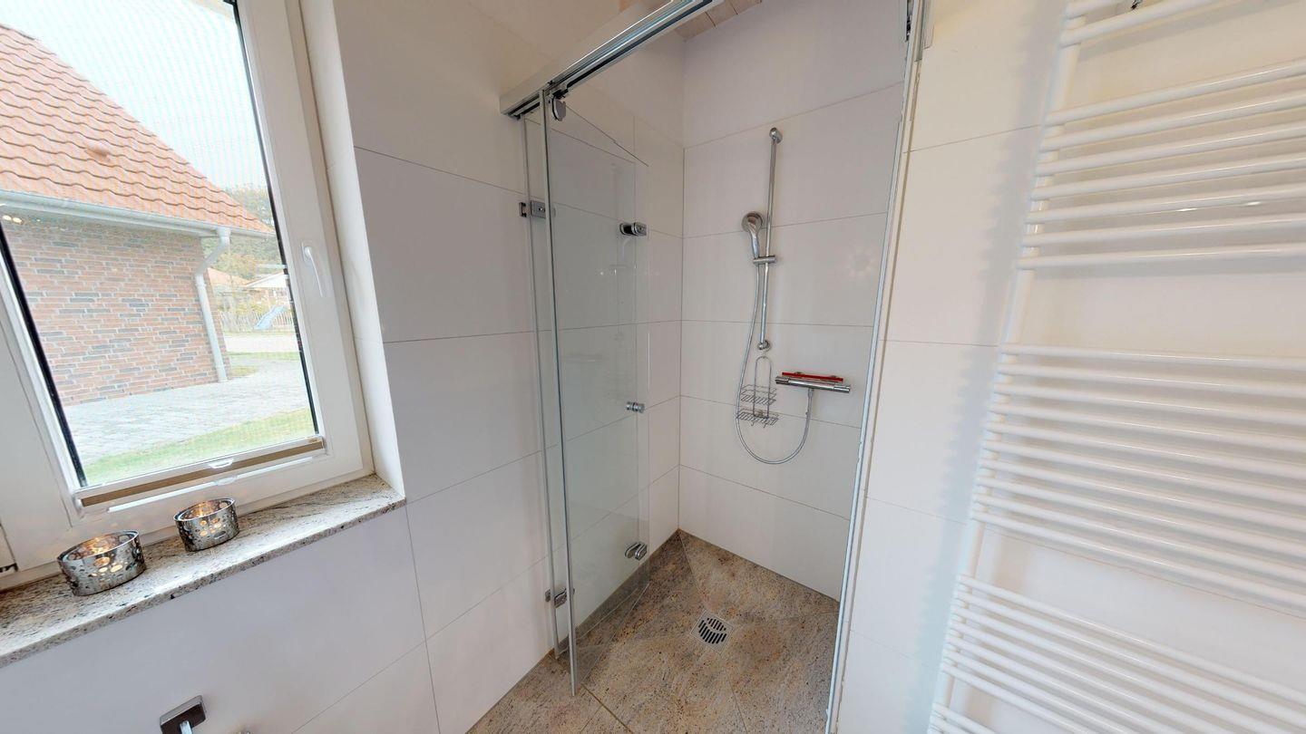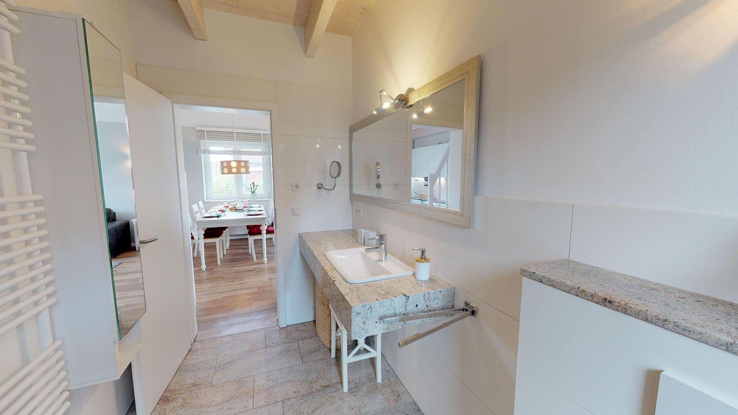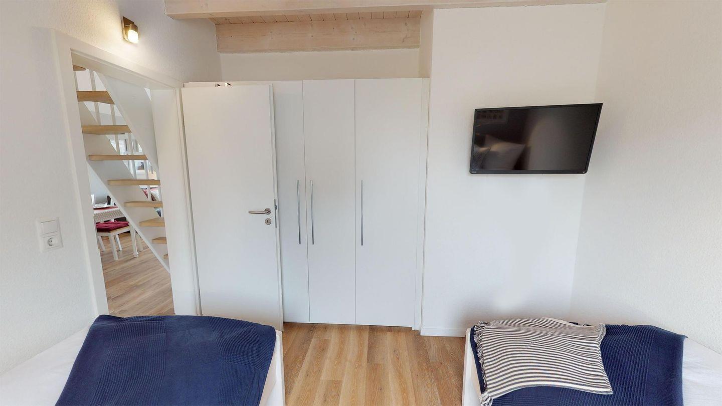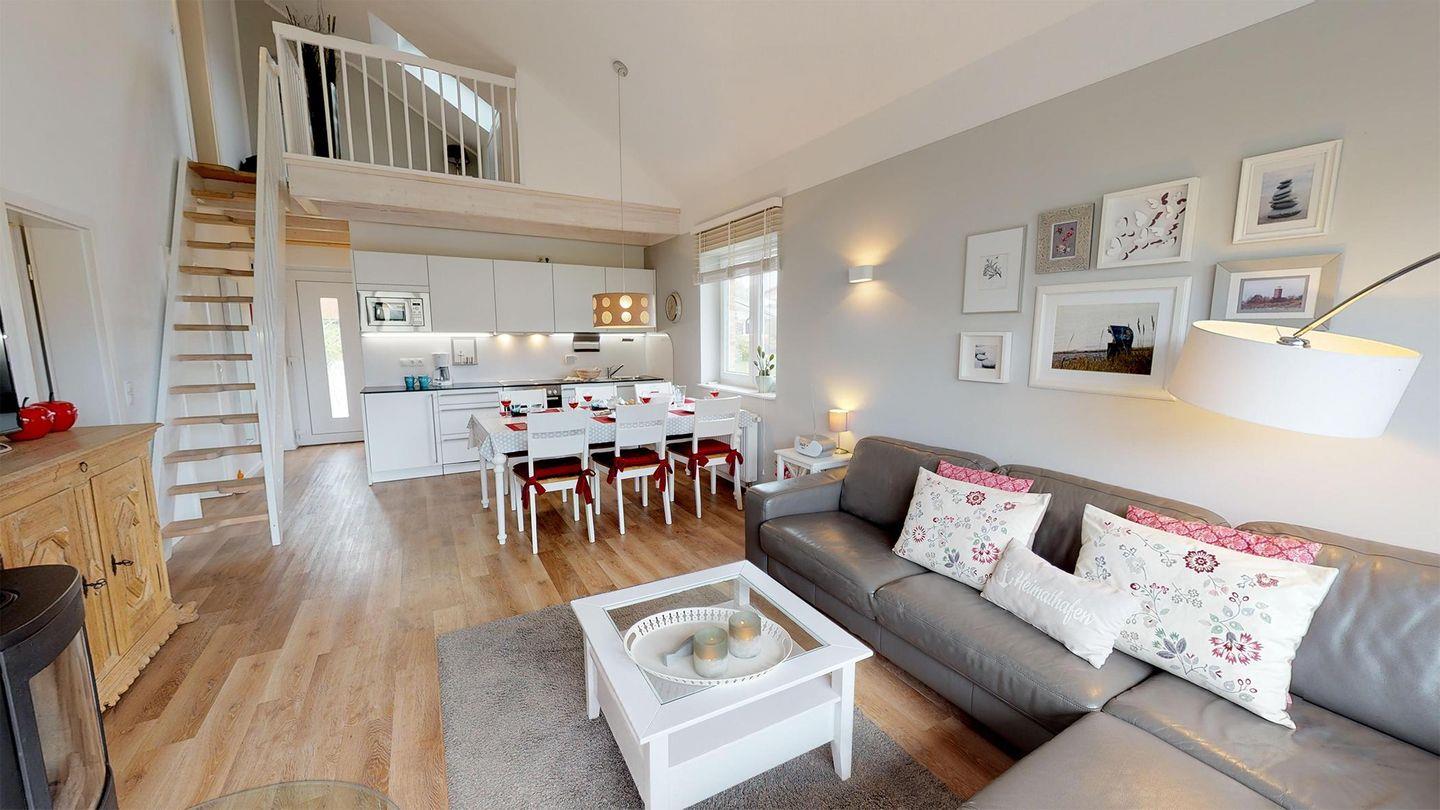 Das Erdgeschoss teilt sich in den Ess- und Wohnbereich mit Einbauküche, Esstisch, Sofa, TV und Kaminofen auf. Daran grenzen zwei Schlafzimmer (einmal mit Doppelbett, einmal mit zwei Einzelbetten) und ein Duschbad. Ein Gäste-WC ist ebenfalls vorhanden. Auf der Empore des Dachgeschosses finden Sie vor dem Kinderzimmer mit zwei Einzelbetten, Babybett und TV eine kleine, gemütliche Leseecke.
