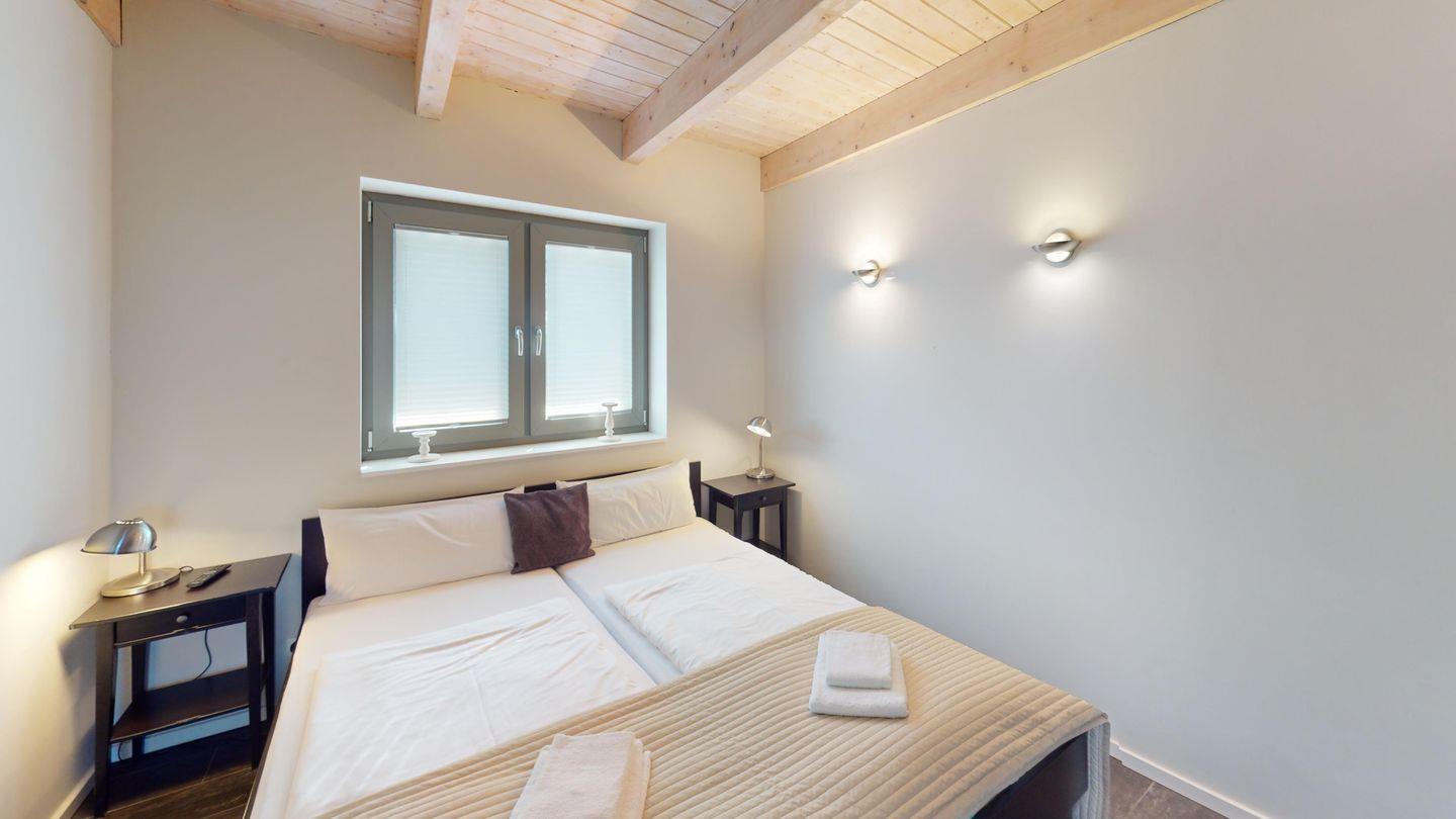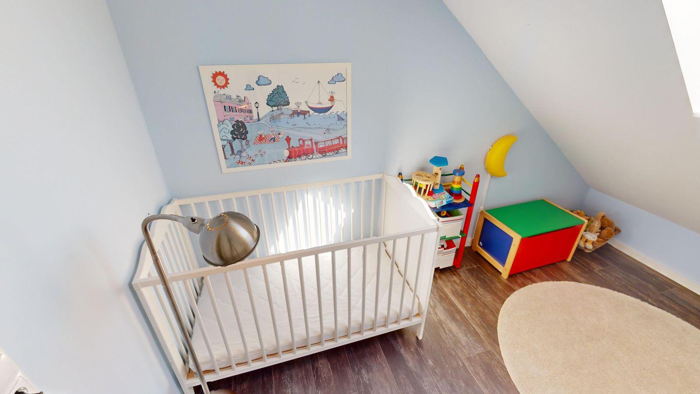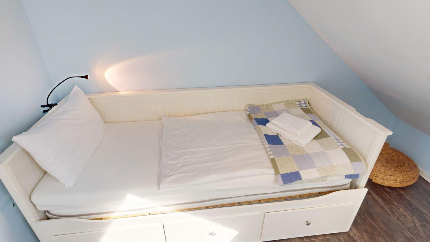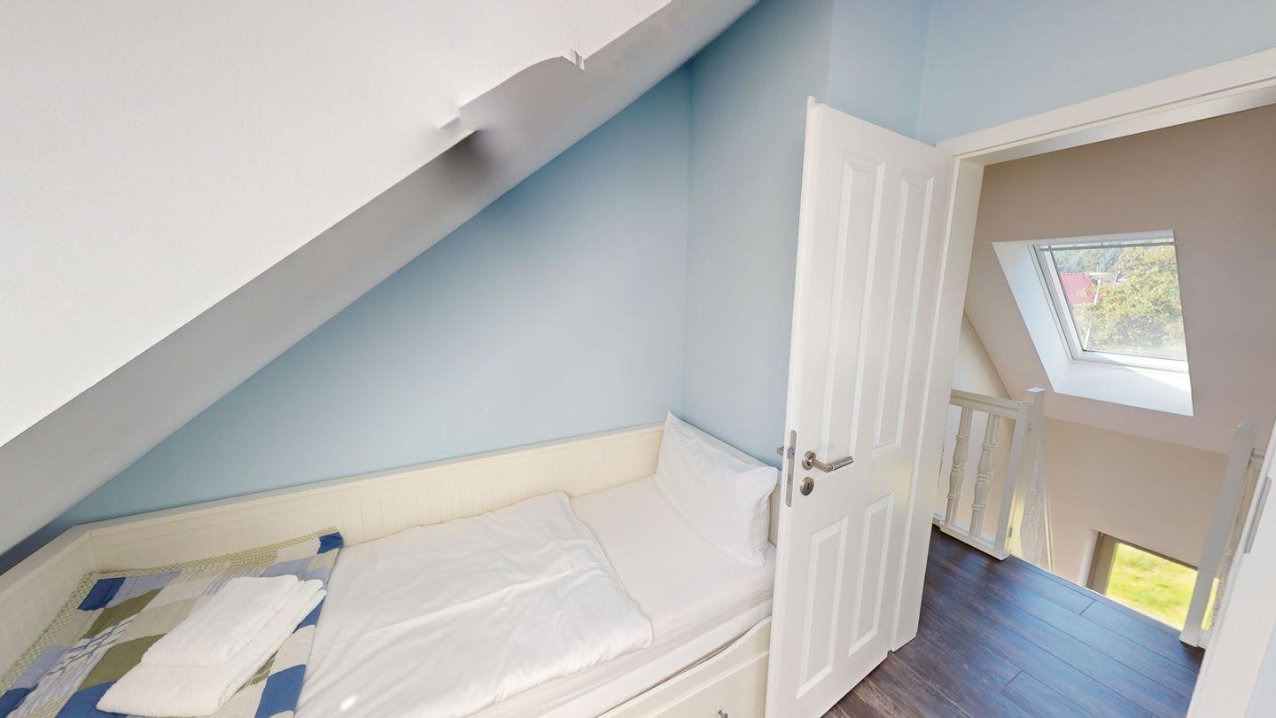 Das Obergeschoss ist ideal für Kinder. Es gibt zwei Schlafzimmer mit jeweils einem Einzelbett, eines davon zusätzlich mit einem Babybett. In der oberen Etage steht außerdem ein WC zur Verfügung.
