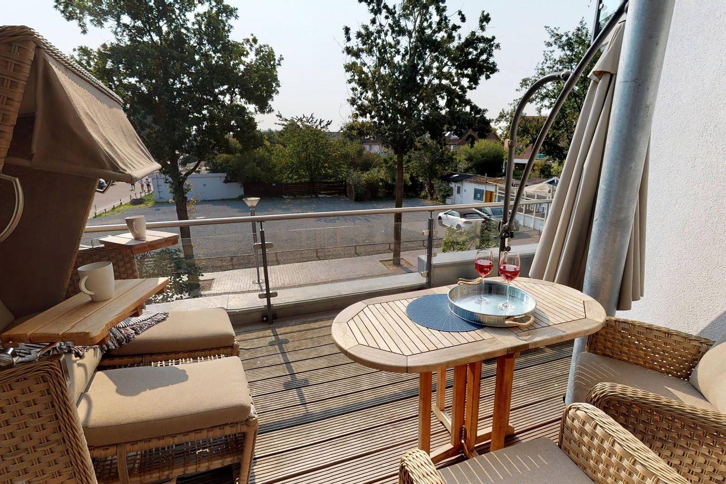 Ein absolutes Highlight ist der großzügige Balkon mit einem luxuriösen Strandkorb und einer elektrischen Markise. Genießen Sie hier den traumhaften Blick auf die Ostsee und lassen Sie sich von der Meeresbrise verzaubern! Zusätzlich steht Ihnen eine zweite Terrasse zur Verfügung – perfekt, um die Nachmittagssonne zu genießen oder Ihre Strandutensilien sicher zu verstauen.