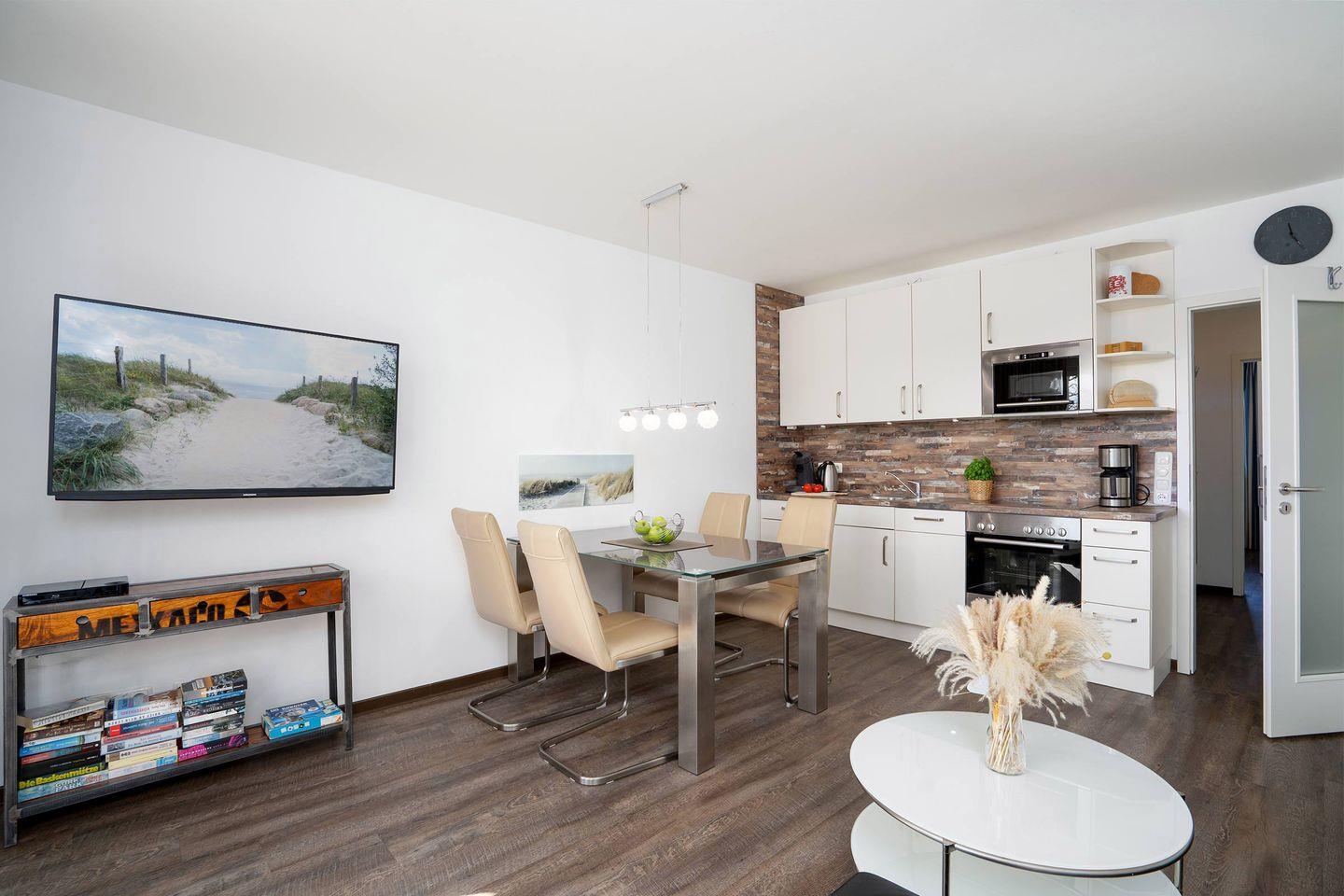 Der offene Wohnbereich mit einer erstklassig ausgestatteten Küchenzeile und einem stilvollen Essbereich lädt zum gemeinsamen Genießen ein. Die gemütliche Couch verwandelt sich im Handumdrehen in eine komfortable Schlafmöglichkeit für eine Person. Für höchsten Wohnkomfort sorgt die Fußbodenheizung in der gesamten Wohnung. Zudem erwartet Sie ein separates Schlafzimmer mit Doppelbett sowie ein modernes Duschbad – perfekt für erholsame Nächte.