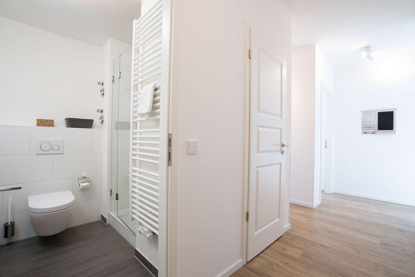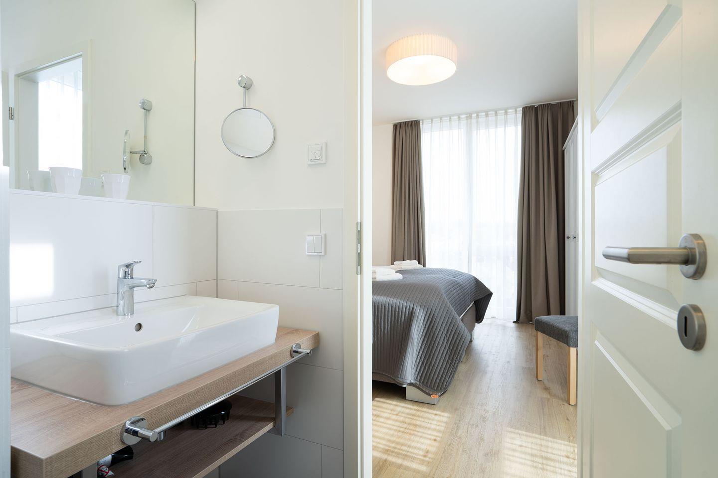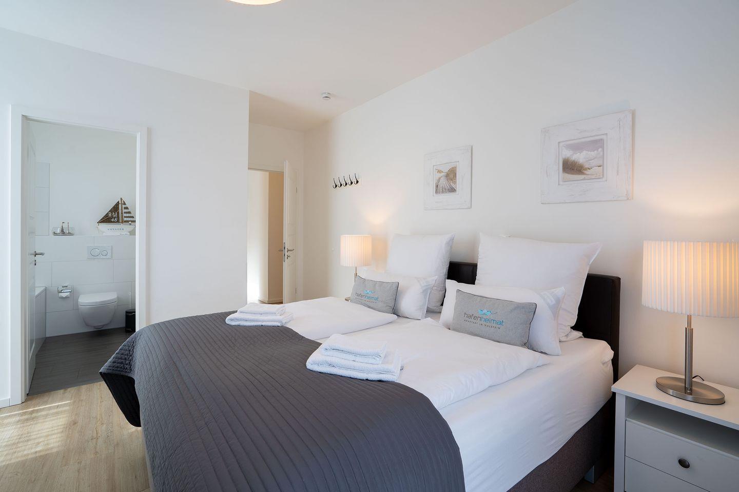 Des Weiteren verfügt das Apartment über zwei Schlafzimmer, jeweils mit einem komfortablen Boxspring-Doppelbett ausgestattet. Eines der Schlafzimmer bietet Zugang zum Vollbad, während ein weiteres Duschbad über den Wohnungsflur erreichbar ist.