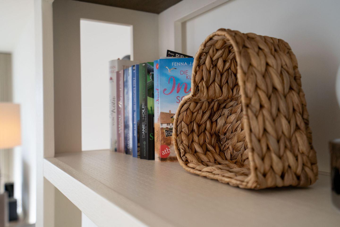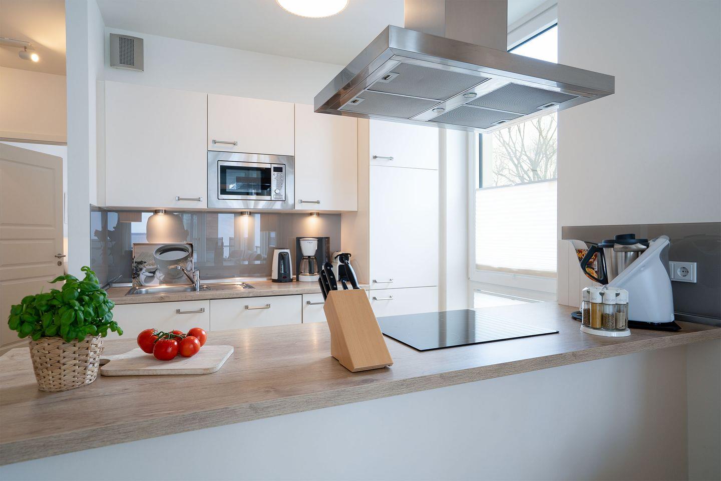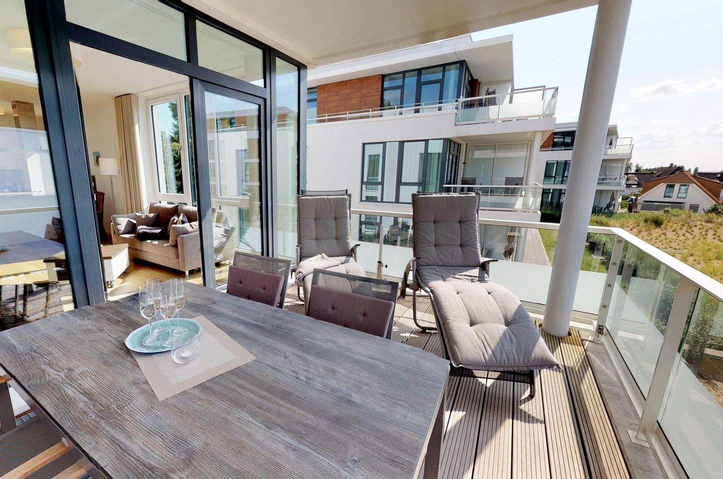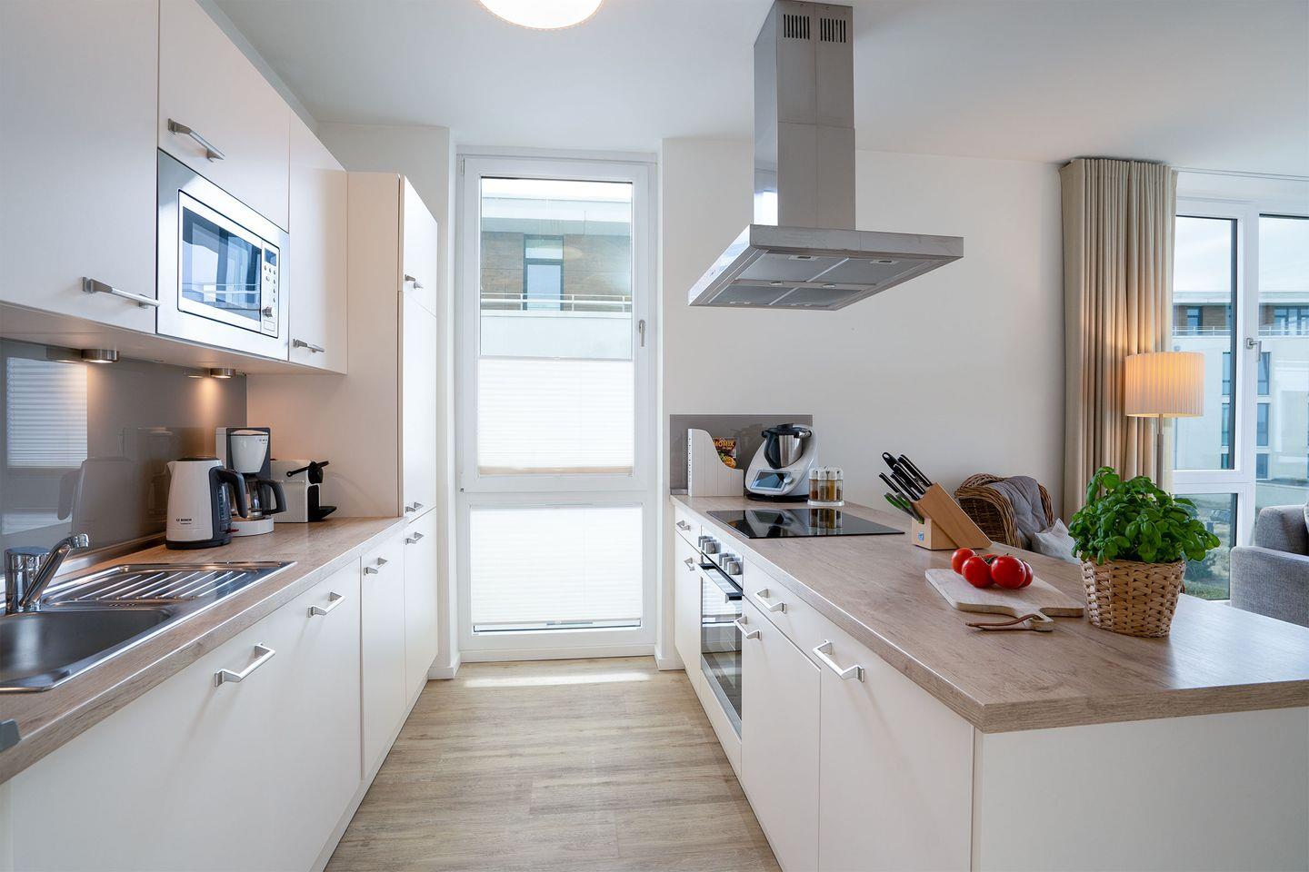 Das Apartment bietet ein großes und lichtdurchflutetes Wohnzimmer mit offener Küche und moderner, maritimer Einrichtung. Die Küche ist voll ausgestattet und sogar ein Thermomix steht für Sie bereit! Durch die teilweise umlaufende Fensterfront genießen Sie einen einmaligen Ostseeblick, der lediglich durch die vordere Gebäudereihe etwas eingeschränkt ist.