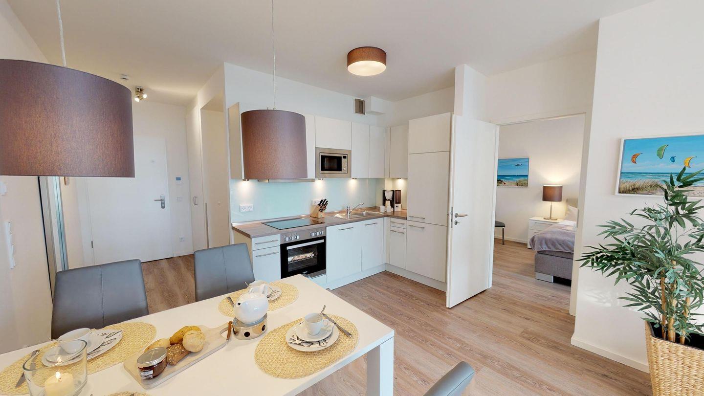 Das Apartment bietet lichtdurchflutete Räume und einen unglaublich schönen Meerblick. Über den Flur gelangen Sie linkerhand in das moderne Badezimmer mit Badewanne und Dusche. Zurück über den Flur erreichen Sie das große Wohnzimmer mit offener Küche und Essbereich. Hier können Sie den Ostseeblick vom Sofa aus genießen oder gemütliche Fernsehabende verbringen. Vom Wohnzimmer aus gelangen Sie in das Schlafzimmer mit großem Boxspringbett, Kleiderschrank und einem weiteren Fernseher. Direkt vom Schlafzimmer und auch vom Wohnzimmer aus haben Sie Zugang zum geräumigen Balkon, ausgestattet mit einem Tisch, vier Stühlen und einer Sonnenliege – perfekt, um die frische Ostseeluft zu genießen.