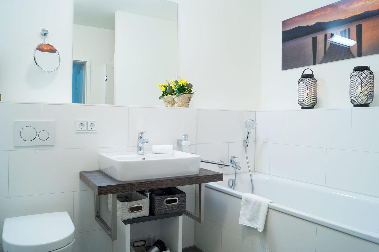 Entspannen Sie im gemütlichen Wohnzimmer auf dem Sofa bei einem schönen Film. Das Sofa bietet Schlafmöglichkeiten für zwei Personen. Angrenzend an das Wohnzimmer finden Sie einen Essbereich sowie eine offene, gut ausgestattete Küchenzeile. Des Weiteren gibt es ein modernes Badezimmer mit Dusche und Badewanne sowie ein Schlafzimmer mit einem Boxspring-Doppelbett.