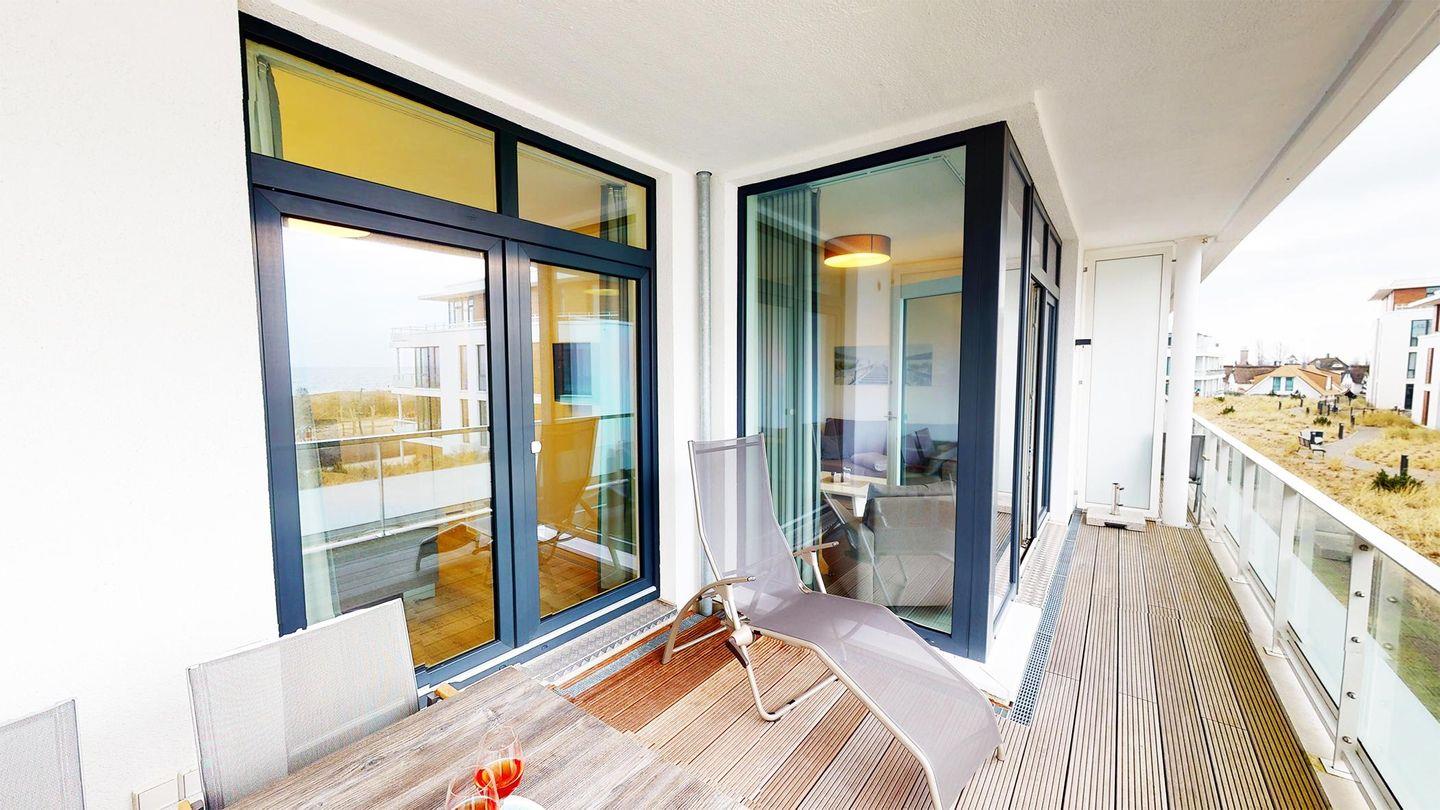 Den Balkon mit Meerblick erreichen Sie sowohl vom Schlafzimmer als auch vom Wohnzimmer aus. Bequeme Balkonmöbel laden zum gemütlichen Beisammensein ein.