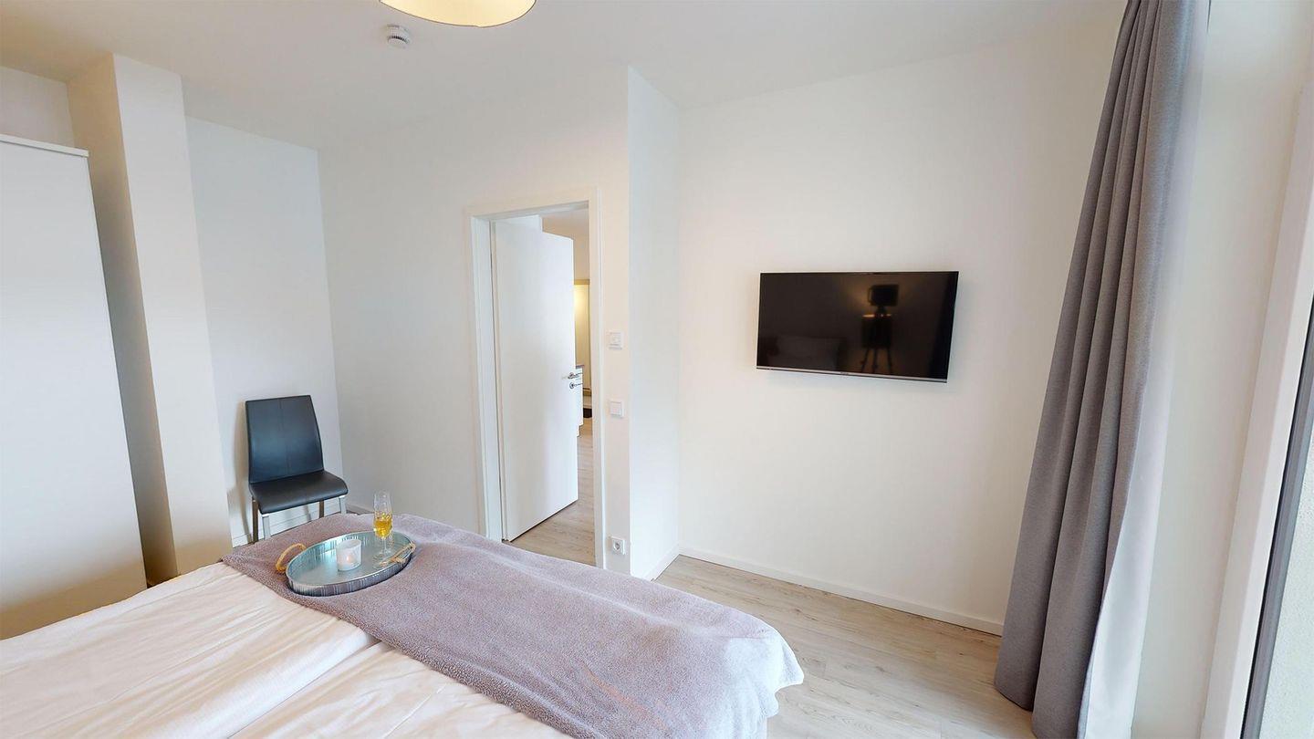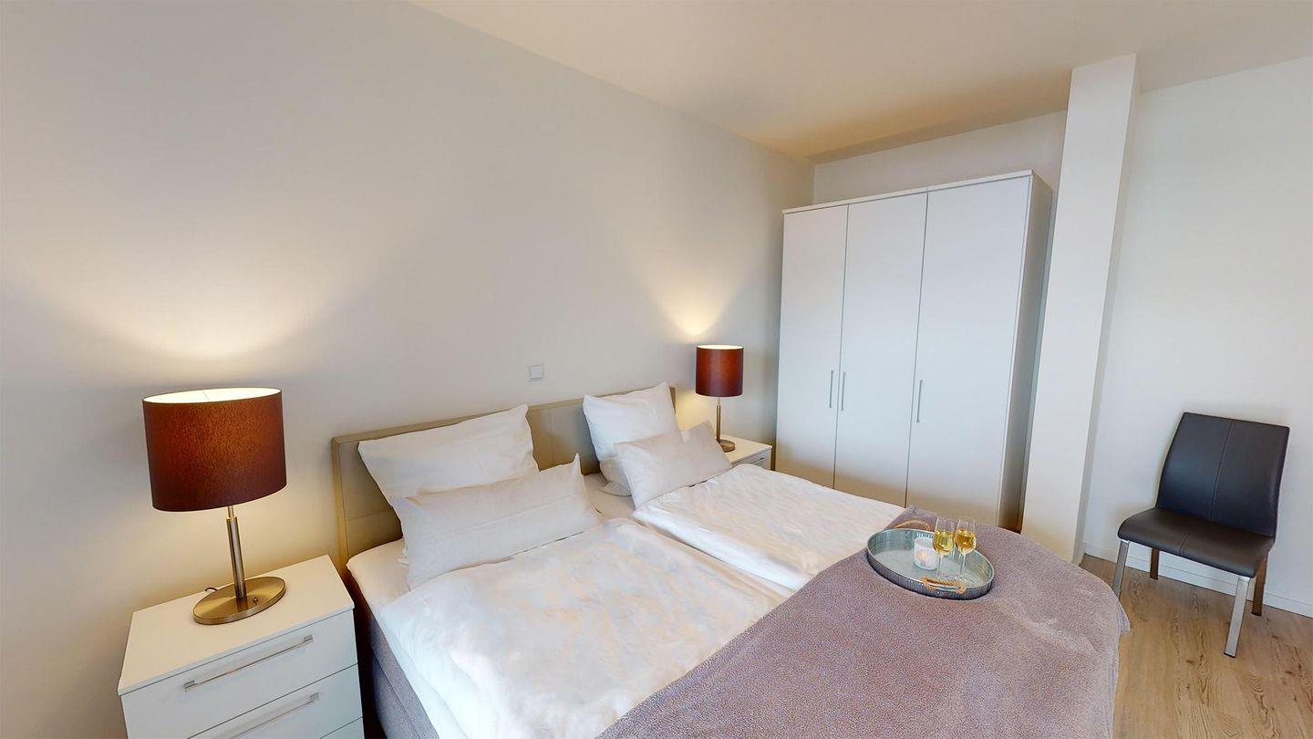 Das Apartment erwartet Sie mit einem lichtdurchfluteten Wohnbereich, einer gemütlichen Essecke und einer offenen, voll ausgestatteten Einbauküche. Das komfortable Sofa kann als Schlafmöglichkeit für zwei Personen genutzt werden, und Sie können dabei den Meerblick aus der Fensterfront genießen. Weiterhin verfügt das Apartment über ein Bad mit Badewanne und Dusche. Abgerundet wird es durch das Schlafzimmer mit einem Boxspring-Doppelbett.