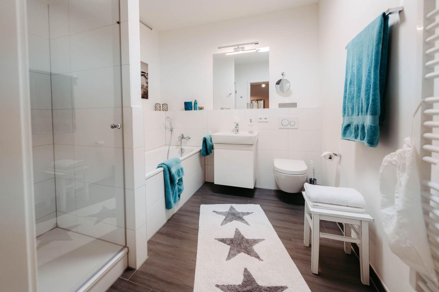 Verweilen Sie im lichtdurchfluteten Wohnzimmer auf dem Sofa oder genießen Sie den Meerblick aus der Fensterfront. Das Sofa bietet eine weitere Schlafmöglichkeiten für zwei Personen. Angrenzend an das Wohnzimmer finden Sie einen Essbereich sowie eine offene, gut ausgestattete Küchenzeile mit einer Nespresso-Maschine. Des Weiteren gibt es ein modernes Badezimmer mit Dusche und Badewanne sowie ein Schlafzimmer mit einem Boxspring-Doppelbett.